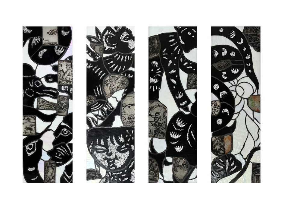 Artwork description: 将儿时爷爷编写讲述的故事呈现在玻璃中,把这些故事定在一段时间里。运用剪纸元素,将其去面而留线的侧重与玻璃镶嵌块面间的拼贴侧重相碰撞,意在搜取已存在的不同时间空间的元素进行拼凑主客观相合再叙故事。玻璃块面赋予了剪纸镂空处新的生命活力,寓意将故事再创作,进行联想延伸,原先的故事已记不清楚,讲故事的人也已逝去,虽只有模糊的故事概念,但故事走向如何发展由当下创作人的联想而定,任何角度皆可延续。