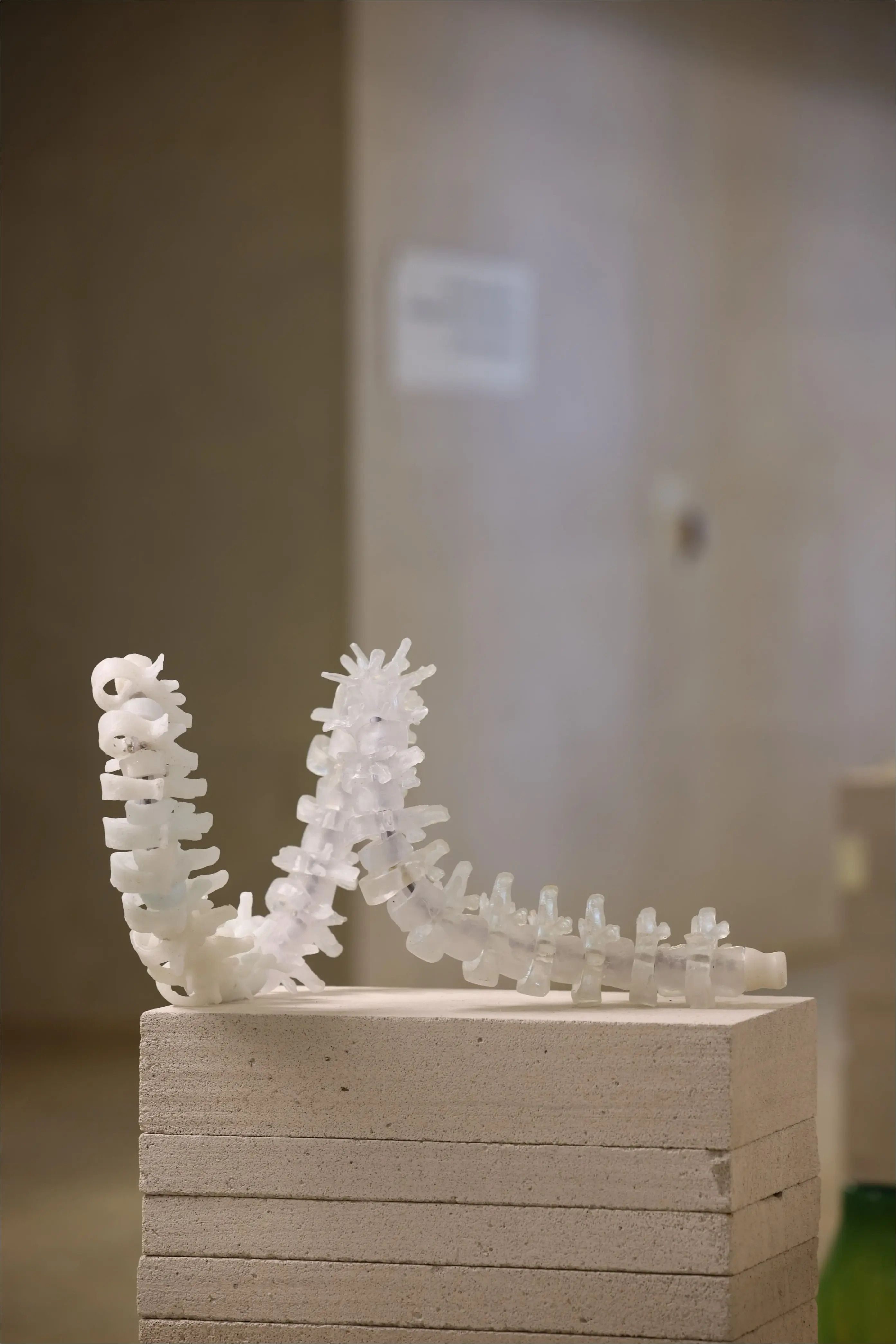 Artwork description: This spine sculpture features two distinct vertebrae designs, each carefully sculpted to interact harmoniously and echo the human spinal structure. With approximately 180 vertebrae replicated and assembled, the piece extends to about 1.20 meters. It is mounted on a soft, flexible material that allows the vertebrae to transform their shape dynamically. When interacting with the flexible base, the spine creates ethereal, glass-like sounds from the delicate collisions between the vertebrae.