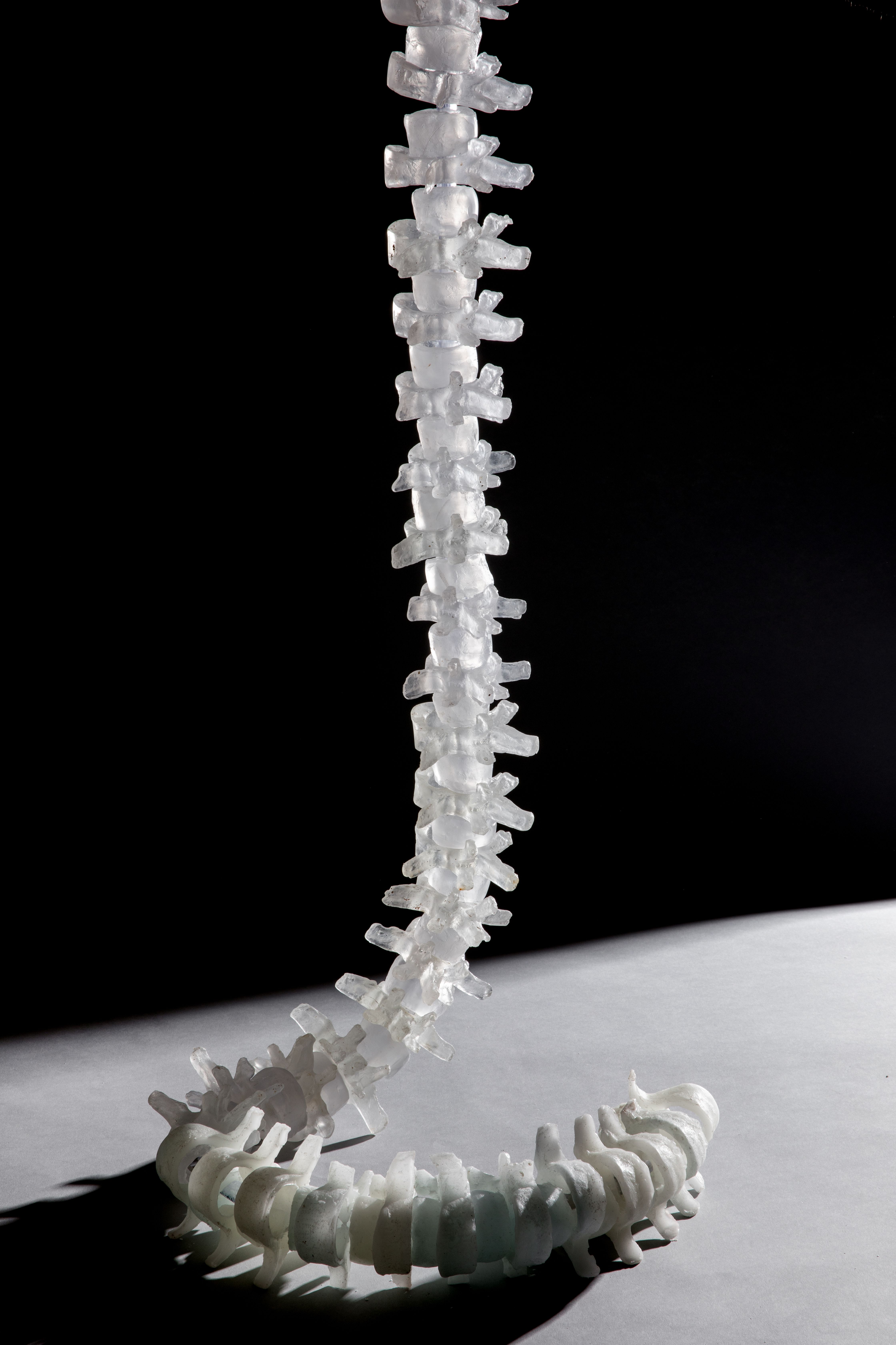 Displayed in both flexible and rigid forms, this sculpture invites viewers to explore the intriguing contrast between fluid adaptability and structural rigidity, with the vertebrae arranged like a series of beads strung onto an intermediary material.