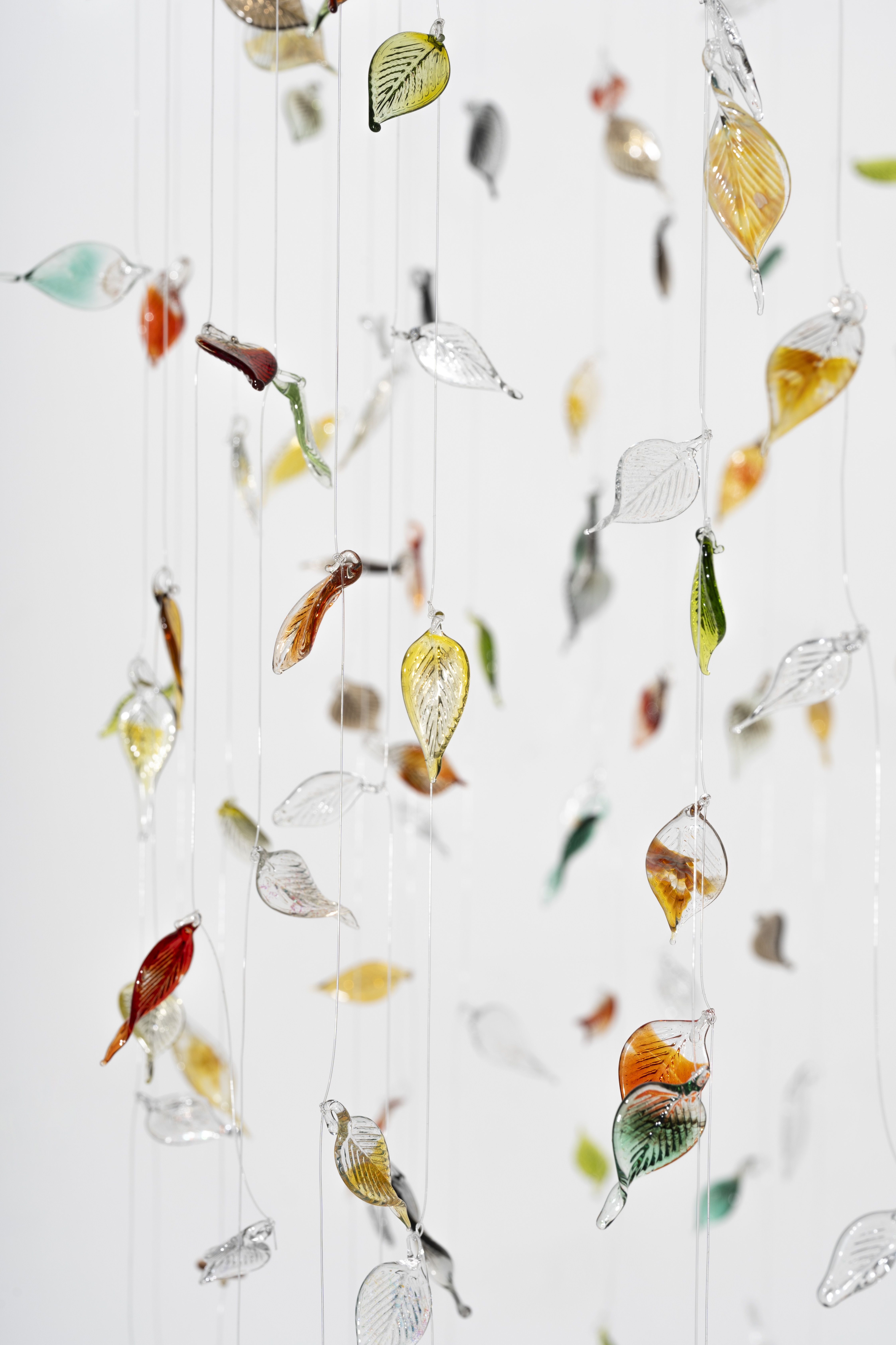 Artwork description: 1000 Fleeting Moments is a meditation on time and presence. The endless cycle of death and renewal in nature inspired me to find a way to capture and hold time, to transmit for the audience the flow state that I experience while making. Made from one thousand flame-formed glass leaves suspended in layered lines, the work hovers delicately in space, catching light and shadow as it subtly shifts with the air, inviting viewers into a state of quiet contemplation. Its shimmering surface resists permanence, reminding us of the fluidity of time and reality. Each individual leaf is unique, and although small, has a powerful resonance in the collective. Together, they speak to the flow of countless instants that shape our lived reality. 1000 Fleeting Moments offers a reminder of the transformative power of being fully present, and the impact of collective collaboration.