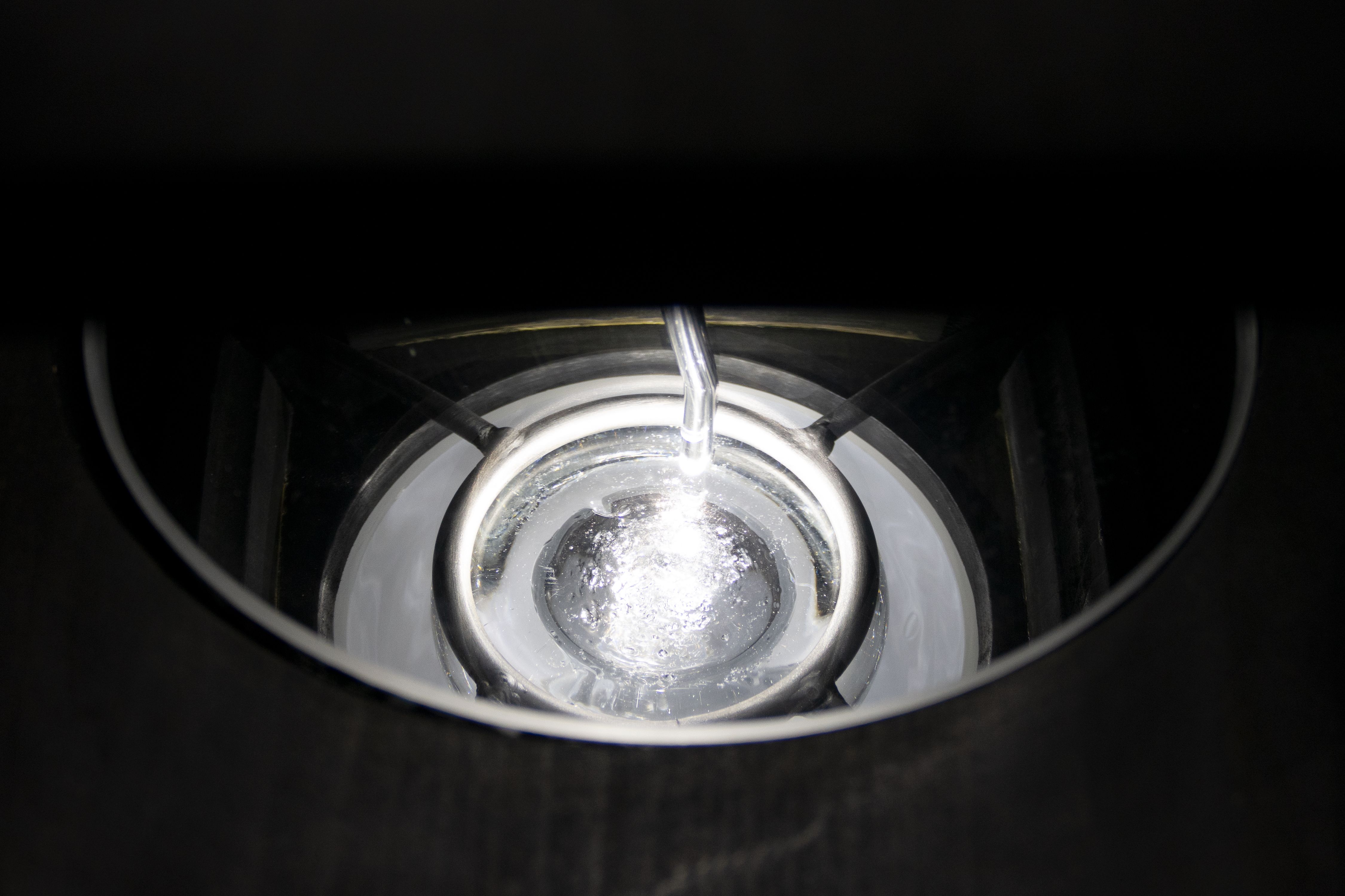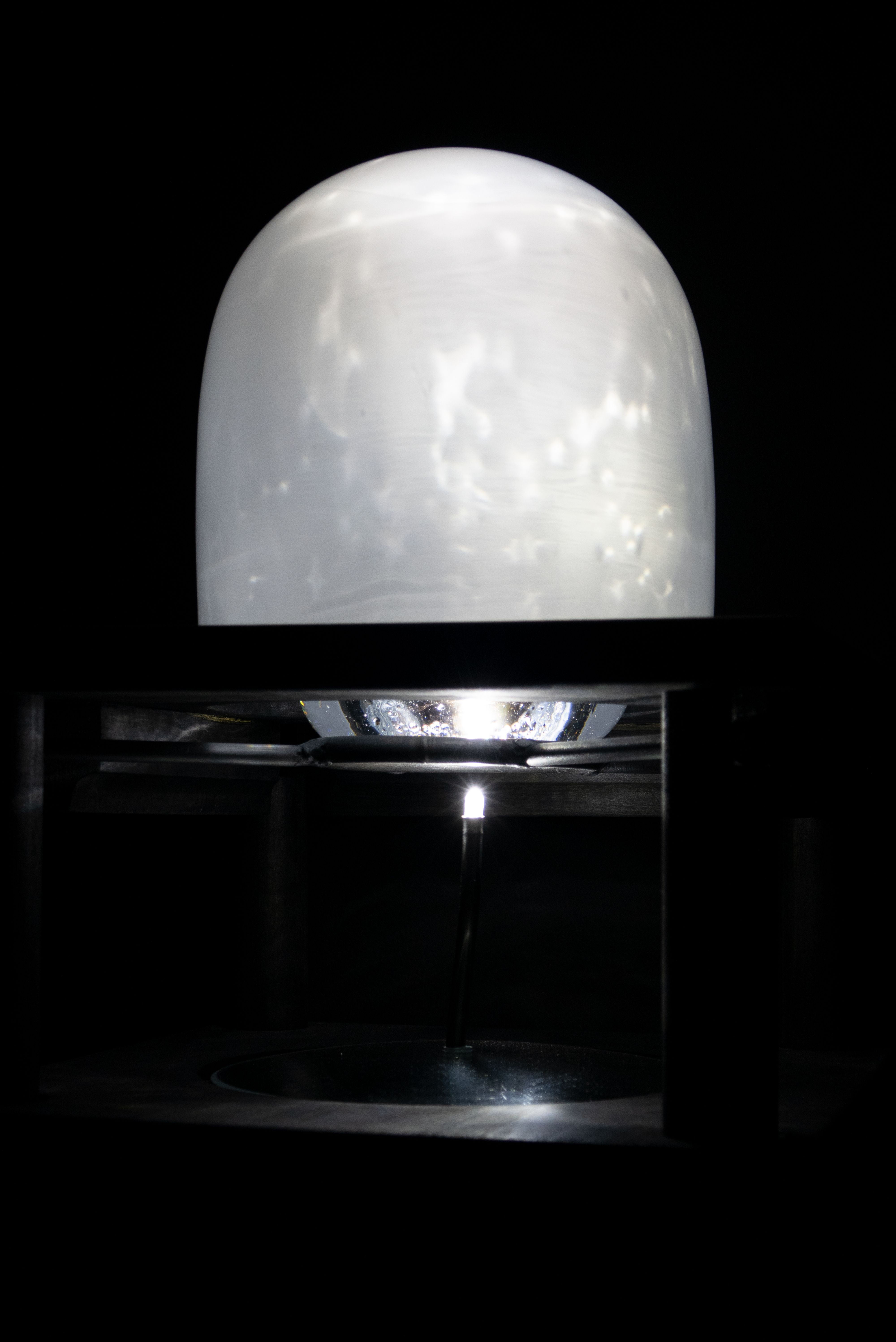Experimenting with the Rupert’s Drop, I see the similarity between the disintegration of a glass droplet and the explosion of the universe. Through glass-blowing processes, I captured the aftermath of the disintegration inside an orb which then became a lens. A slowly spinning light creates a projection through the orb. The irregular texture of the glass results in constantly changing cosmic imagery, which is carried by the blown glass dome and the resulting caustic reflections. The mechanism of the system is revealed (if one looks close enough) by the convex mirror underneath.