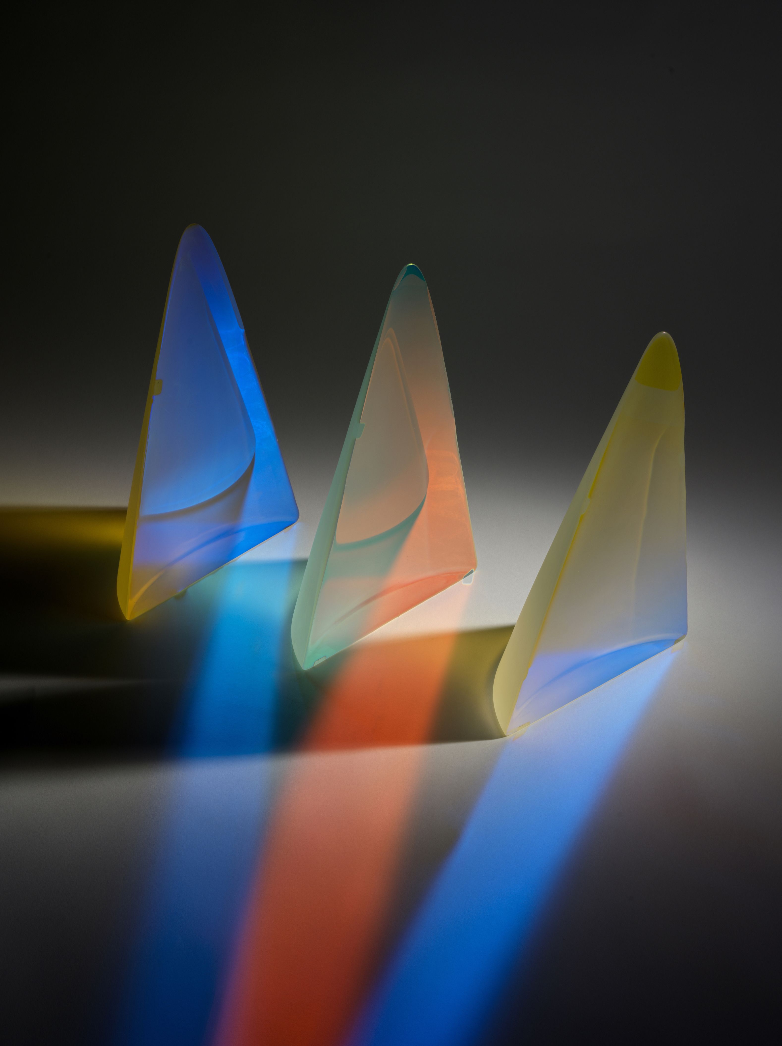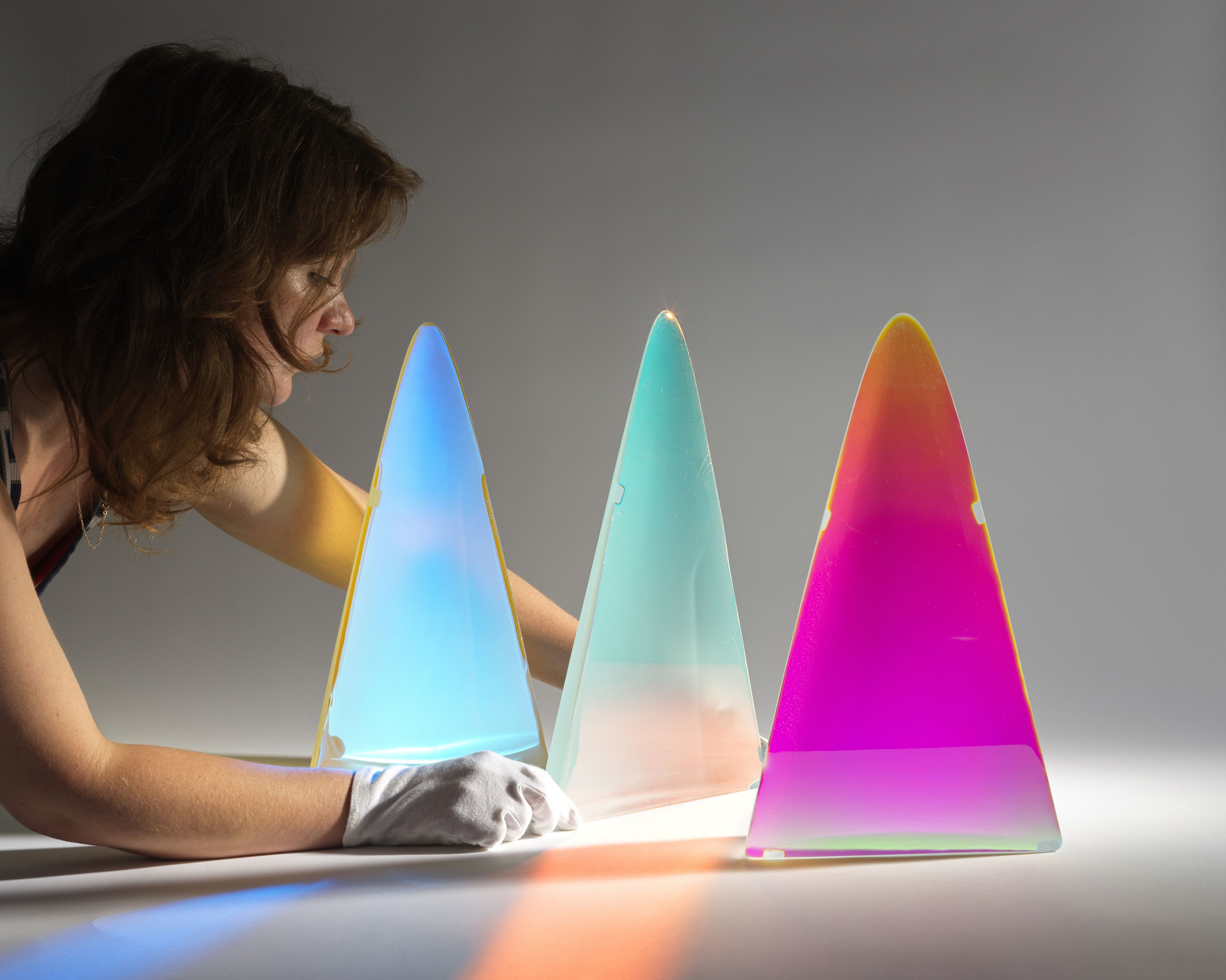 Artwork description: ‘Additive’ – is a tryptic of 3 solid glass half cones, on each flat surface respectively coloured Yellow/Blue, Cyan/ Dark Red and Magenta / Green. Inspired by the question ‘does colour exist in the mind or the world?’ its form represents the cones in our eyes, which are the basis of our colour perception. Additive’ examines the colour of light, as it displays colour by breaking the light spectrum.Working with a company that produces Dichroic glass (derived from the Greek words “di” for two, and “chroma” for colour) sheet material for the Creative Industry, I negotiated with them to use their industrial equipment to coat the 3 glass sculptures.” ‘By applying a dichoric coating to the flat surface, the colours displayed are through the breakdown of light spectrum rather than any pigmentation of the glass. As the viewer interacts with the work, the colours shift and change allowing them to speculate about where colour lies.