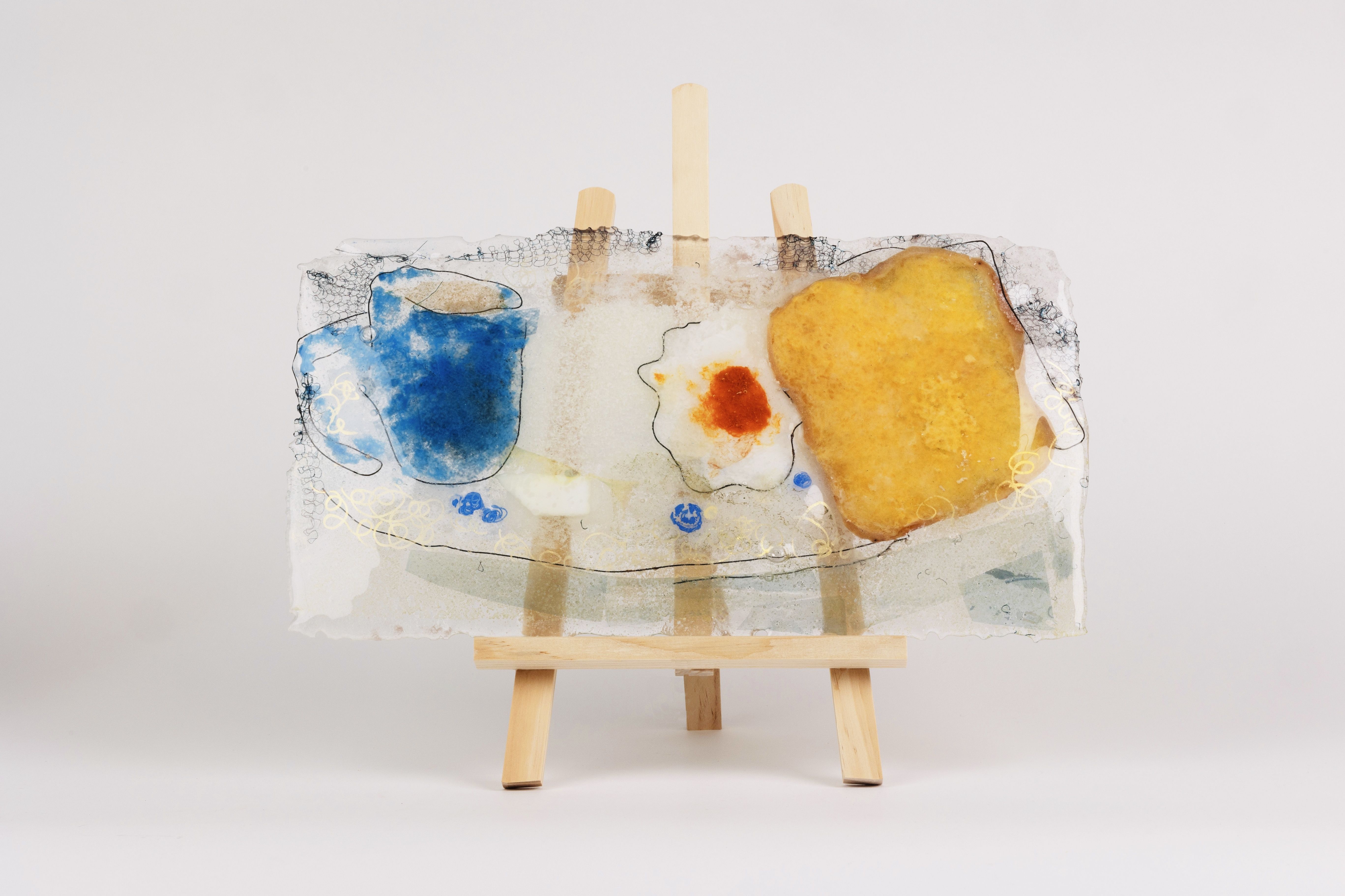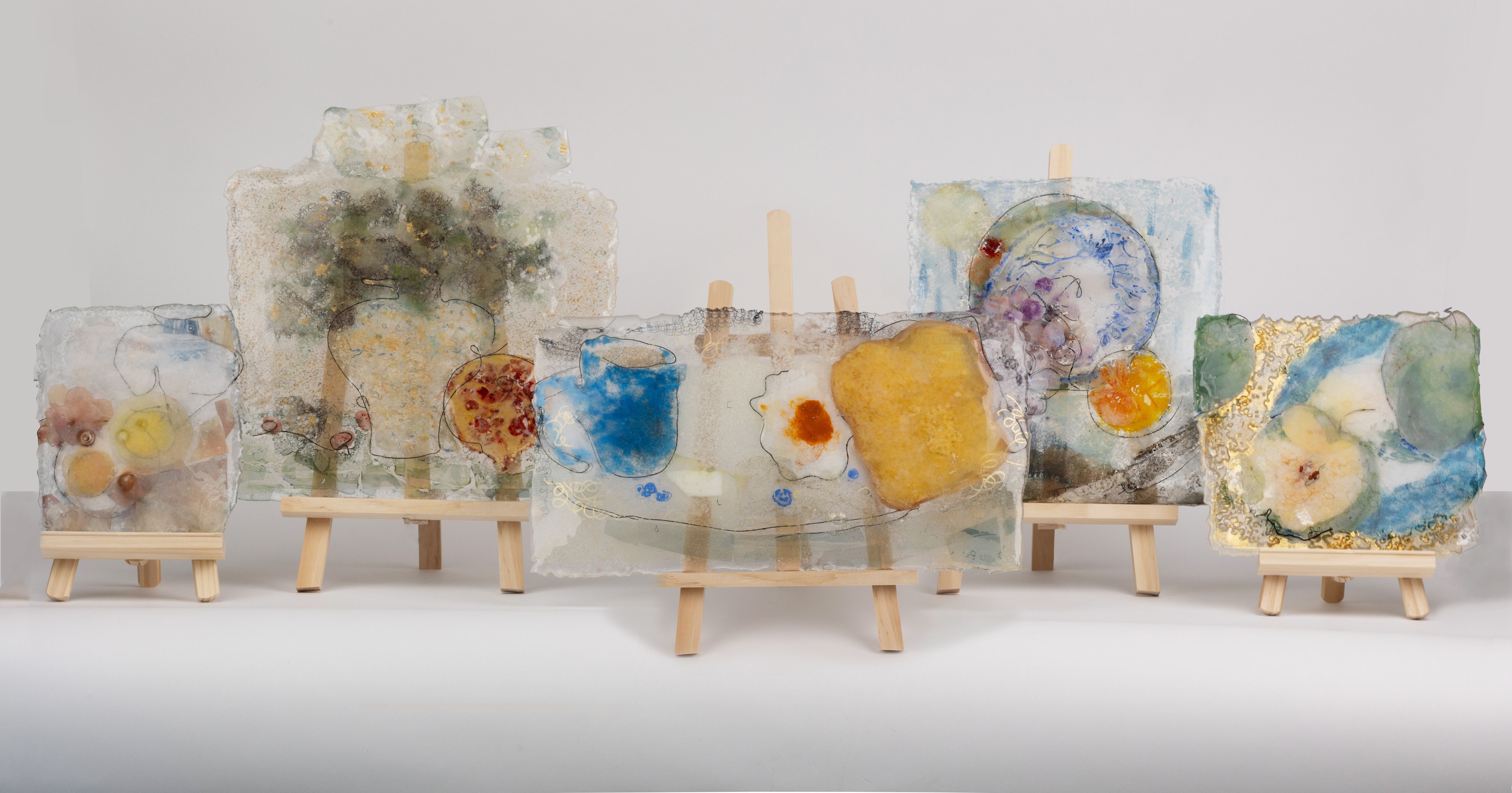 Artwork description: After-School Still Life revisits the repetitive structure of extracurricular art training in China, where still life subjects such as apples, bottles, and plaster busts functioned as symbols of discipline and conformity. Dou reinterprets these familiar forms through kiln-formed glass, layering texture and visual depth by manipulating thickness and transparency. Rather than painting or printing directly onto the surface, she allows patterns and colors to emerge from within the glass, creating images that appear suspended in space.