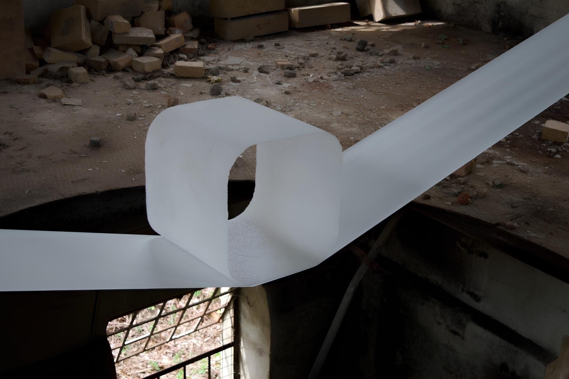 At the very core of the work lies the tension between two materials—glass and paper. A suspended long strip of paper is weighted by a cuboid object made of glass. They are alike yet different in their strength, flexibility, structure, color, translucency, and visual perception. Together, they form a unique installation in which they complement one another, balancing on the edge of their possibilities and becoming mutually essential. The site-specific installation of these noble and pure materials evokes feelings of uncertainty, tension, and even fear. The composition works with the weight and form of glass in contrast to the pliable strip of thin paper. The glass object, created using the demanding craft technique of pâte de verre, remains constant in each installation, while the paper, produced by modern industrial technology, adapts in its length and angle of suspension to each specific space.