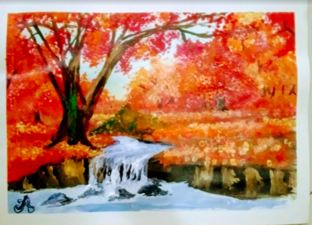 Capture the vibrant beauty of autumn with this stunning acrylic painting. Rich reds and oranges blaze across the canvas, depicting a forest of trees in all their fall glory.
