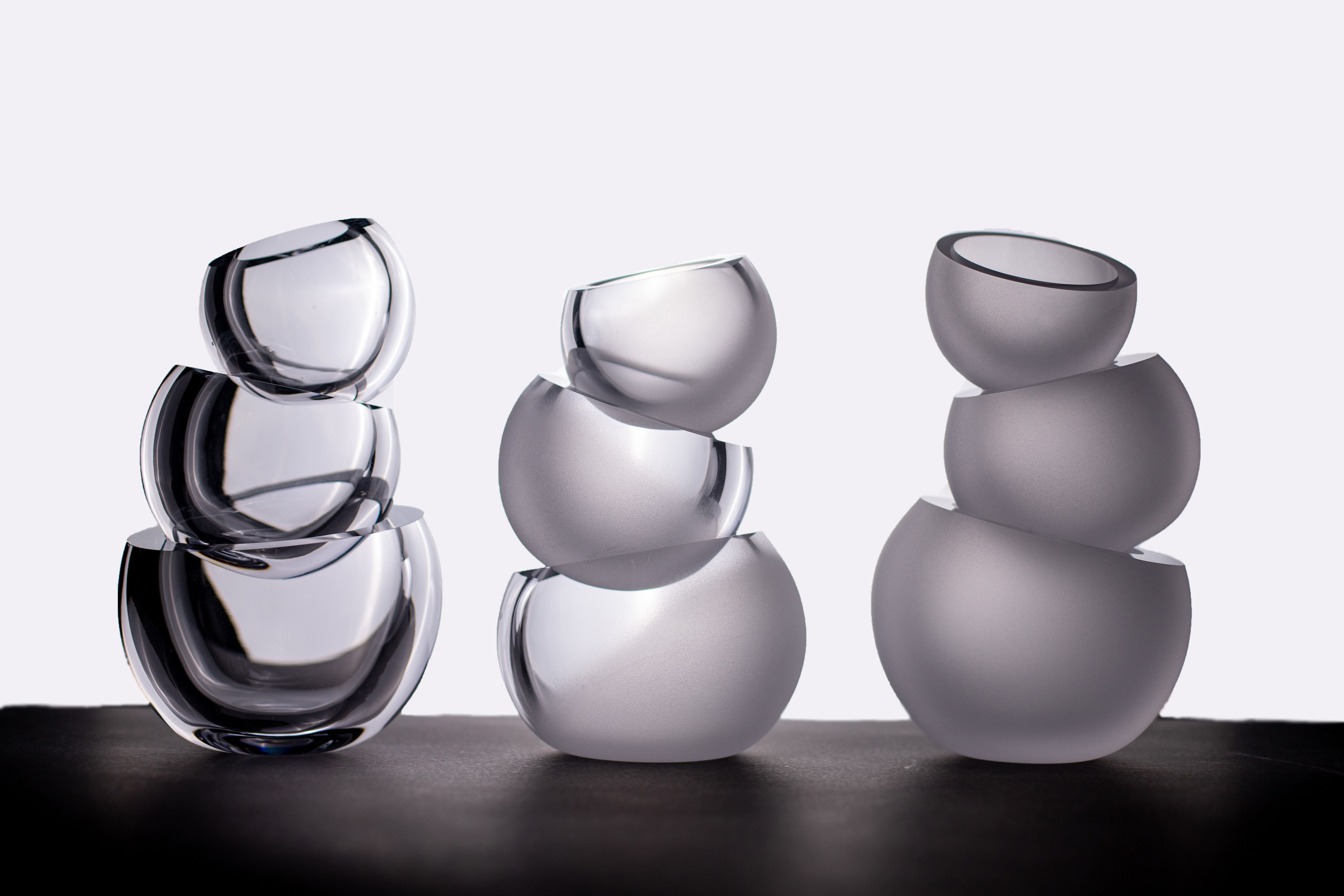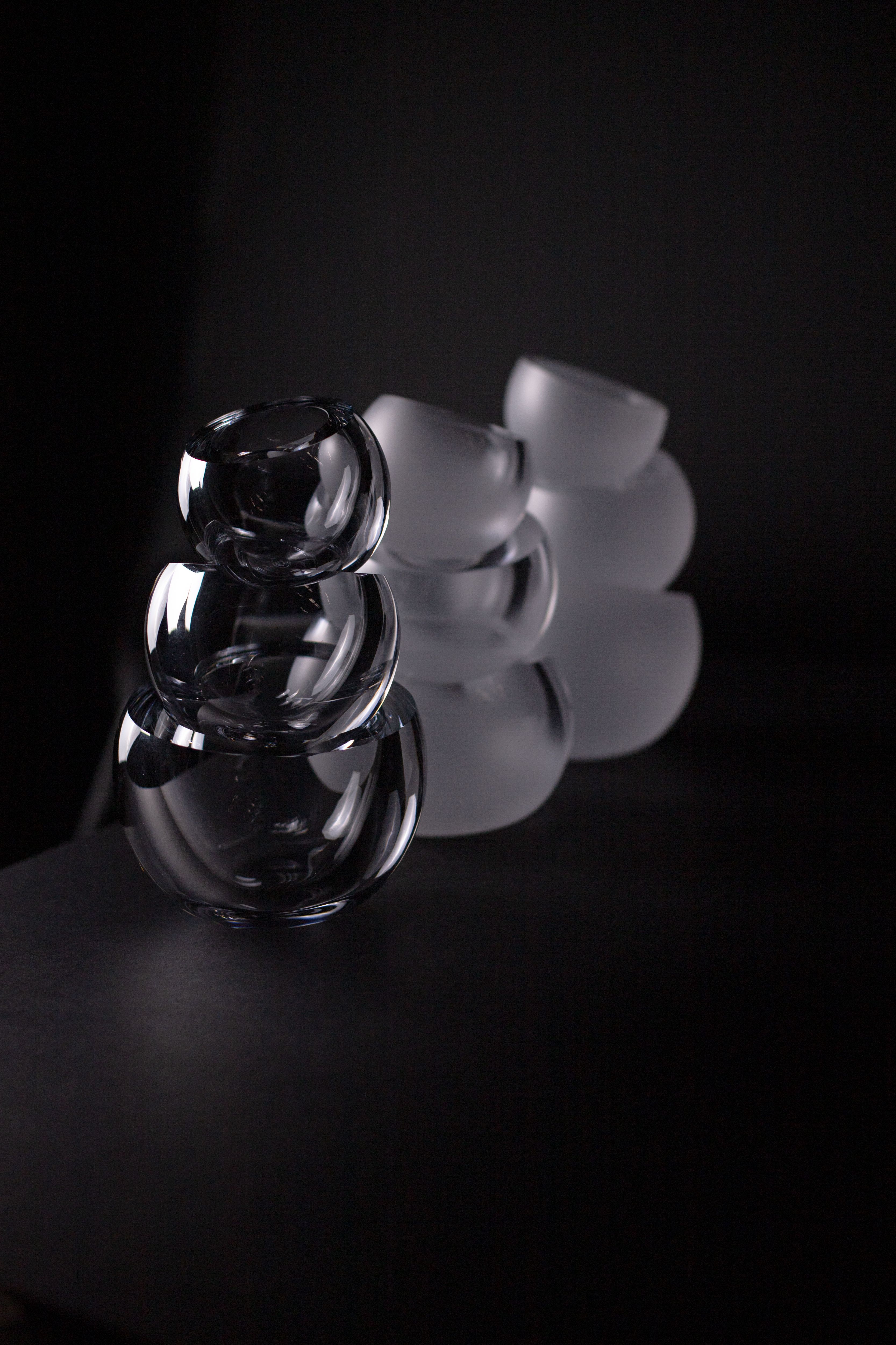 Artwork description: The artwork "Childhood" consists of nine freely blown and formed glass spheres, divided into three sets. The group of objects is created solely in one medium - glass, highlighting its uniqueness, lightness, and stability. Cold processing techniques such as grinding and frosting are used on the glass, creating a velvety effect. The frosted glass surface allows for the addition of drawings, graphic patterns using pencils, markers, or colors, fixed with blown acrylic lacquer.