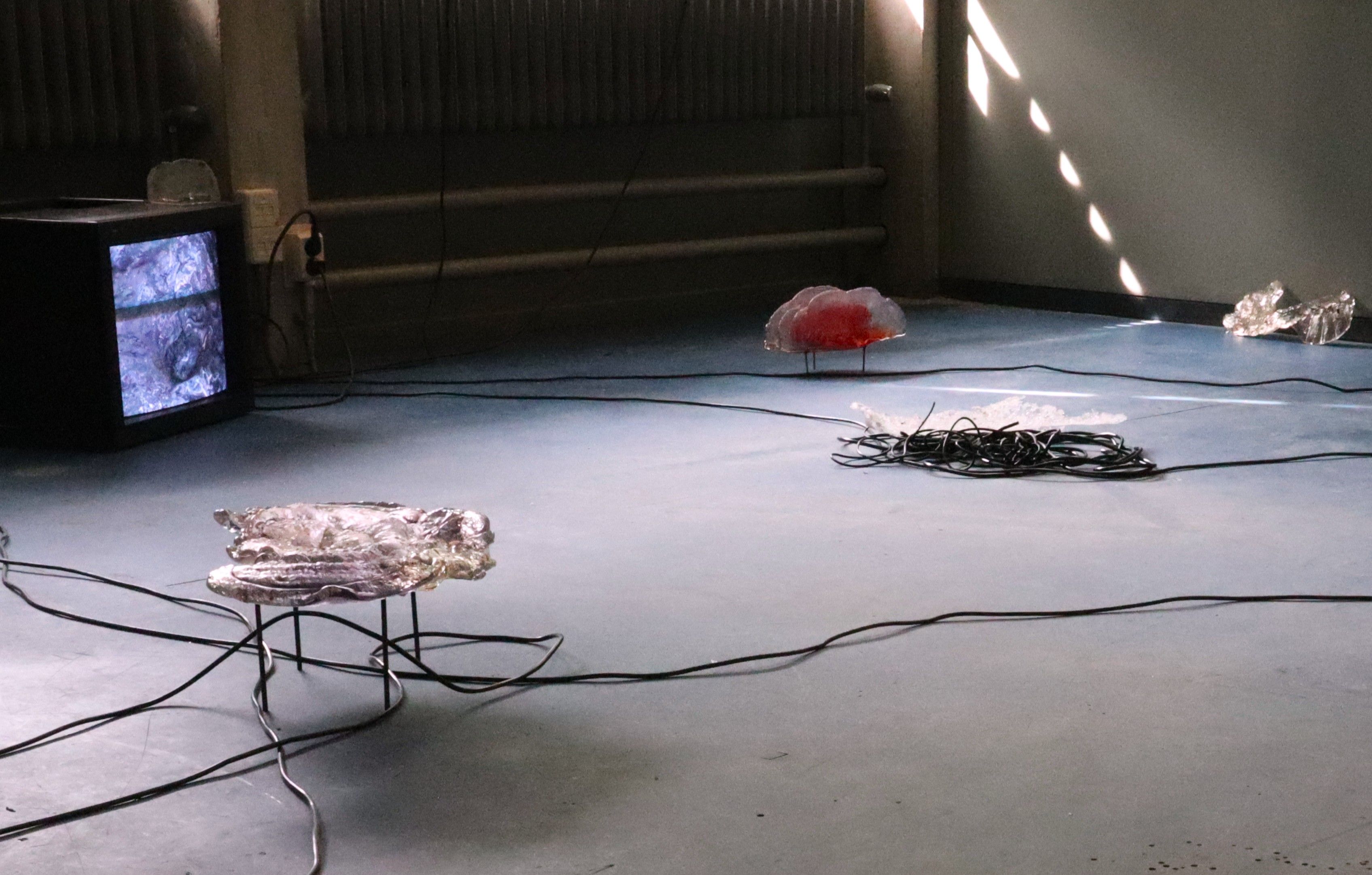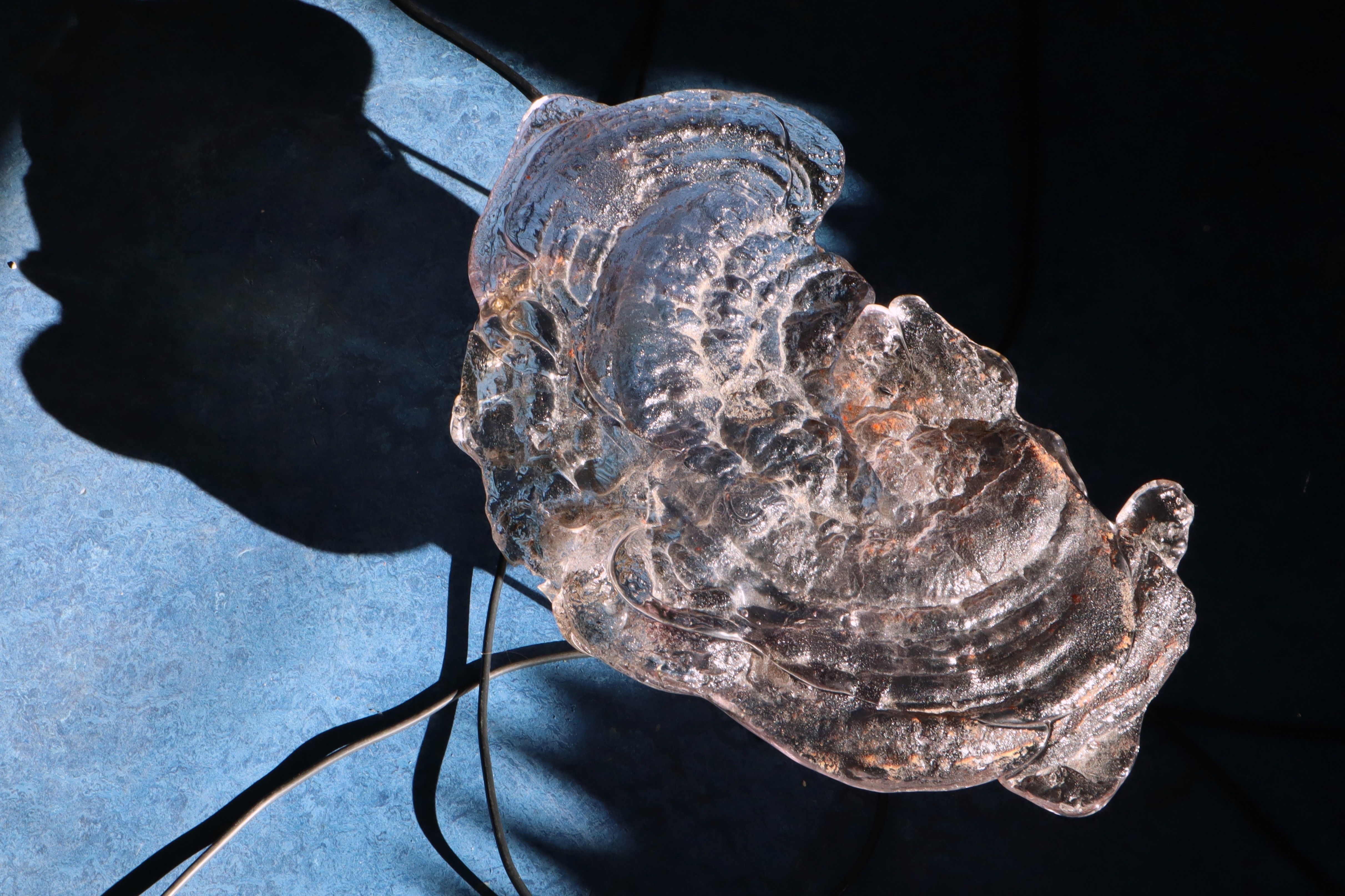 Artwork description: The sandcasted sculptures were made by imprinting actual mushrooms into sand and finishing the modelling by hand. After harvesting the mushrooms in Czechia i made the casts in Amsterdam. I followed through this act of placing these natural shapes out of context by putting the glass sculptures on the edge of a highway. The light of cars within the glass, captured by the camera created abstract landscapes, resembling an organic, almost cellular communication or a perhaps a city landscape. The glass sculptures and the videos were a part of an installation called Moon Milk, which dealt with an interesection of technology and nature. I am choosing to highlight the glass casting in this submission.