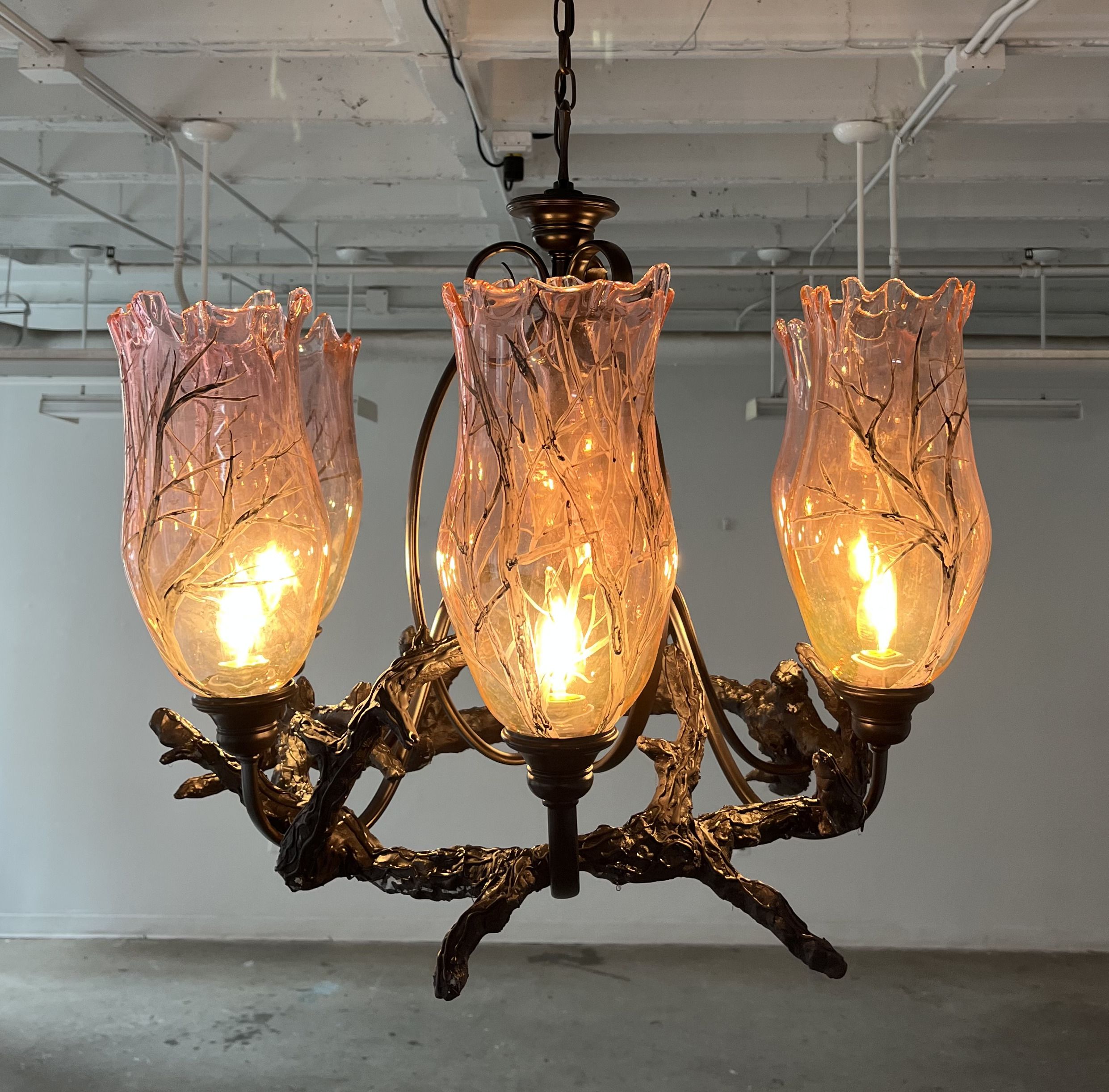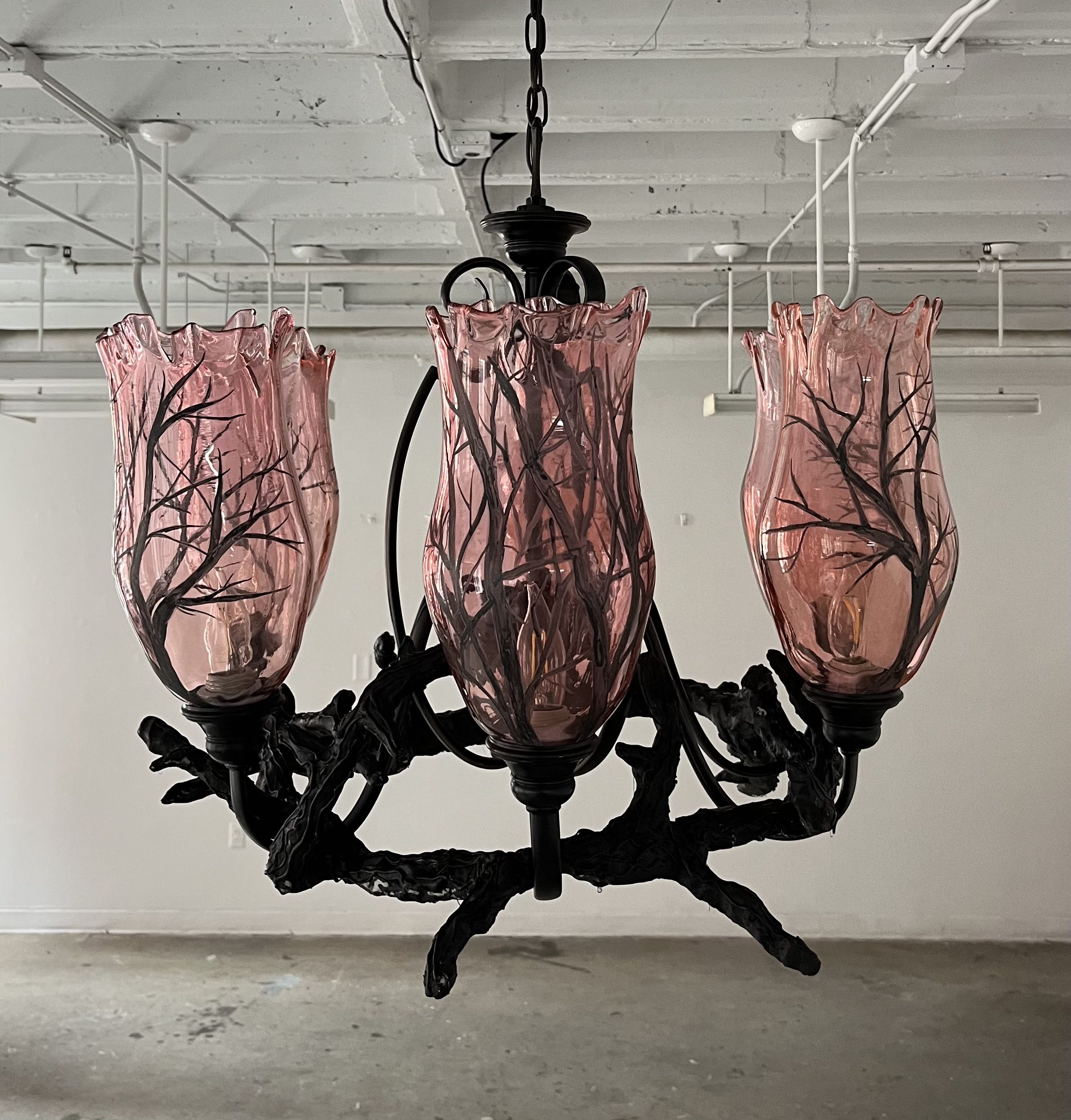 Artwork description: Crown of Thorns is a functional chandelier with blown glass shades decorated with enamel and a branch-like sculpt wrapped around the found light fixture. One of the focal points for my senior exhibition, Haus of Sticks. The low-fire enamel work on the glass reflects onto the walls creating a forest of shadows.