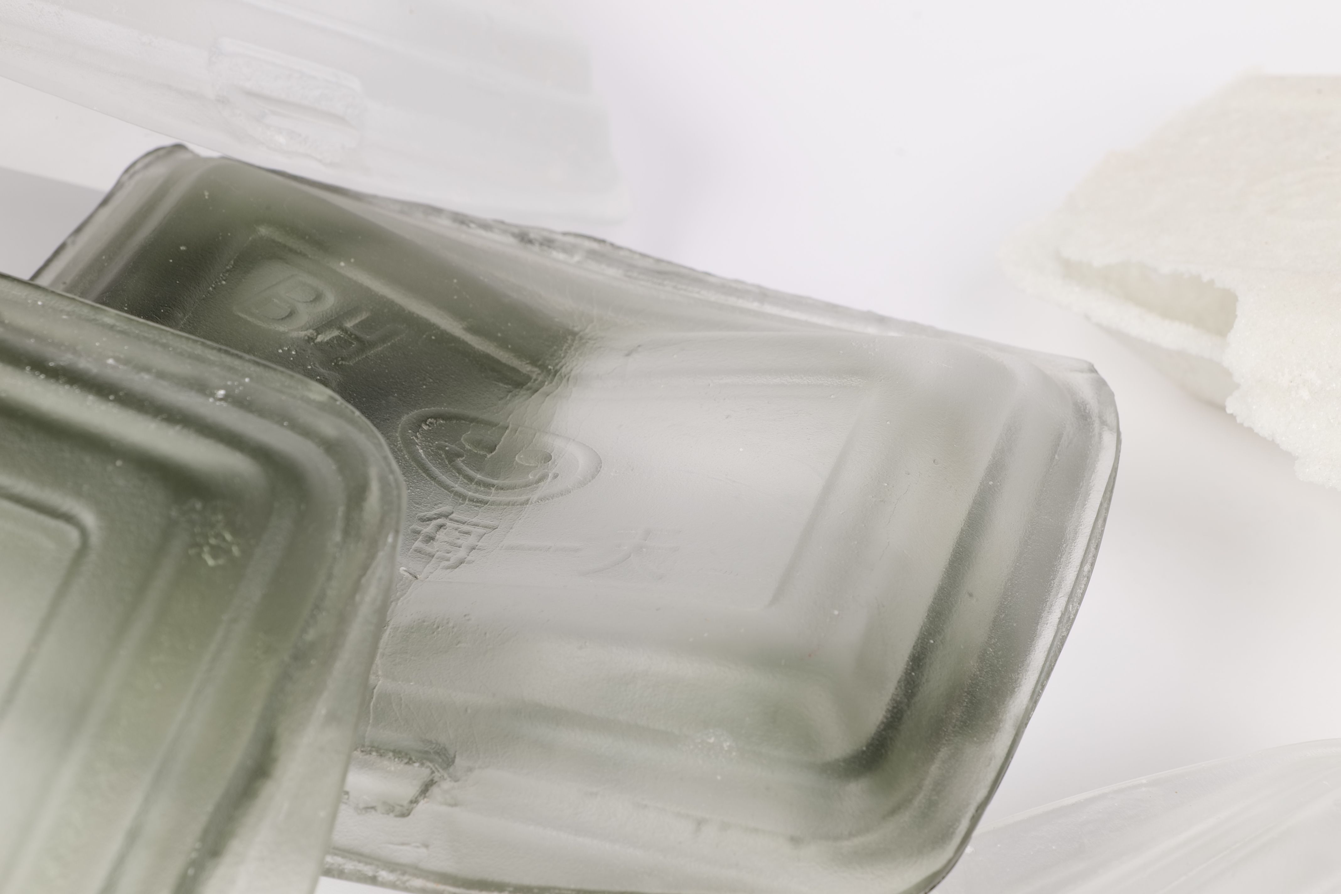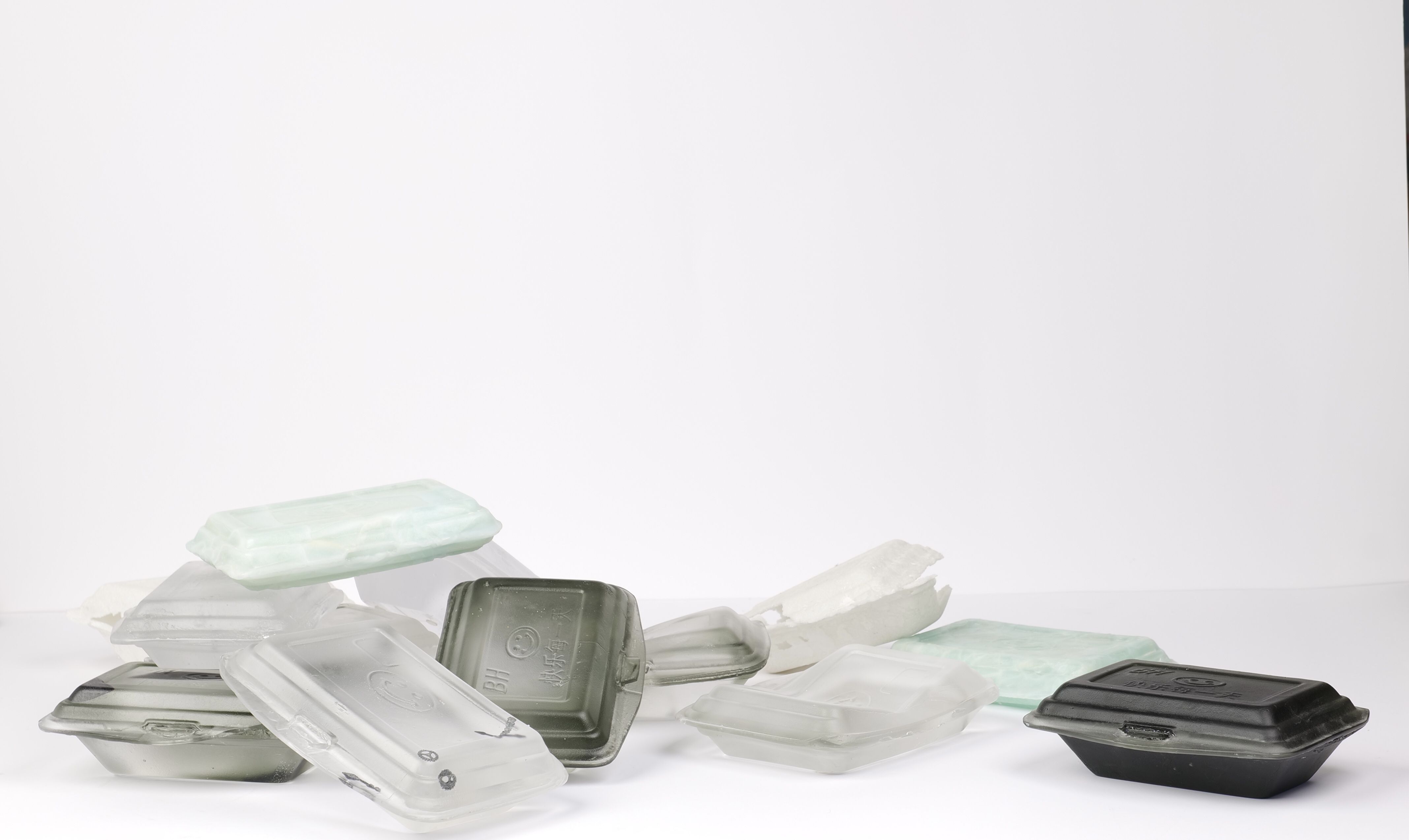Artwork description: Every disposable lunch box scattered on the ground has its own number, every non-degradable disposable lunch box is the prime culprit of the destruction of the natural environment. The various disposable lunch boxes are made by the method of molding and restoring, and are stacked on top of each other, just like the real disposable lunch boxes are scattered on the ground at will. The work uses transparent, recyclable glass material to show these eco-hazardous foamed tableware, with contradictions and conflicts. The ban and lifting of the ban on disposable lunch boxes are controversial. This is not only a one-off lunch box plan, but also an action to protect the ecology.
