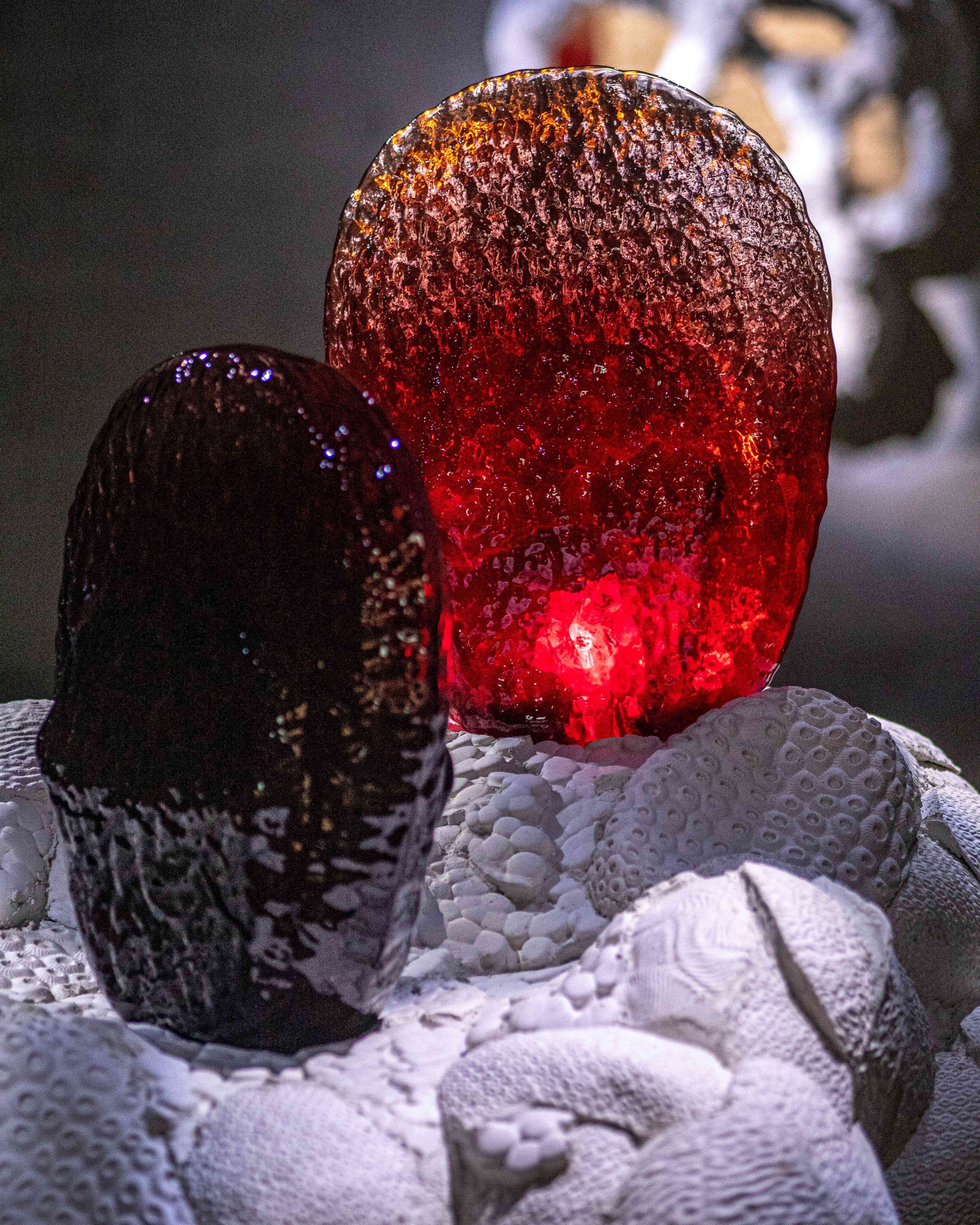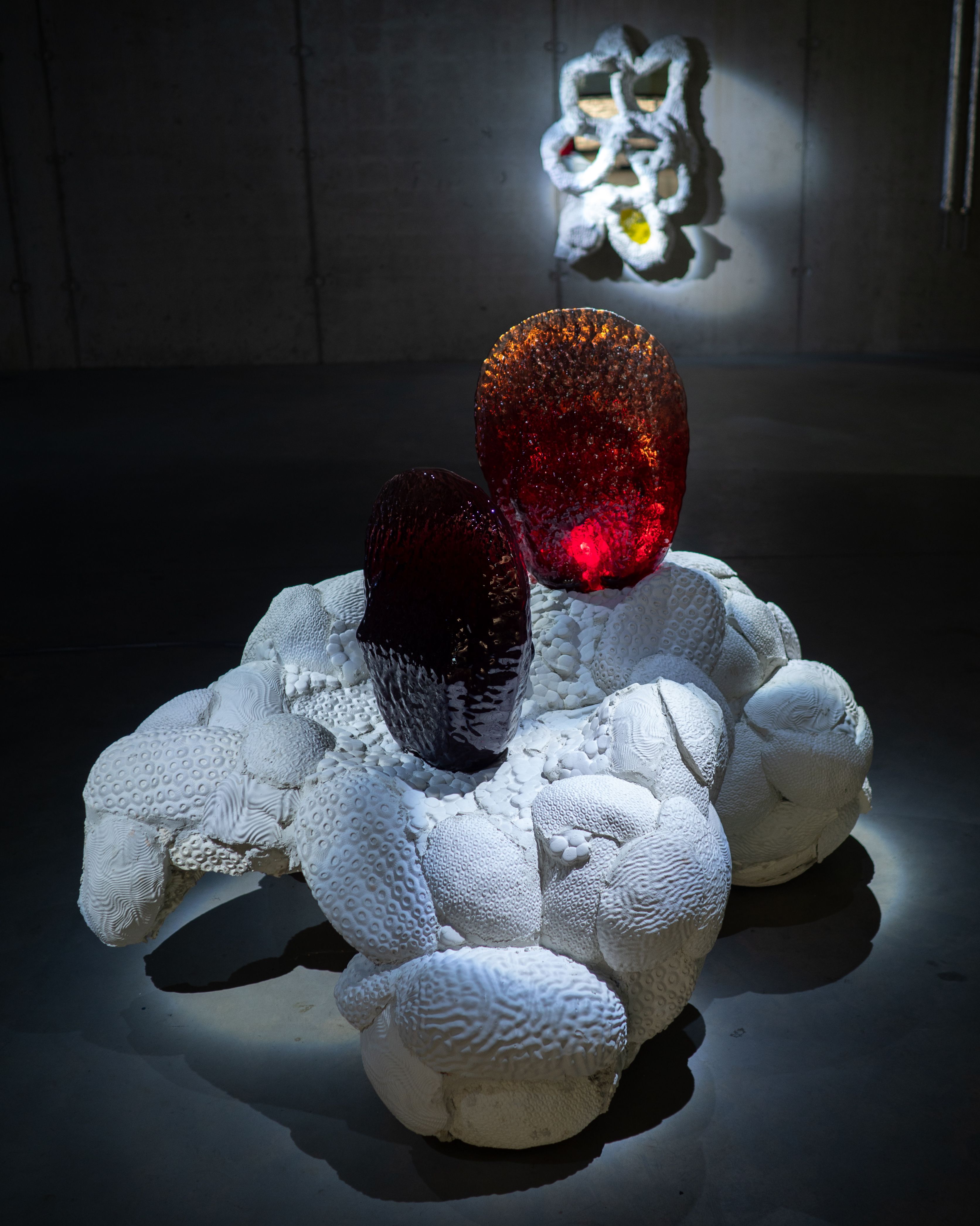 Artwork description: Our ecosystem is on the verge of a sixth mass extinction caused by human activity. Due to the gradual global warming, the diversity of the biosphere is decreasing and the conditions for life on our planet will change irreversibly. These changes will be recorded in the geological layers. The EREBO art installation exposes our apparent immortality. Structural, densely blown glass objects represent life – here and now. Their aesthetic is based on marine invertebrates anchored to coastal rocks bathed by the ocean. In contrast, the raw porcelain reliefs, representing the calcified shells of dead animals, refer to the past – extinction. The depicted layer of sediment, together with the glass objects, describes the cycle of life on our planet, but also warns of imminent catastrophe.