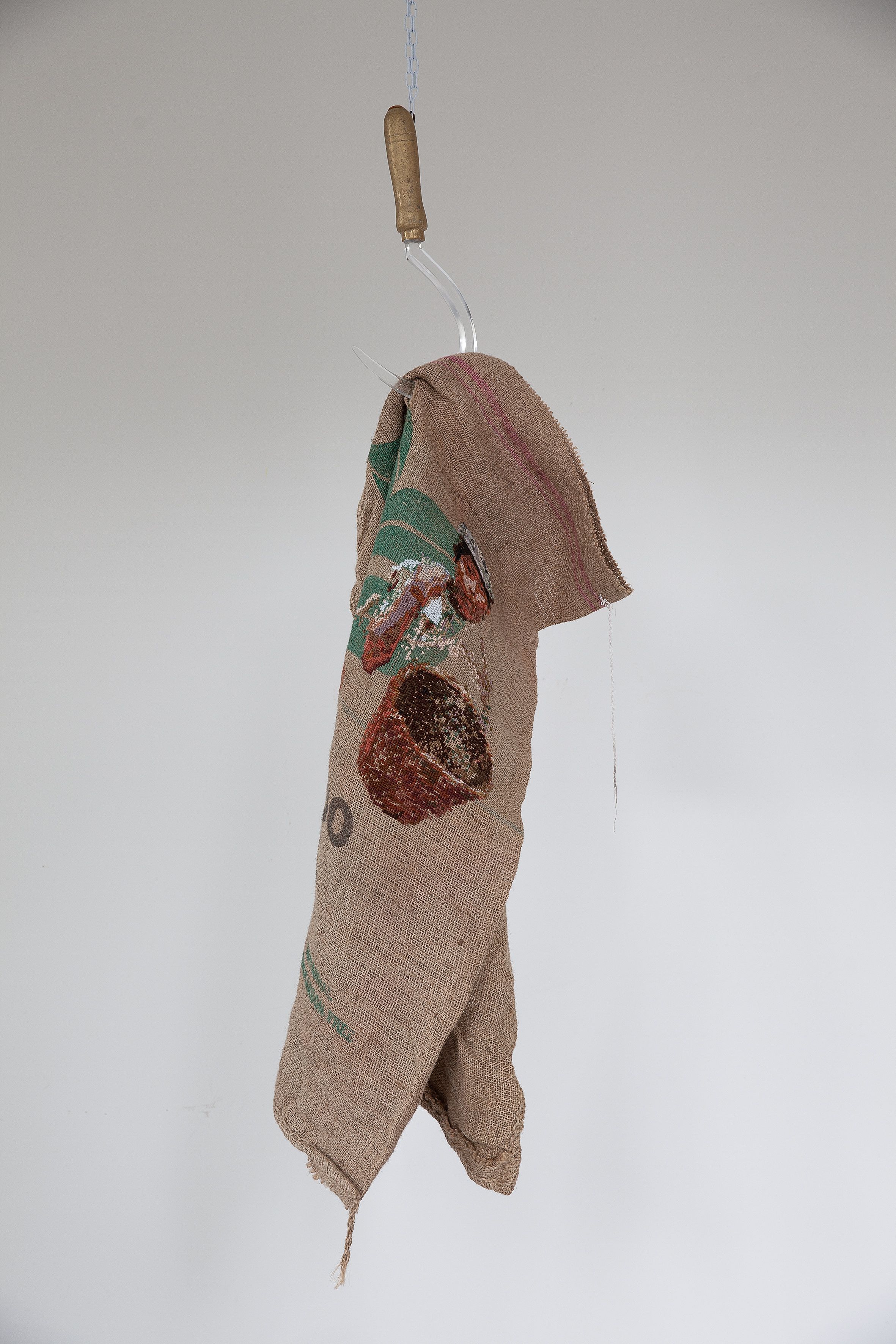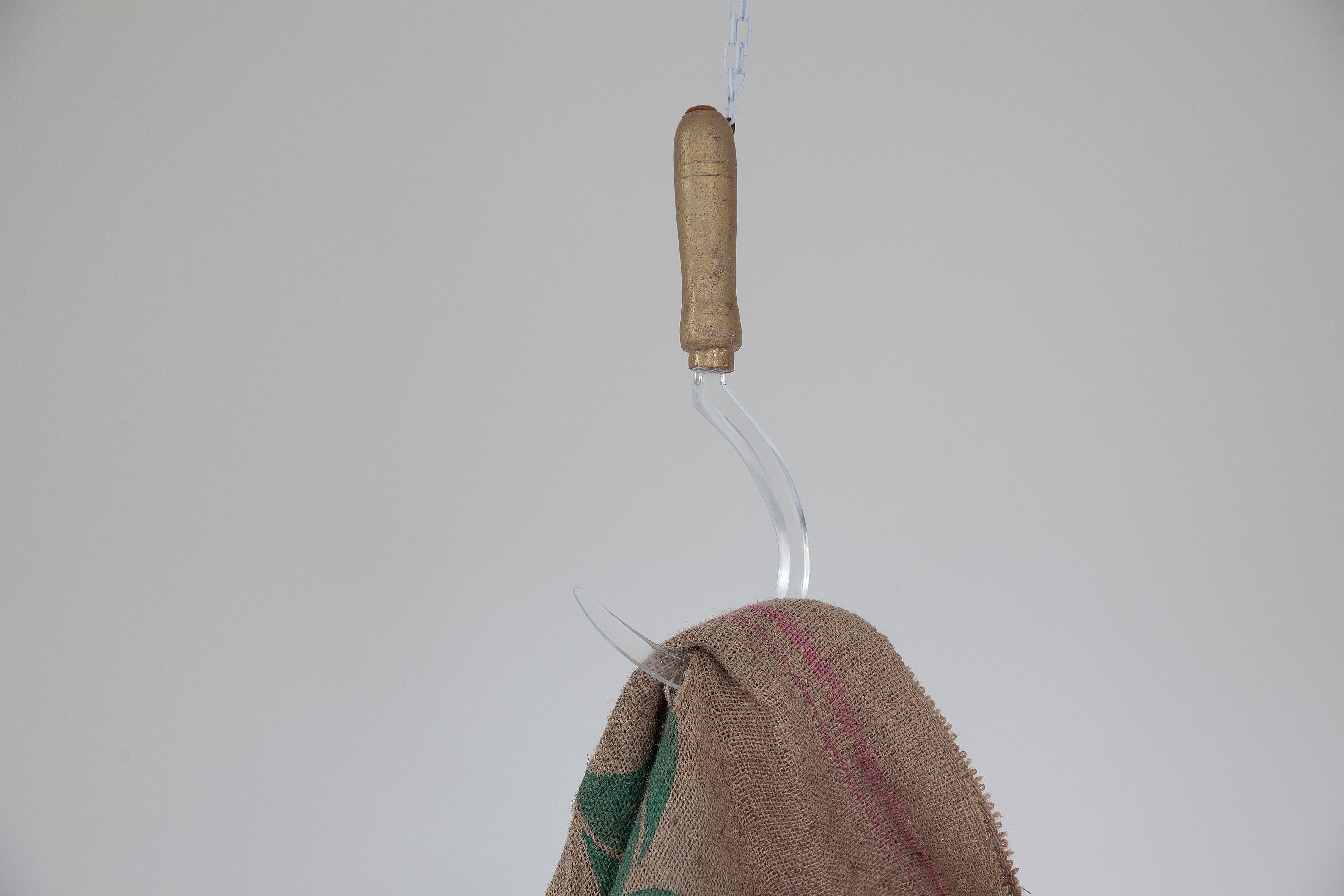 The abuses in coffee bean cultivation in which workers, both adults and children, are exploited led to this piece. As a symbol, the sickle refers to labor in the agricultural sector. The energy that is put into the work, its value to the owner of the beans and the vulnerability of the workers can be seen in the glass and bronze of the sickle. The burlap bag is hung from the glass, the portrait of a little boy picking coffee beans, is intertwined with the fibres of the bag in which the beans were transported.