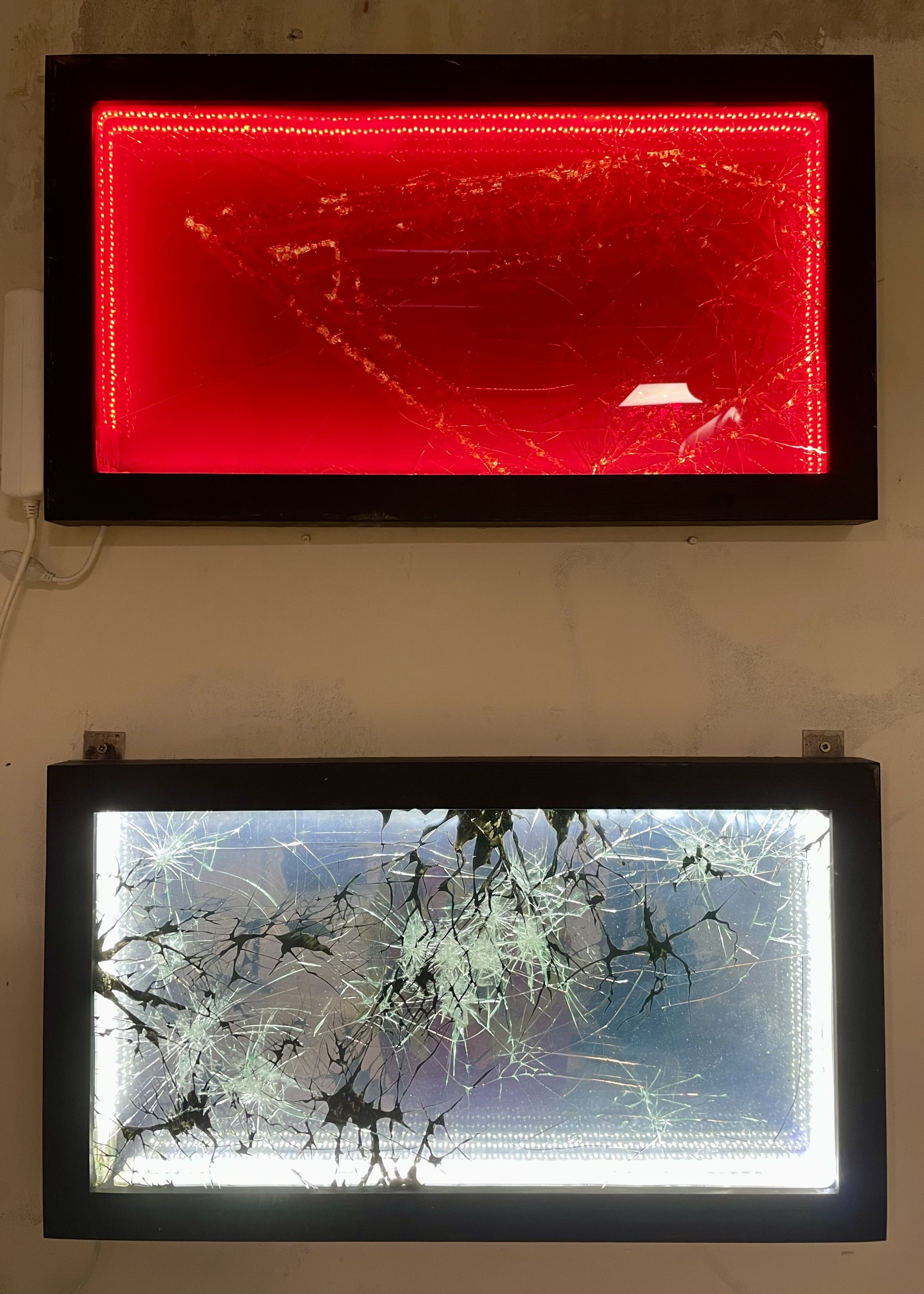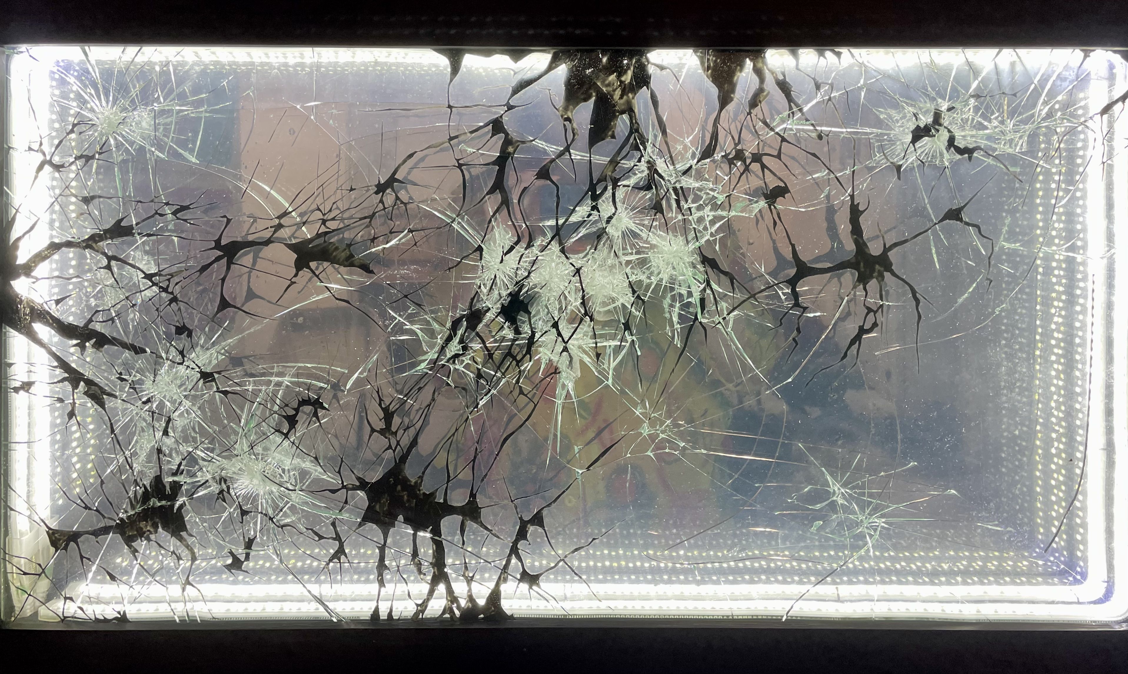 While I was researching my topic of interest, I began portraying more abstract imagery. During this project, I tried out glass lamination technology. With the help of this technology, I could shatter the glass and laminate it again. I put mirrors behind my art, so the audience could see themselves while looking at my work. In the forefront – the viewer sees a shattered image in the glass, in the background – themselves. You can interpret this way of exhibiting my art in many ways. For example, the viewer can interpret themselves as freedom. It is no secret that all of us are tied to our work, some of us feel like we depend on something. Therefore, the cracks in the images could be a metaphor for feeling imprisoned in our lives.