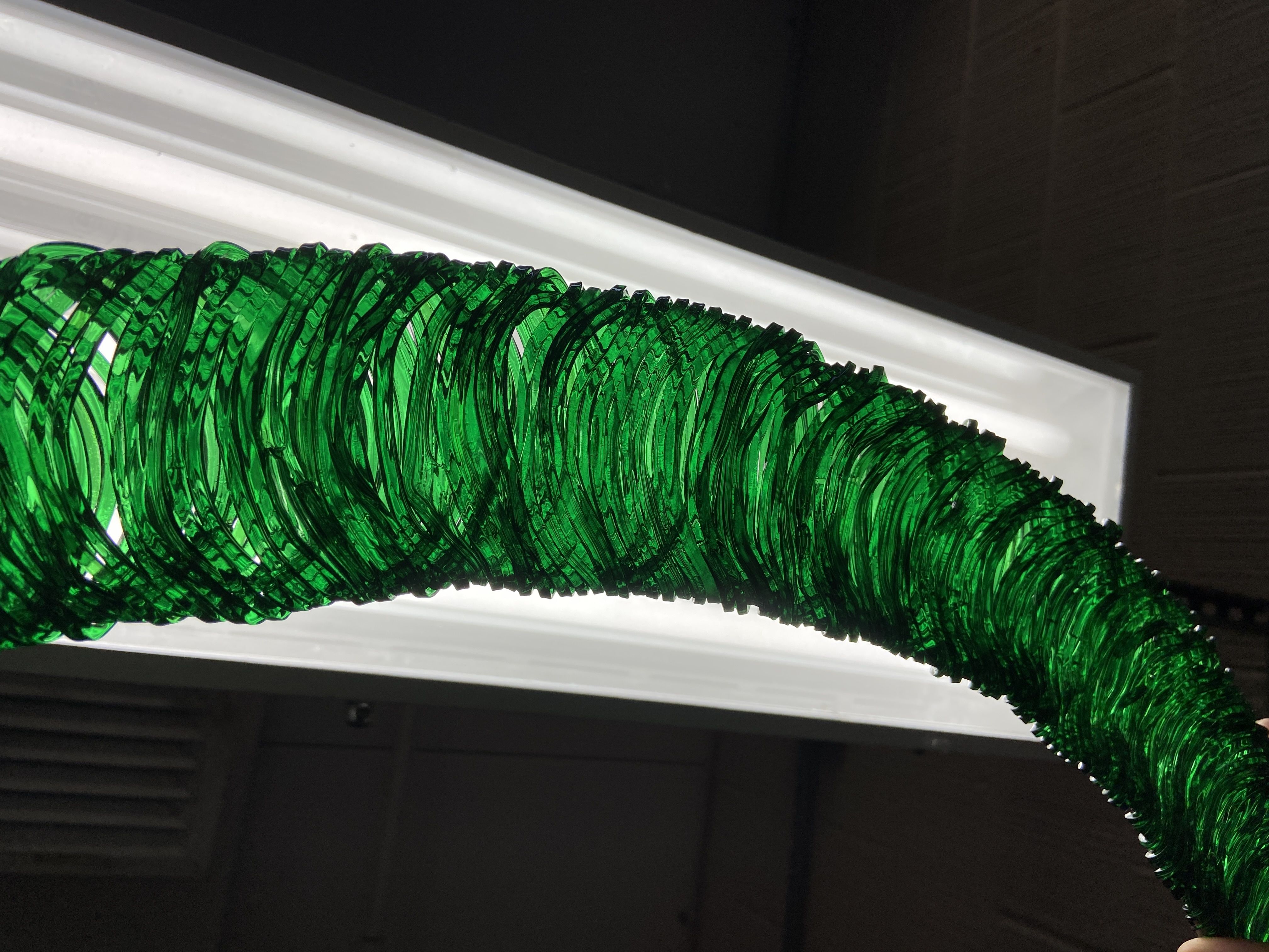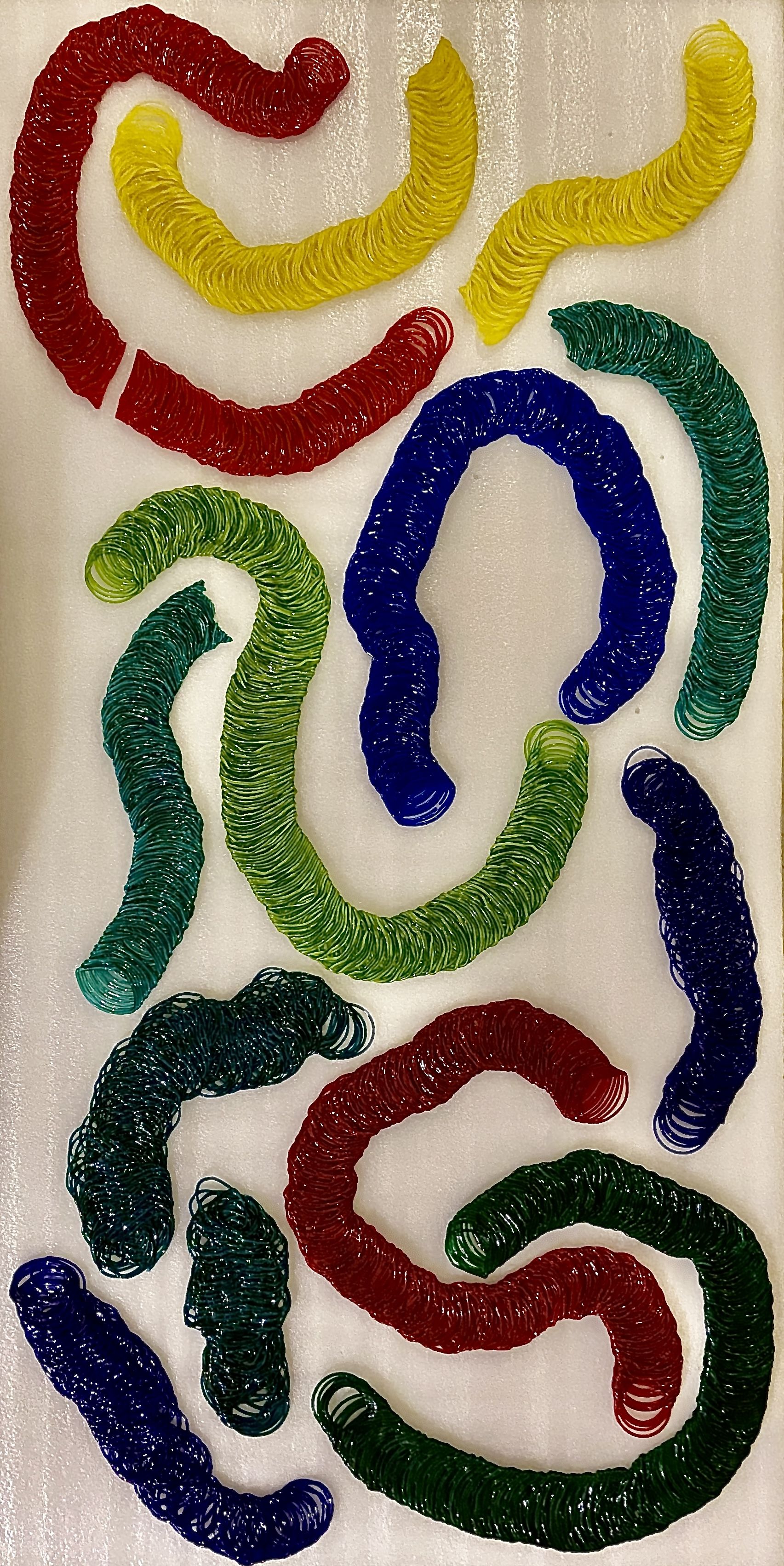 Artwork description: One dot is singular but when they together it forms a line. I am creating these glass strokes, each made from single bangles fused together which becomes something more robust than just the single dot which is a single bangle in this case.
