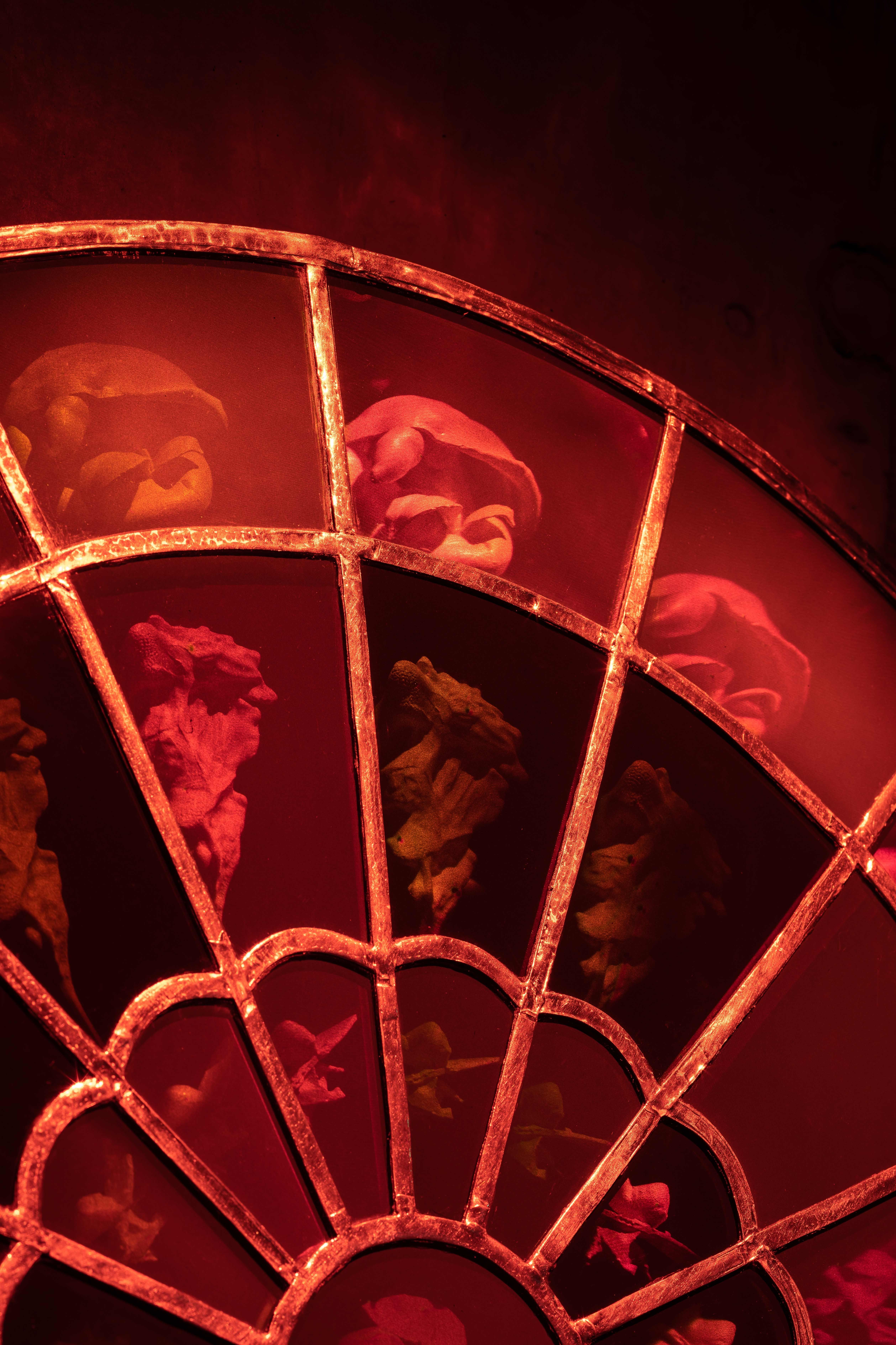 The holograms are shown thanks to the spotlight shining from the front, not from behind as is usual for stained glass. The spotlight mimics the position of laser light and thus reconstructs the object beam that is complementary to the laser beam. This is the reason why are able to see the holograms.