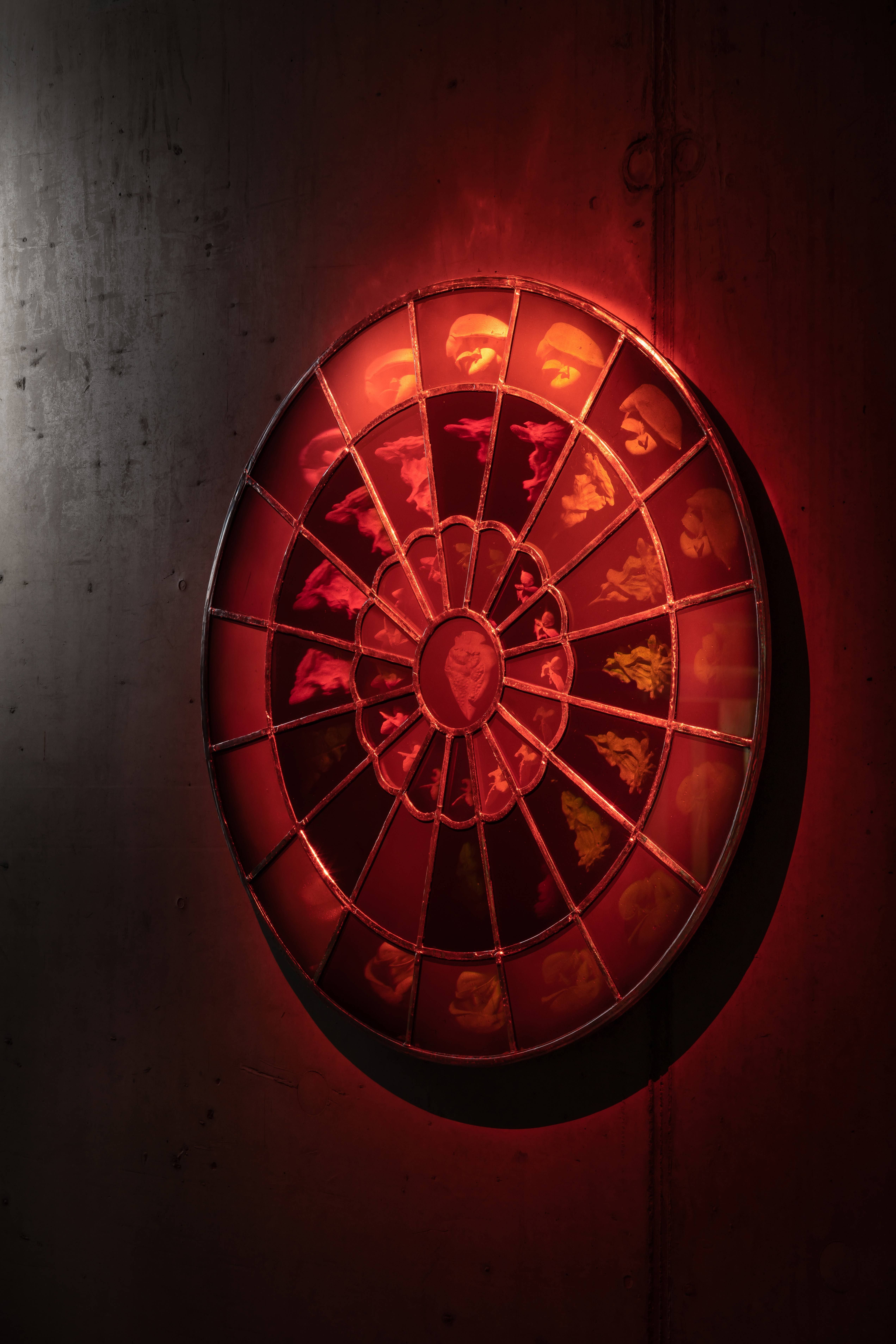 Holographic stained glass diptych Holos deals with the theme of creation of the world and its design was established in collaboration with artificial intelligence. Its morphology is based on Gothic rosettes and Art Nouveau floral ornaments. The piece was inspired by the third day of creation of the world according to the Bible, when the first plants, their seeds and fruits were created.