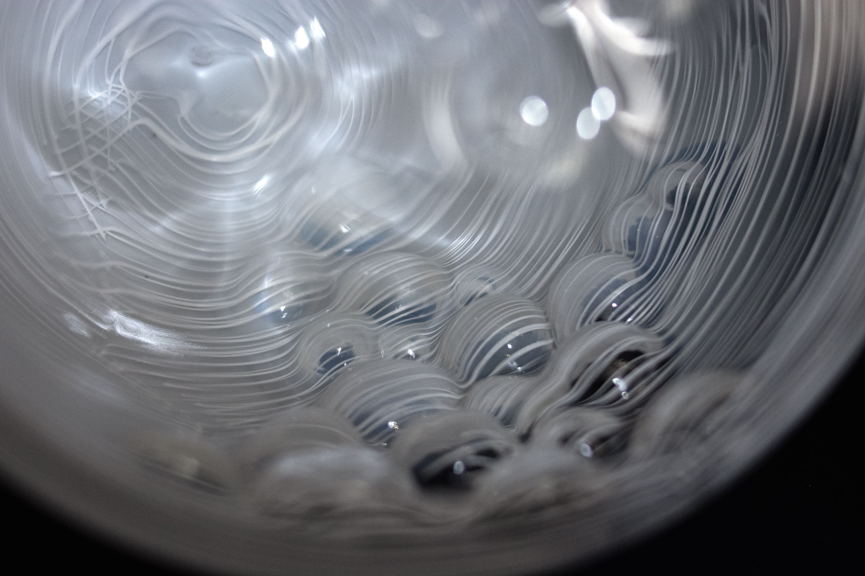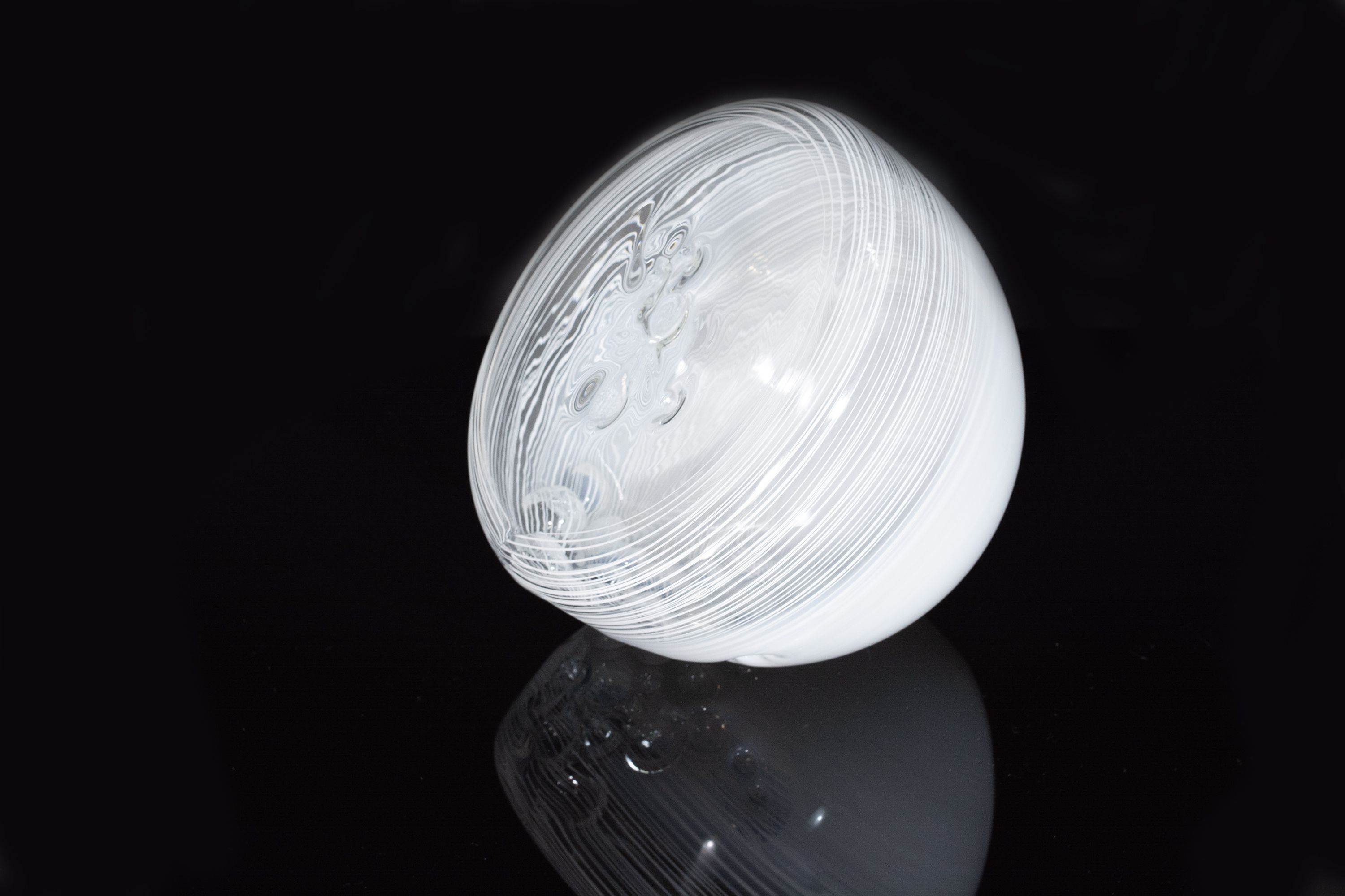 Artwork description: Inadequacy explores expressions of subtle emotional disruptions through simple geometric shaped blown glass sculpture with their inner membranes. The hollow glass sculpture is a metaphor of a human body/mind, in the action of making, I push and poke on soft and hot glass surfaces creating random patterns inside of the glass membranes. The gesture of making process represents slight discomforts and moments of disruptions that are easily dismissed in our daily life, however it echos around once we realize them.