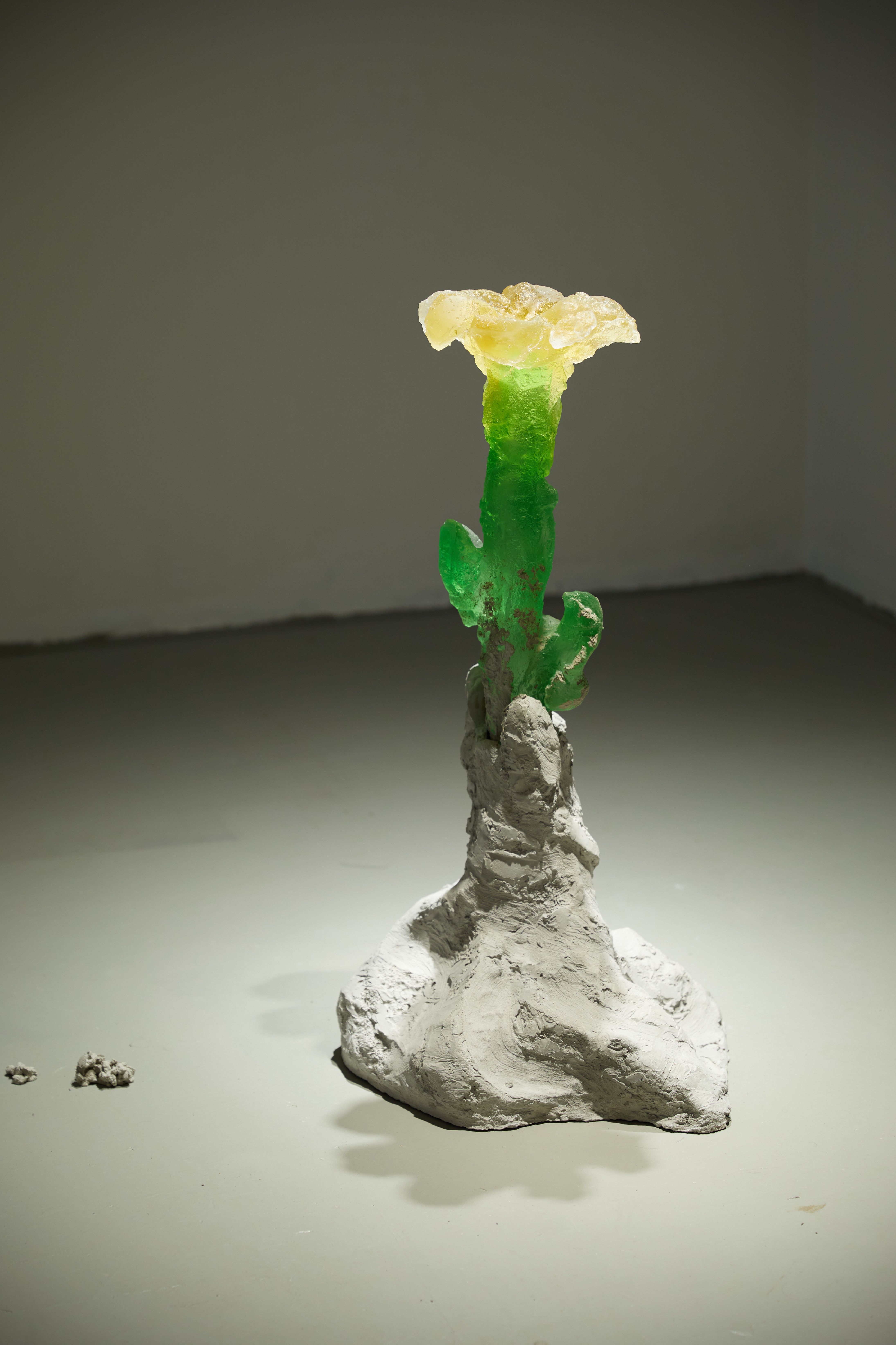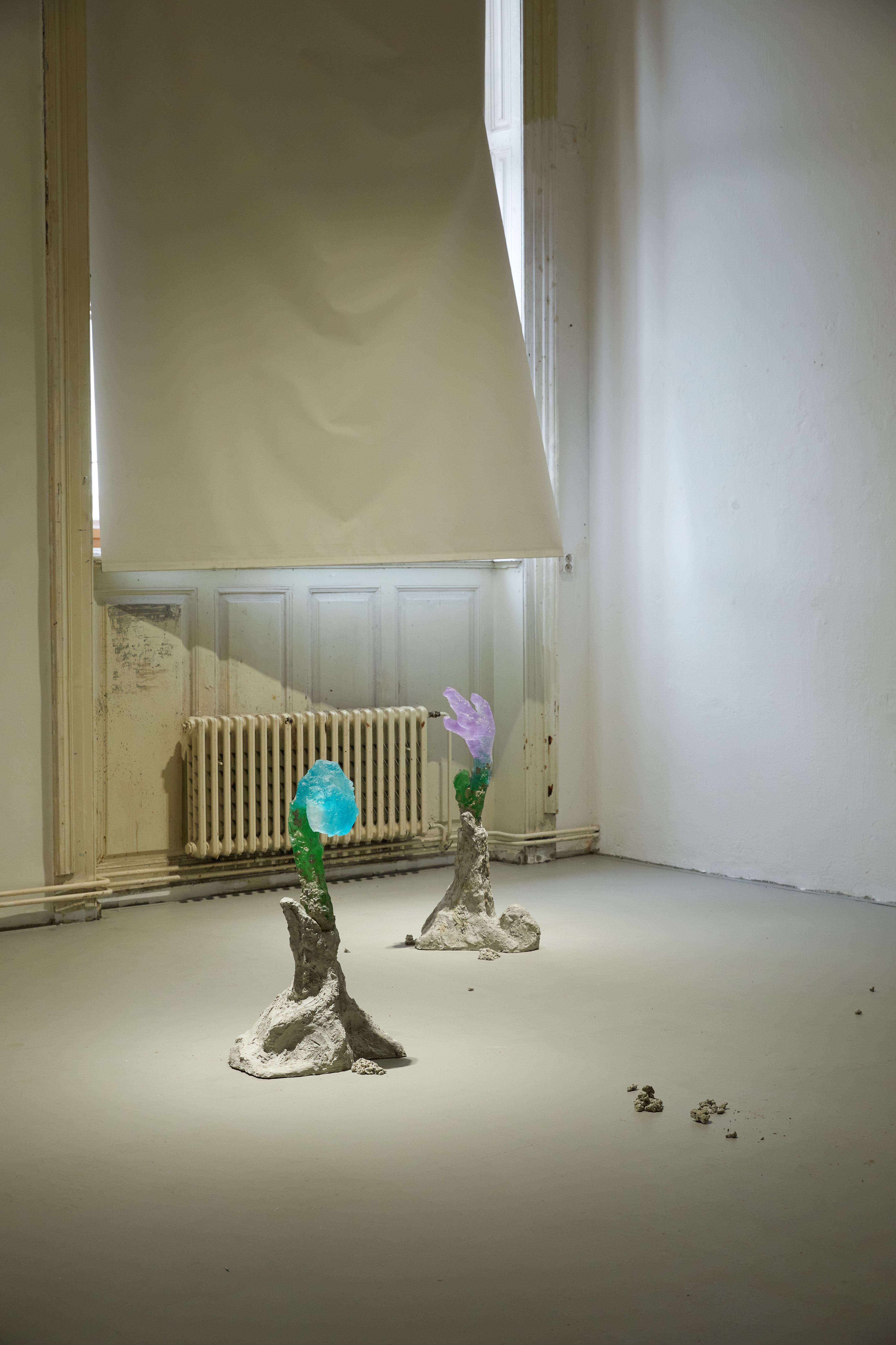 Artwork description: Self-reflection, self-knowledge and self-acceptance. My work is based on theories of personal development, which I process into a series of objects with the motif of three fictional flowers growing from concrete foundations through materials such as glass and concrete. Each object bears a colour depicting a given stage of gradual inner flowering. Mounting foam was used for the base model, which was transferred to glass using compatible glass to record the expanding organic and porous material. Concrete, a sturdy and durable material, here represents the impenetrable structures of the world and constraining conventions.