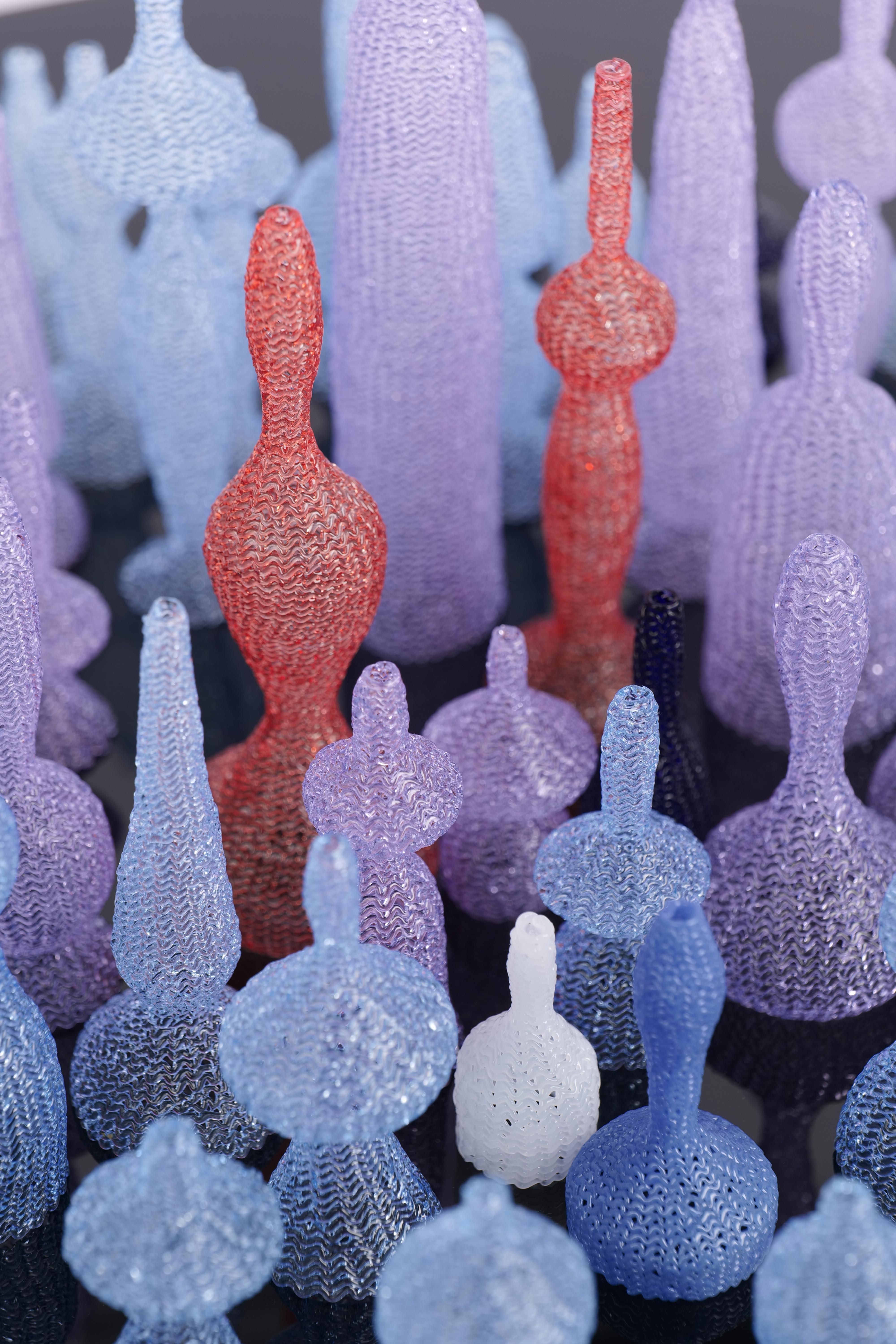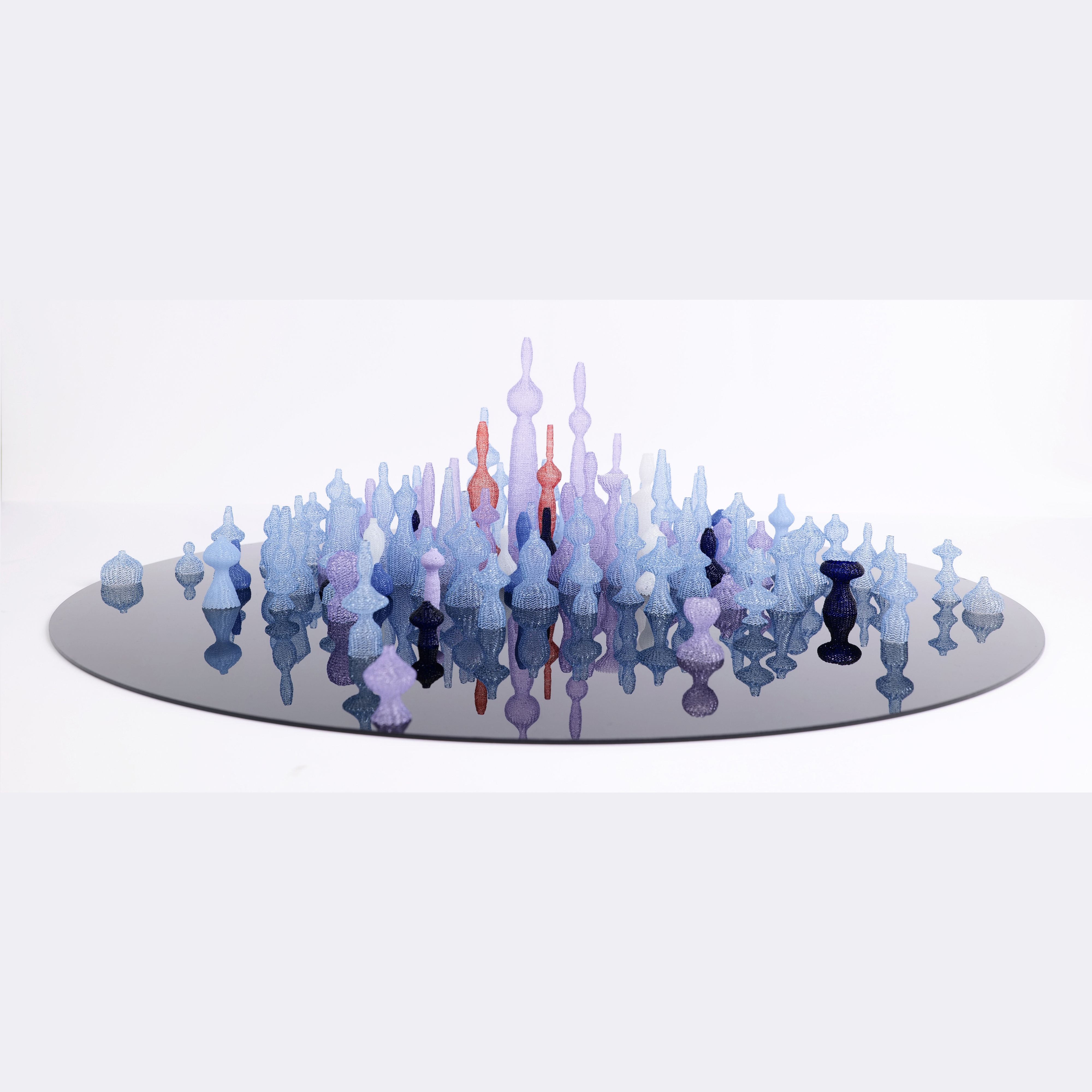 textures on the surface of glass to form a sparkling effect, representing the dazzling lights of the buildings in the city. Every single building I made is a hollow thin shell, highlighting the fragility of glass, representing the thinness and fragility of spiritual life of people living in cities in the present material explosion. Each monomer is overlapping with each other, creating a complex visual effect, reflecting the anxiety and confusion of people's life in modern cities.