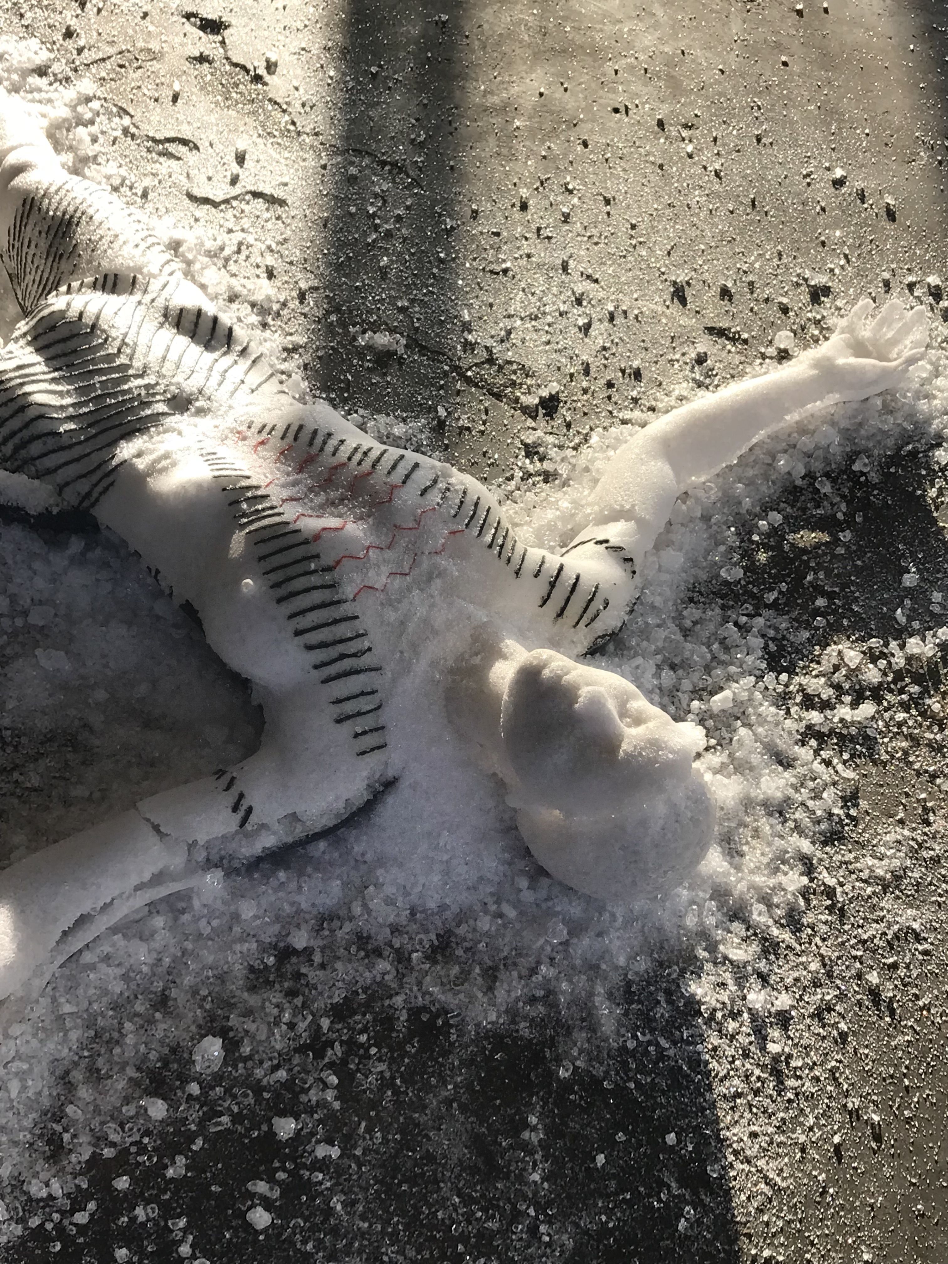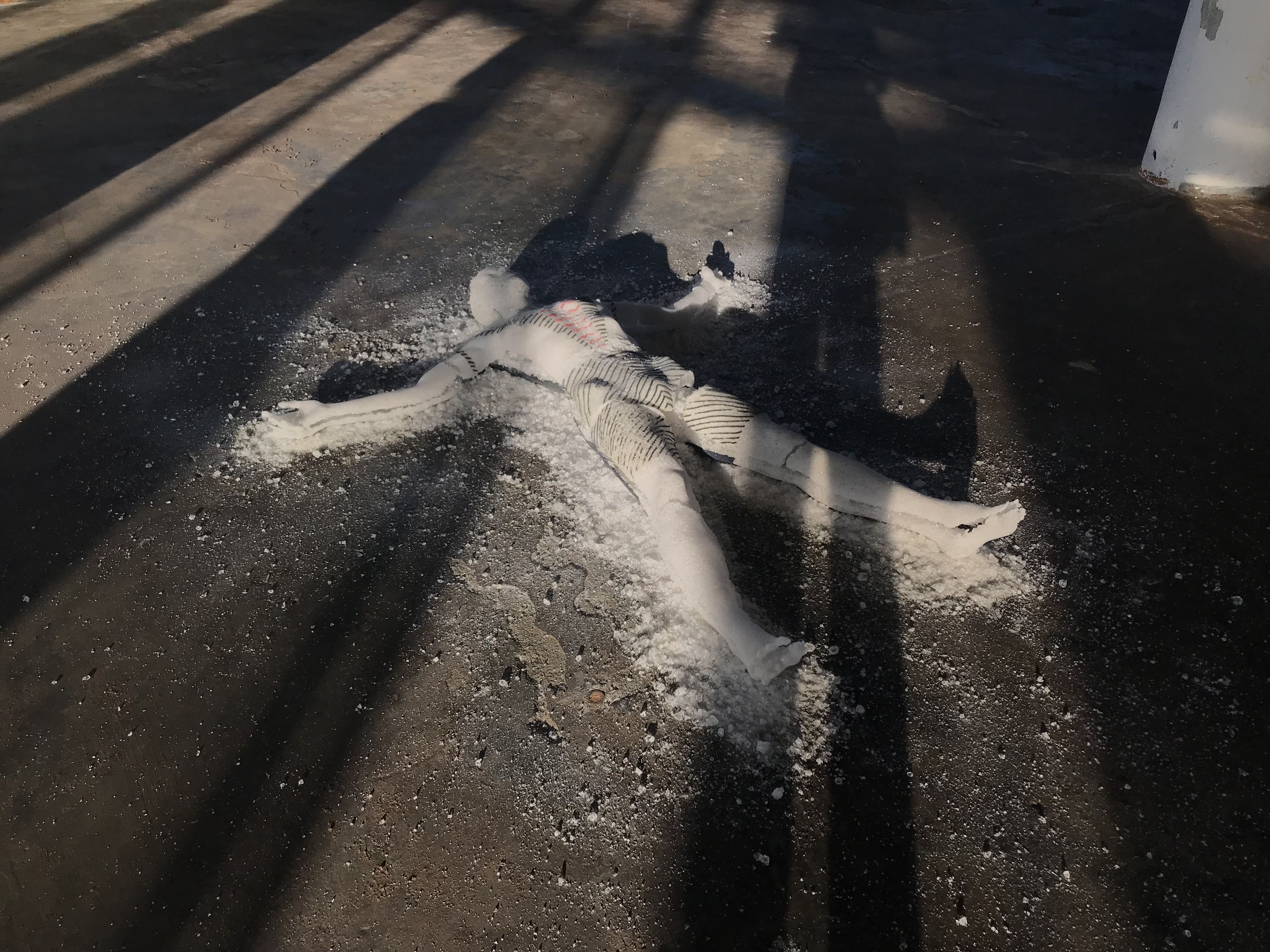 Artwork description: I created a glass figure using the pâte de verre technique of my adult body with the pattern of a childhood dress I wore at the age when I began to realize what death was. The pattern of my childhood dress on my now adult body expresses that I have gone through certain stages of life since I last wore that dress. The pattern of my child dress seems to mark the starting point from which I began to think about death. Two decades of thinking about death constantly are identified with the idea of The Physical Impossibility of Death in the Mind of Someone Living. I attempted a contemporary artistic expression on the theme of memento mori.