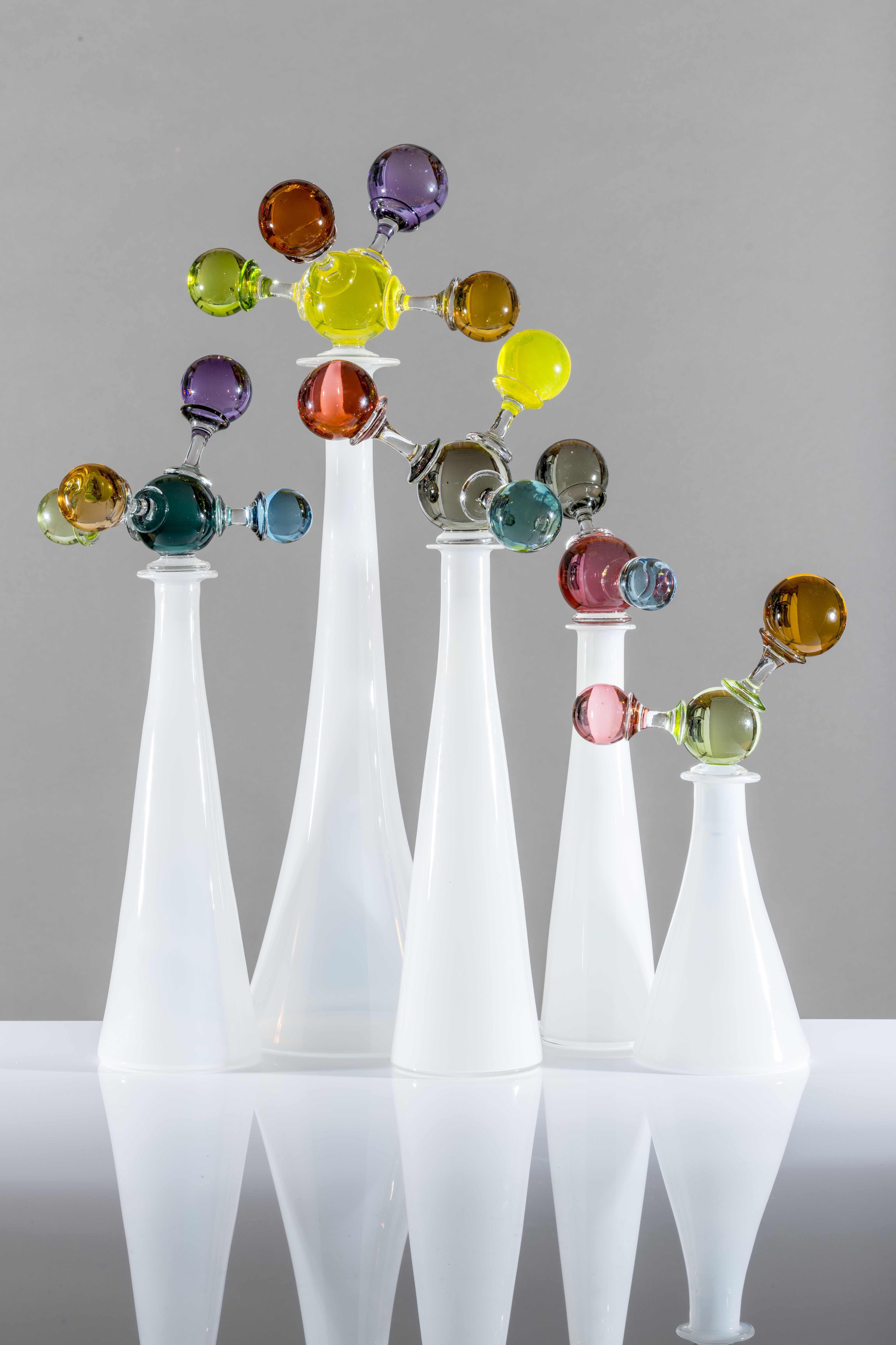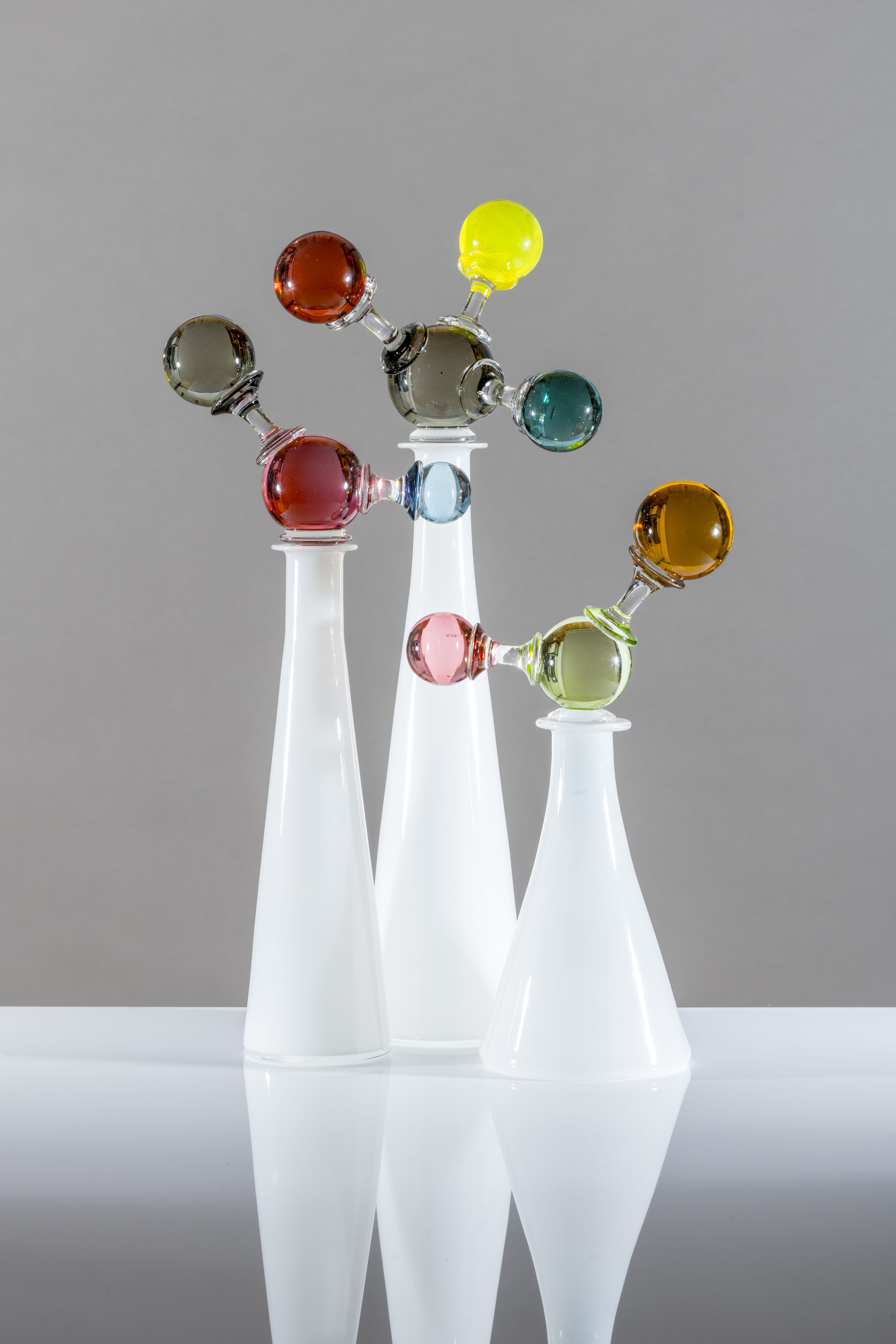 Artwork description: Molecular Vessels are a fusion of art and science, meticulously hand-blown to echo the elegance of scientific glassware. The vibrant, intricate lids, representing diverse molecular structures, making abstract scientific concepts into tangible art forms. These pieces celebrate the inherent beauty and complexity of chemistry.
