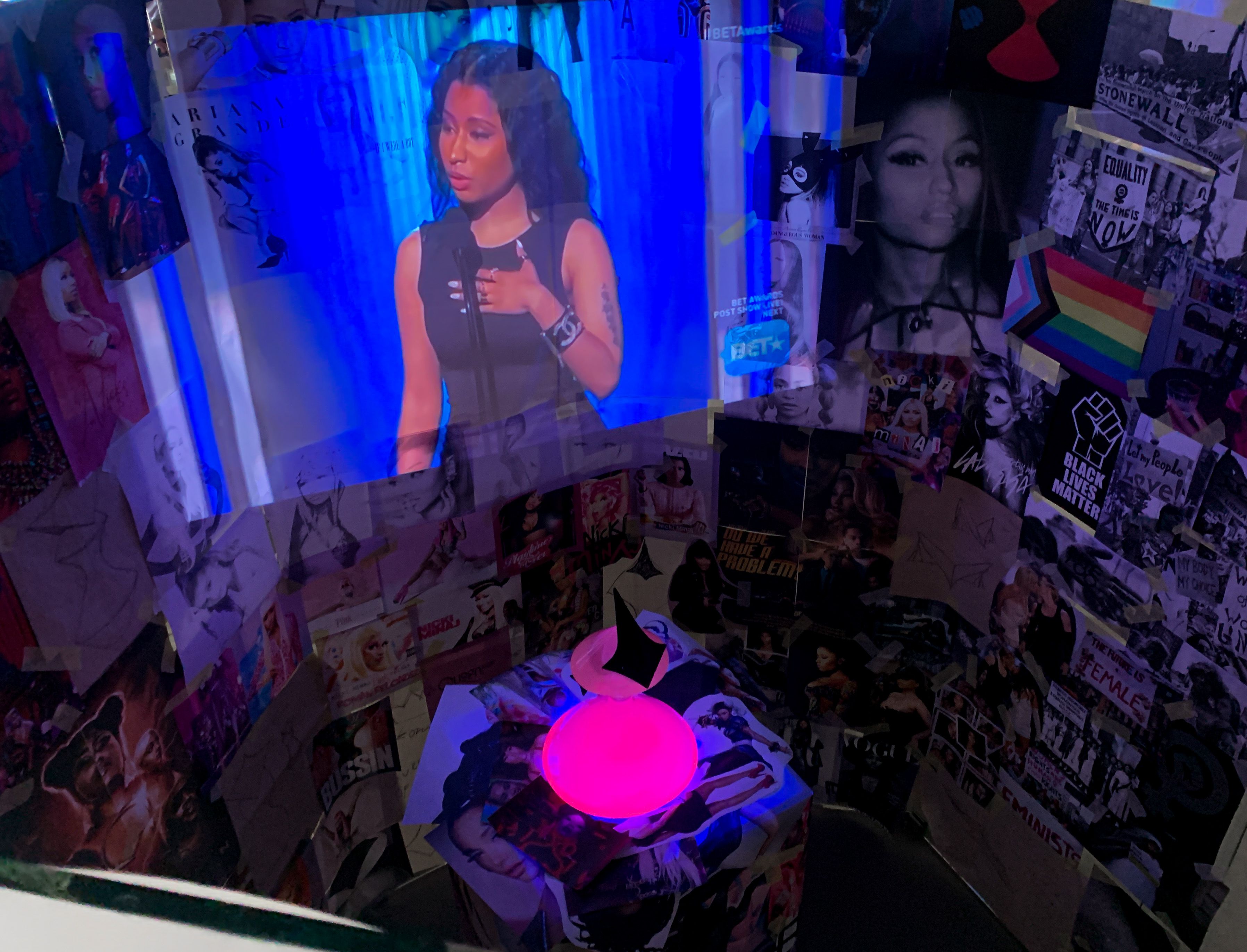 I wanted to create a special space and video for my sculpture and bring my feelings and imagination to the viewer as much as possible, the space is inspired by “a fan room/sanctuary” with a posters all over the walls, space and video contains pictures of subjects that was included in my bachelor thesis book, such as Nicki Minaj, Ariana Grande, Opera singer and other female artists, feminism and women right, sketches and LGBTQ+ rights.