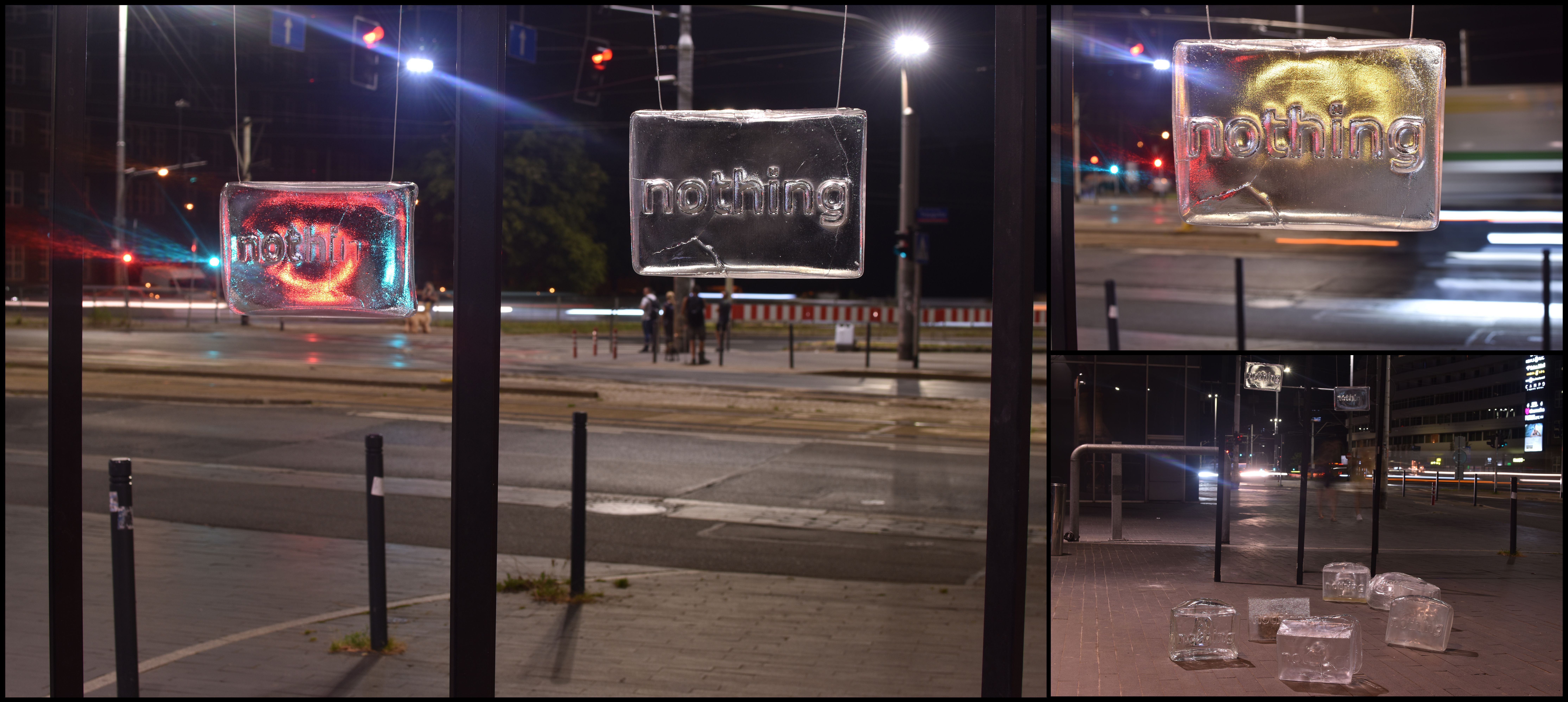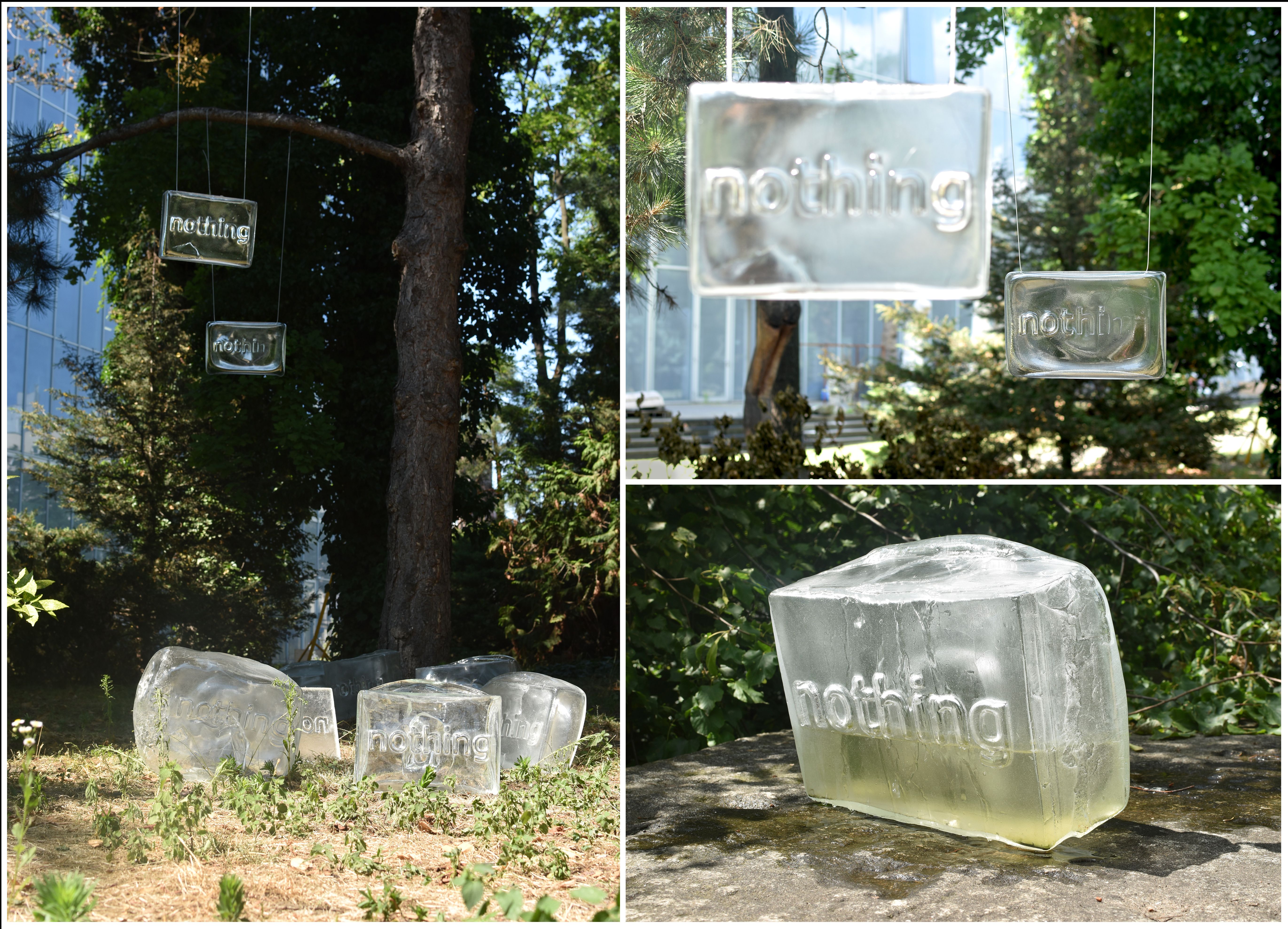 That question became an impulse to create the series of 9 objects, accompanied by the video clips. I made this installation to show that glass like other materials, or even more deserves to be seen. I expose my sculptures to the environmental conditions; rain, street lights etc. showing its present. I play with the recipient using the terms of absurd and humor.