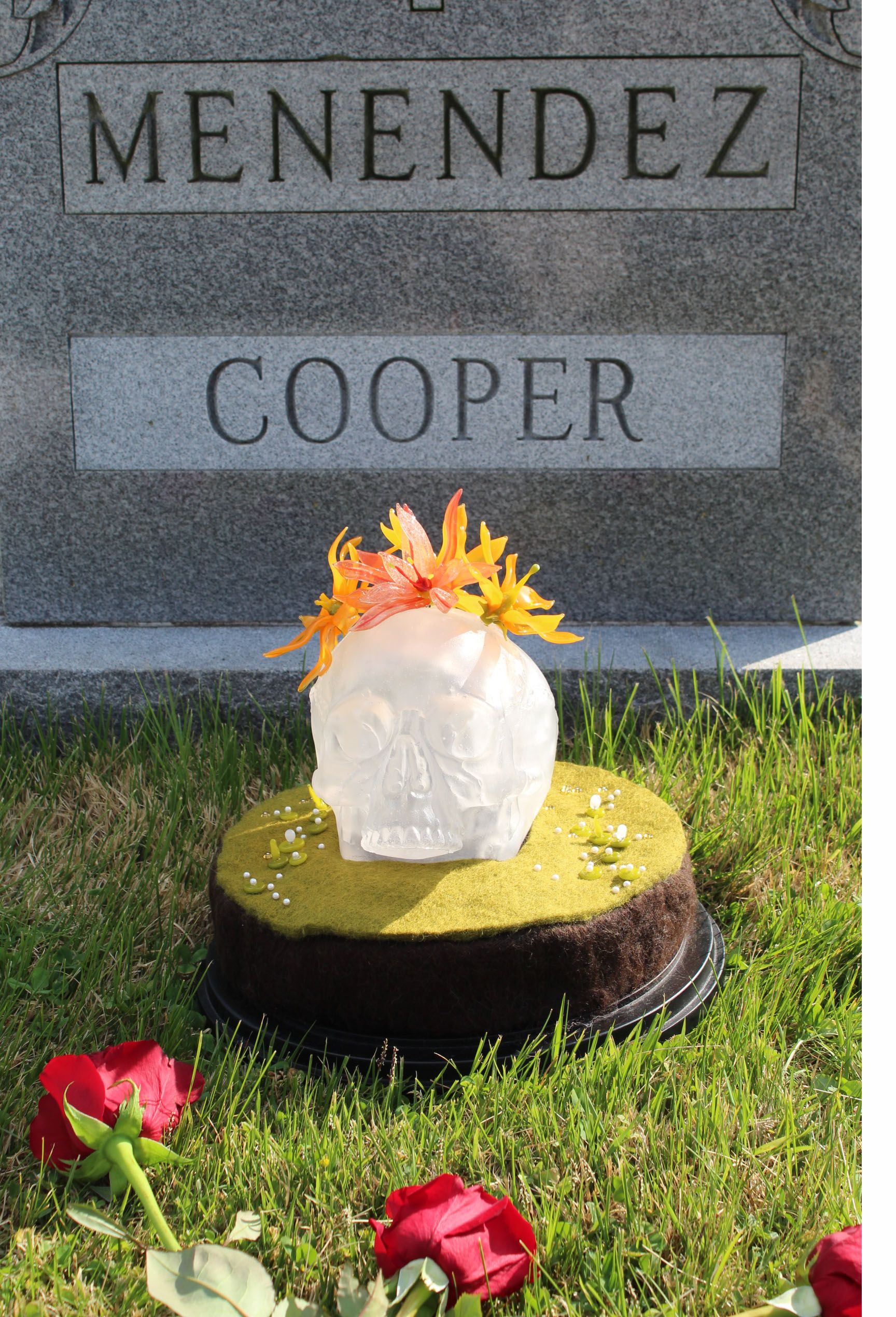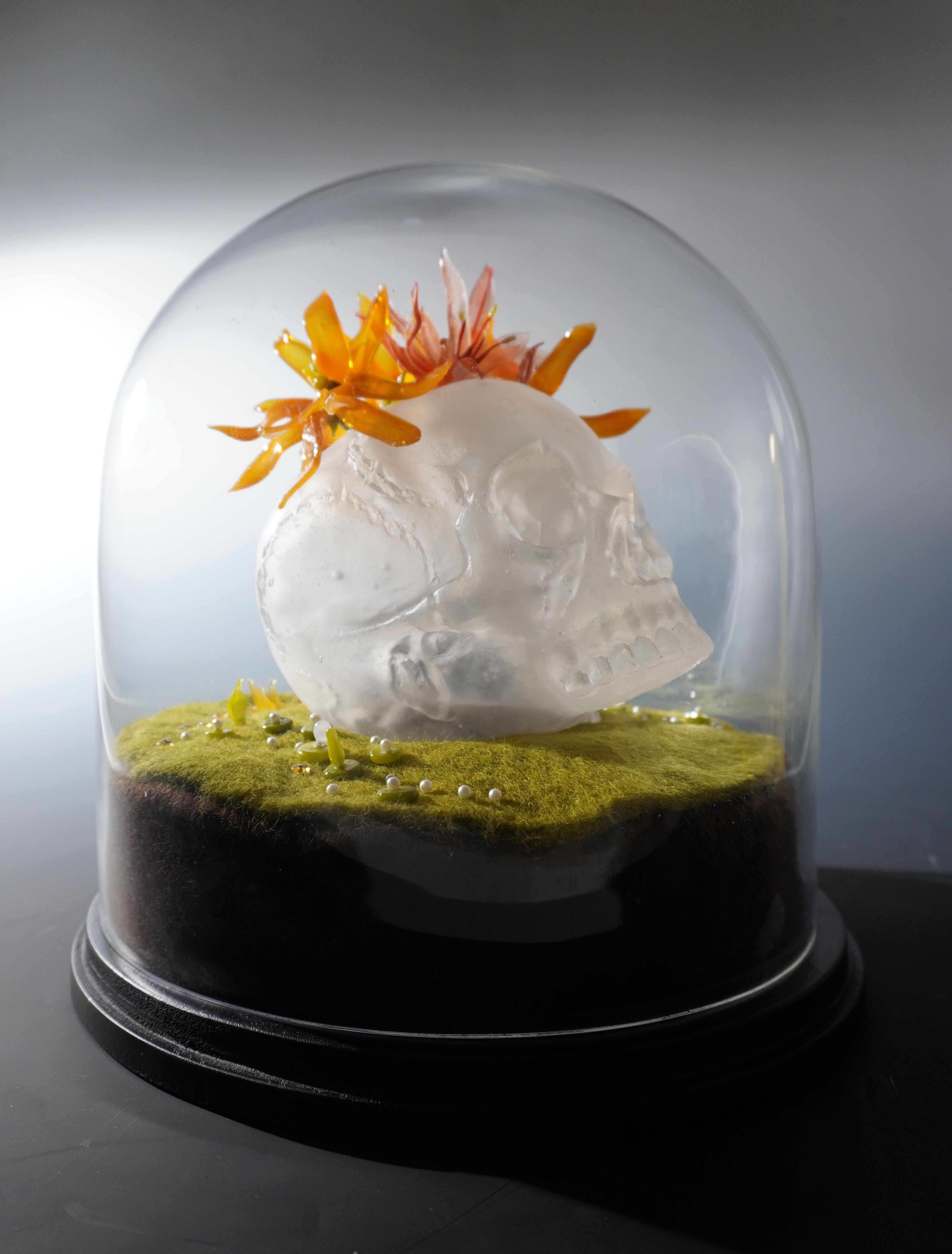 Artwork description: Glass skull that had been buried for years in the earth. The combination of decomposing flesh and earth makes a unique and fertile environment for growing. The earth is nurturing the body that was placed in it and trying to give it back life...in the only way that it can. This is part of a collection stored in glass domes of the earth and it's contents intended to educate viewers on the restorative powers of nature.