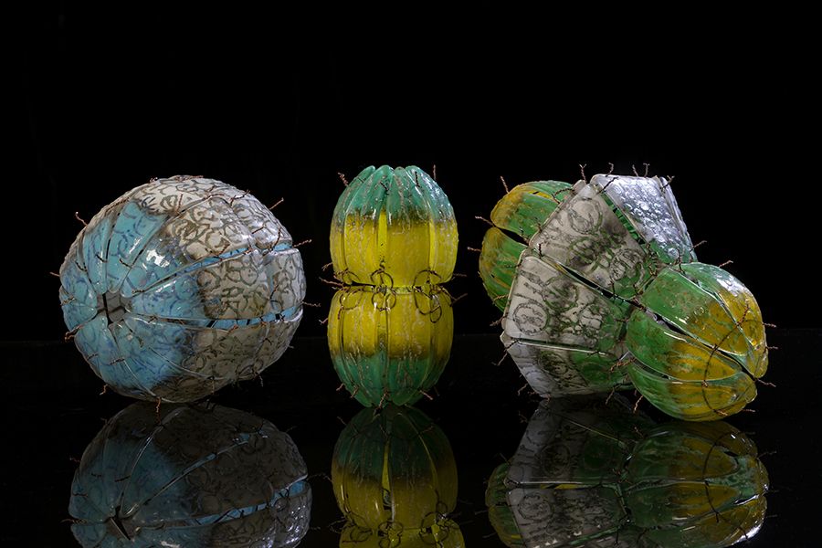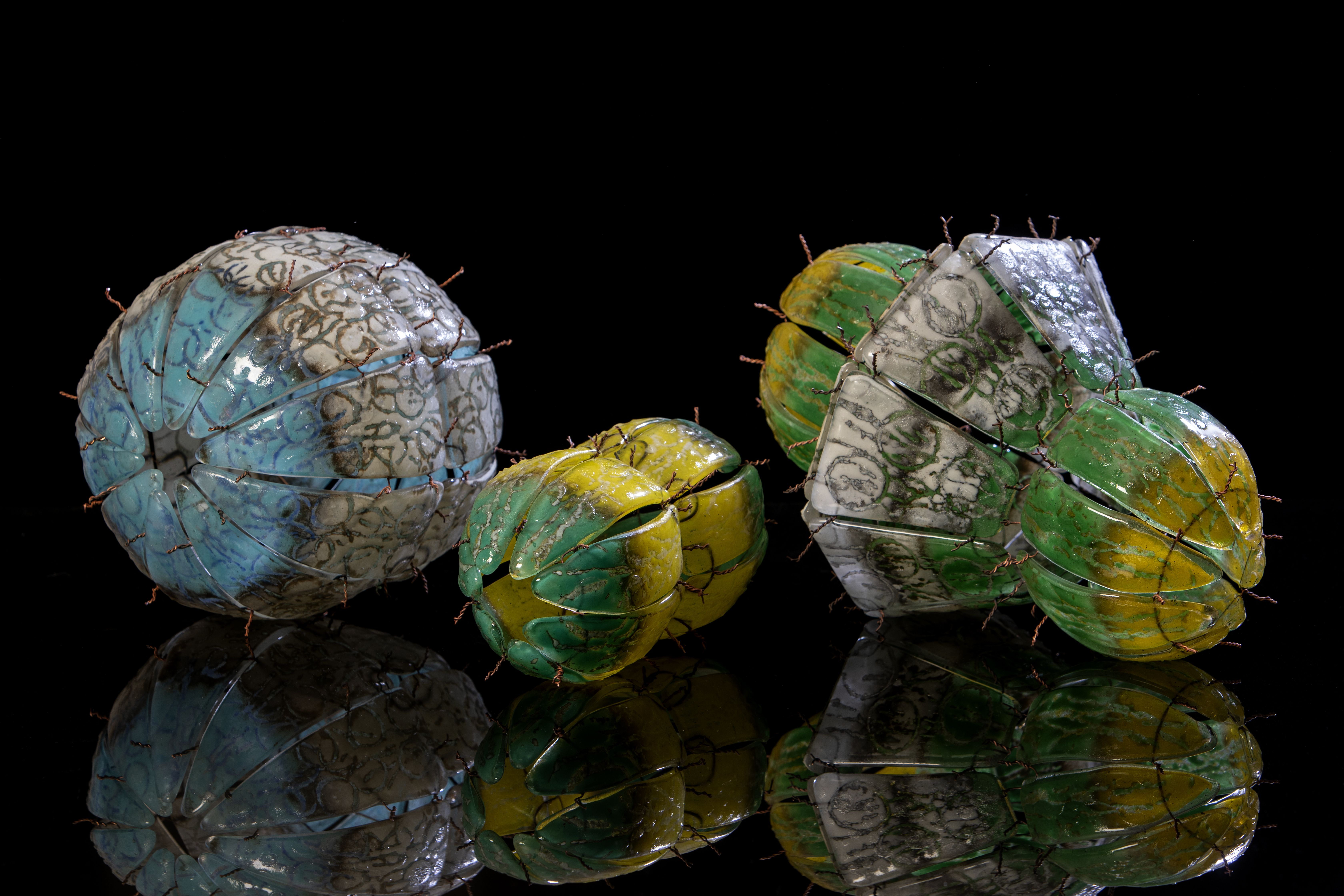 These are made with powdered glass and fused-in copper wire. Each piece is fired up to 6 times to add textures and shape before joining together to make the finished 3D forms.