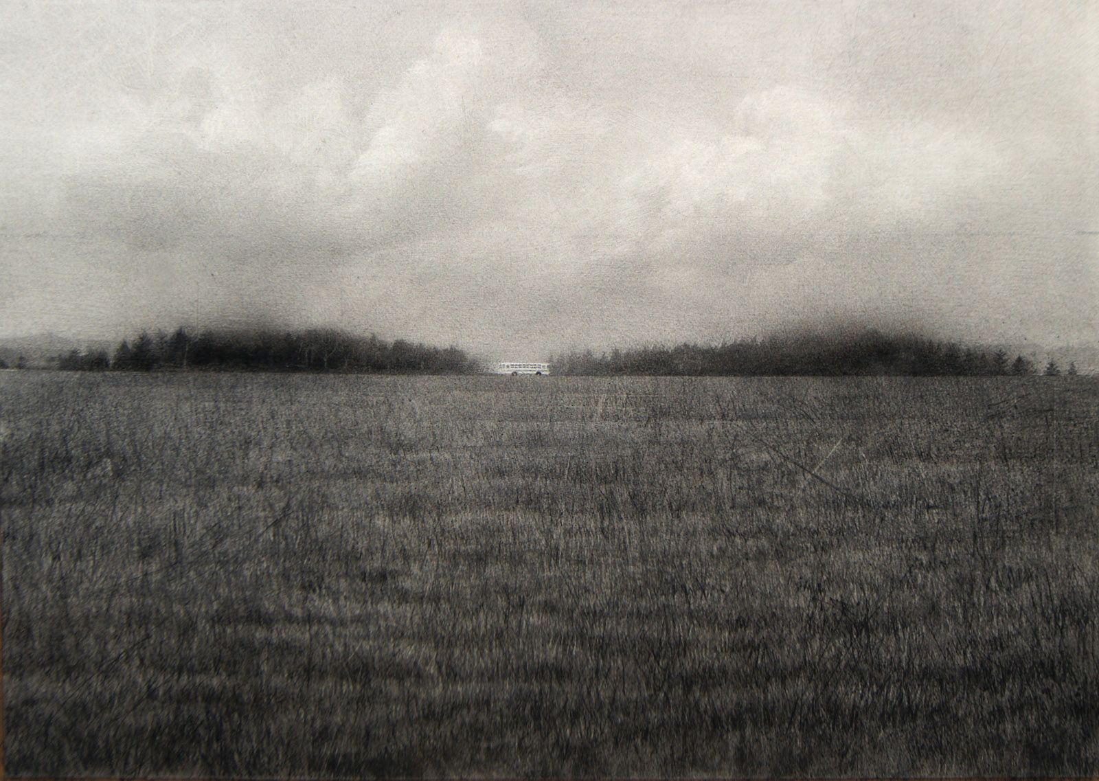 Artwork description: This is one of a series of drawings based on landscapes in Hokkaido, Japan. I was deeply moved by the vast expanse of a glazing pasture beyond which the setting sun was glowing faintly between the two masses of woods. To my eyes, the scene seemed to symbolize a human relationship that was irreparably separated.
