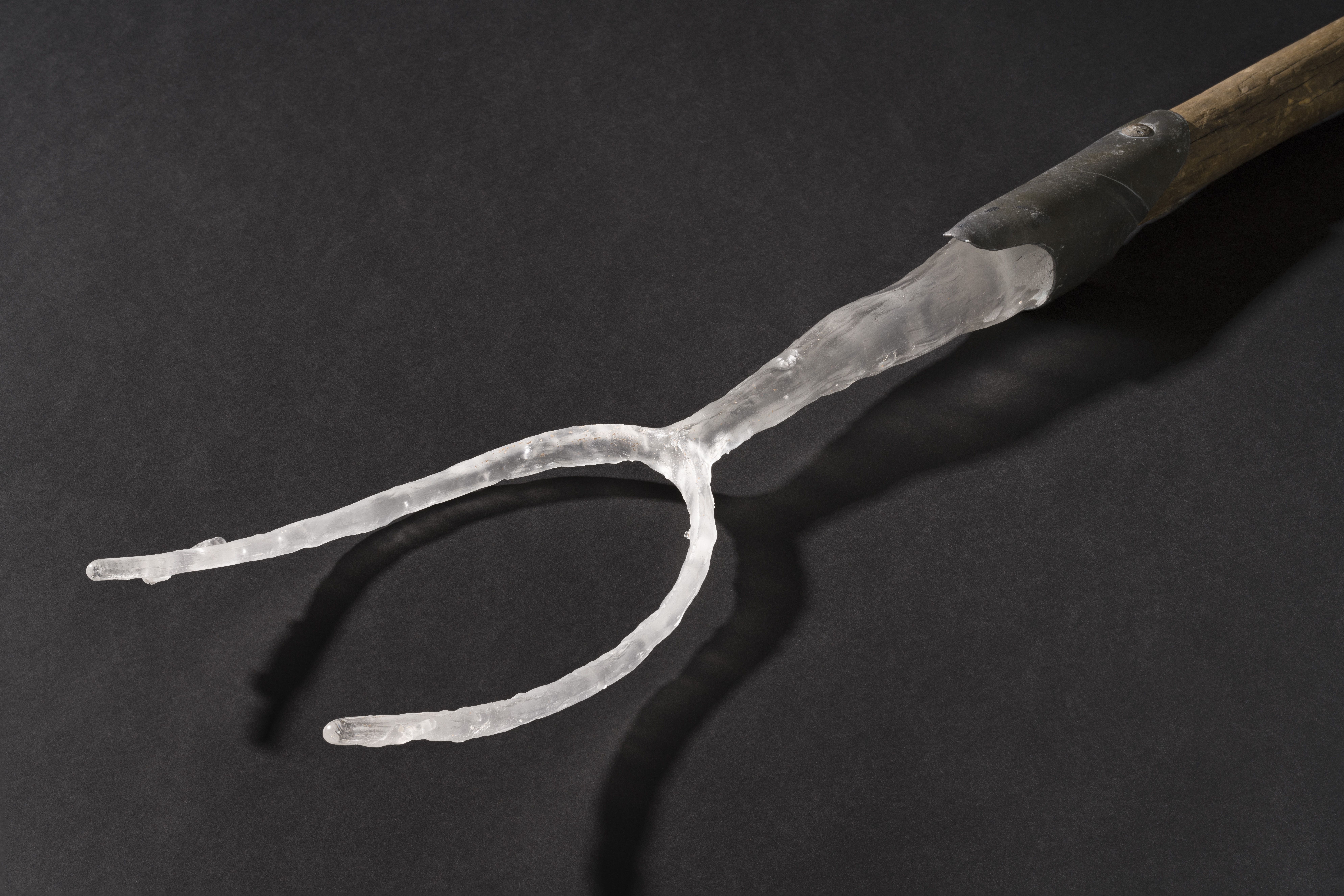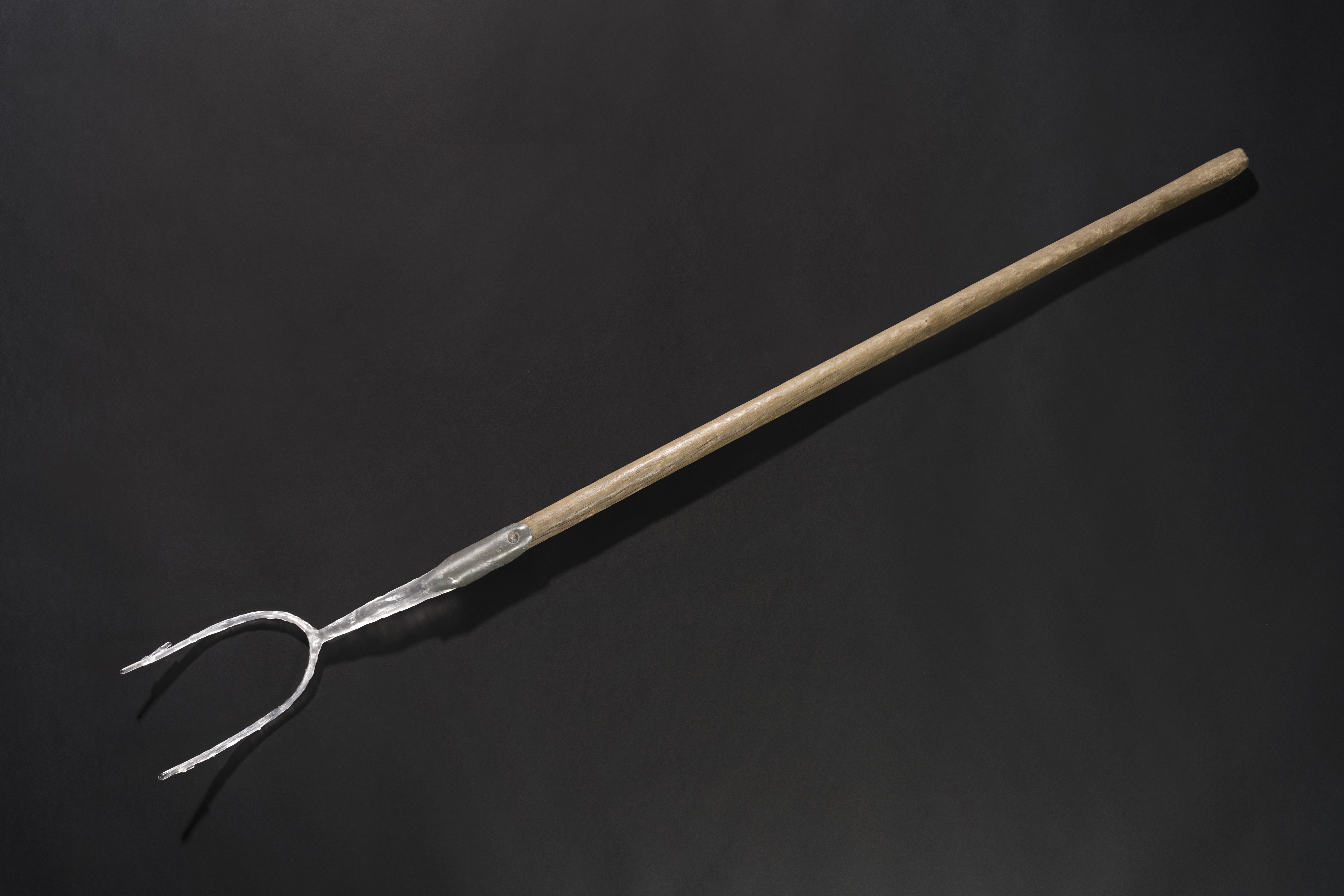 Artwork description: 'Redundant' is part of a body of work focusing on the complex ties that bind us to past generations, traditions and the physical landscape. It is mixed media piece consisting of a hay fork in cast glass, a wooden handle from our family farm, lead and a round head screw. By using glass, I aim to highlight the fragile connections that exist between our personal histories and by extension our cultural heritage. On the other hand, it’s the durability of glass that also illustrates how strongly these connections are felt by those raised on the land. Although this piece may speak of rose tinted by-gone days in a rural idyll, the memories associated with it are of back backing, labour intensive farm work.