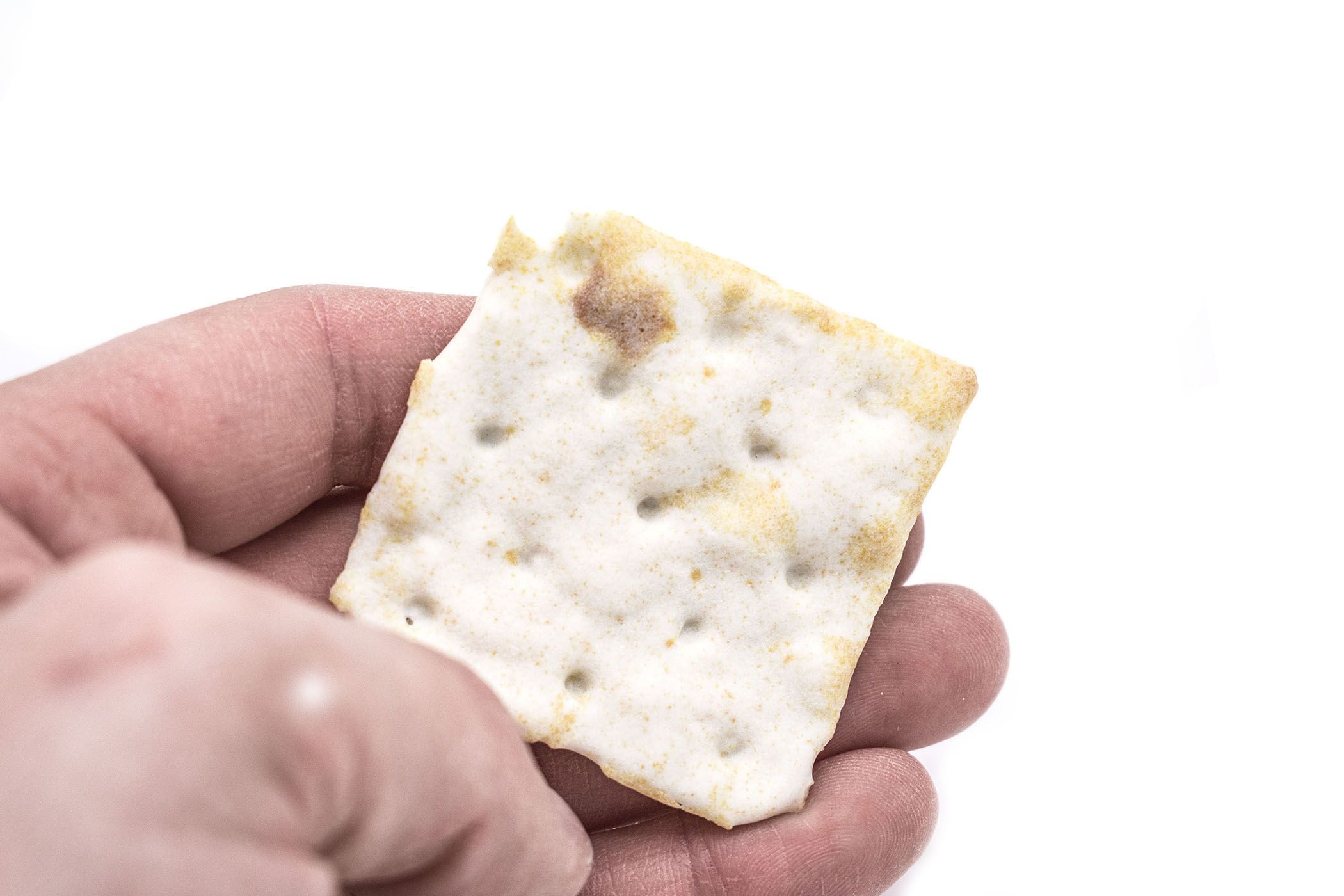 Square, ivory, and brown in color. Same size and texture as Saltine Crackers