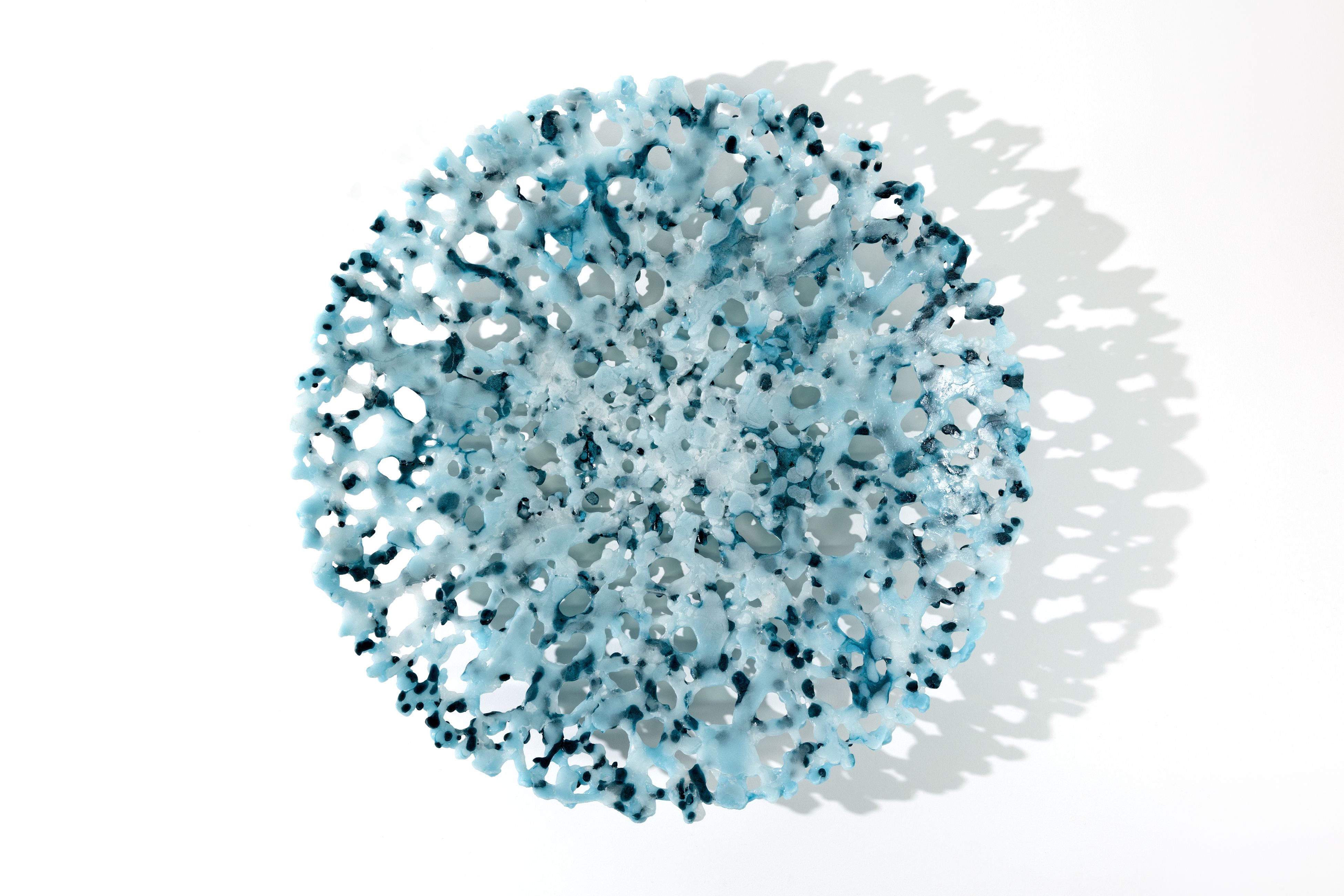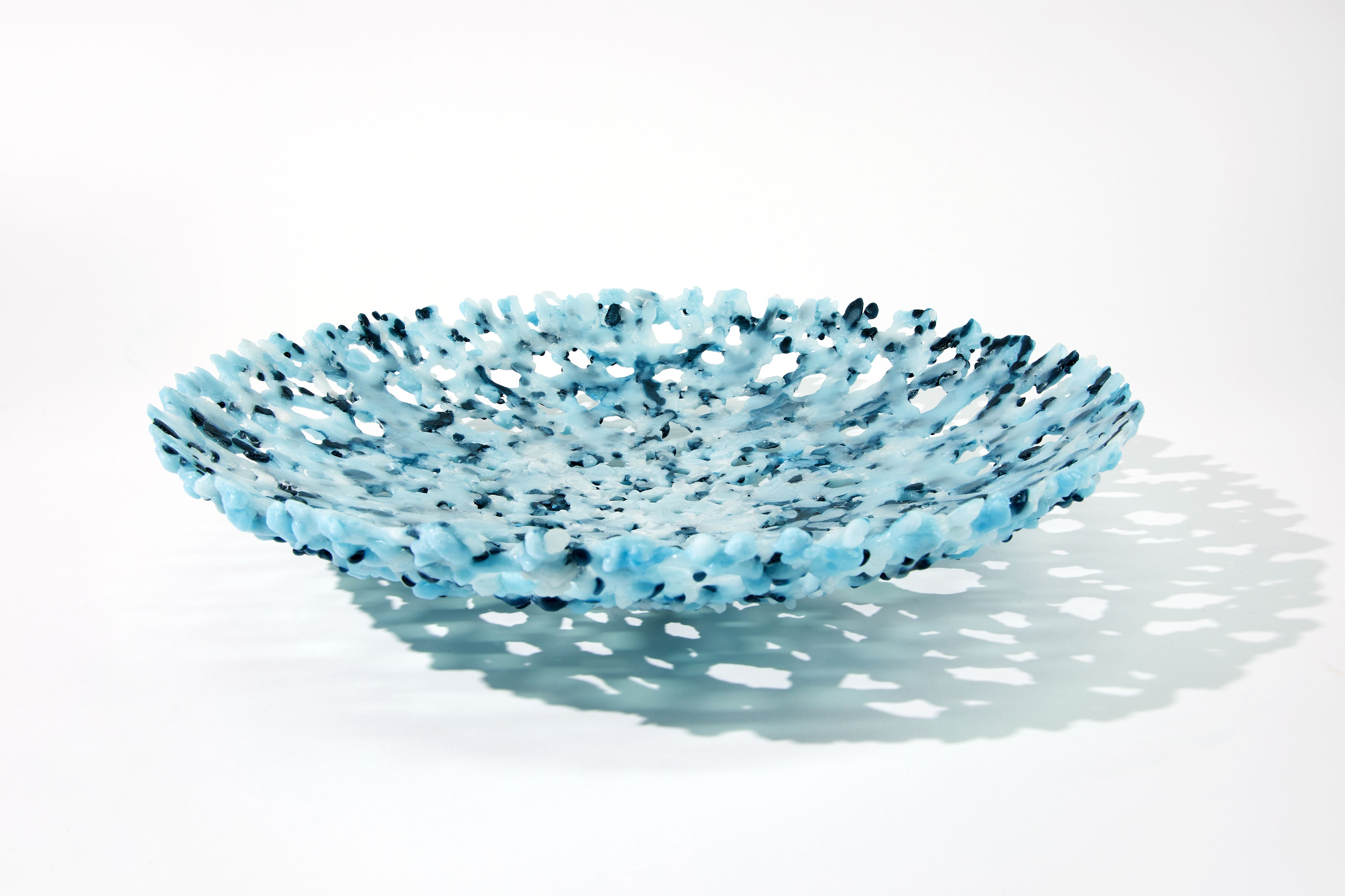 Hyeryeong carefully applies numerous layers of glass frits mixed with different minerals. Each layer overlaps another and melts to form a paradoxical state, of fragile and yet strong. Individual elements are torn, combined, and melted into forms that seem to freeze a moment in time. The minerals reveal the colour hues of the natural world; mossy greens, earthy reds, and pale blues of the sky. The sense of incompleteness and decay in her work reflects the delicate nature of interconnectedness and complexity in time.