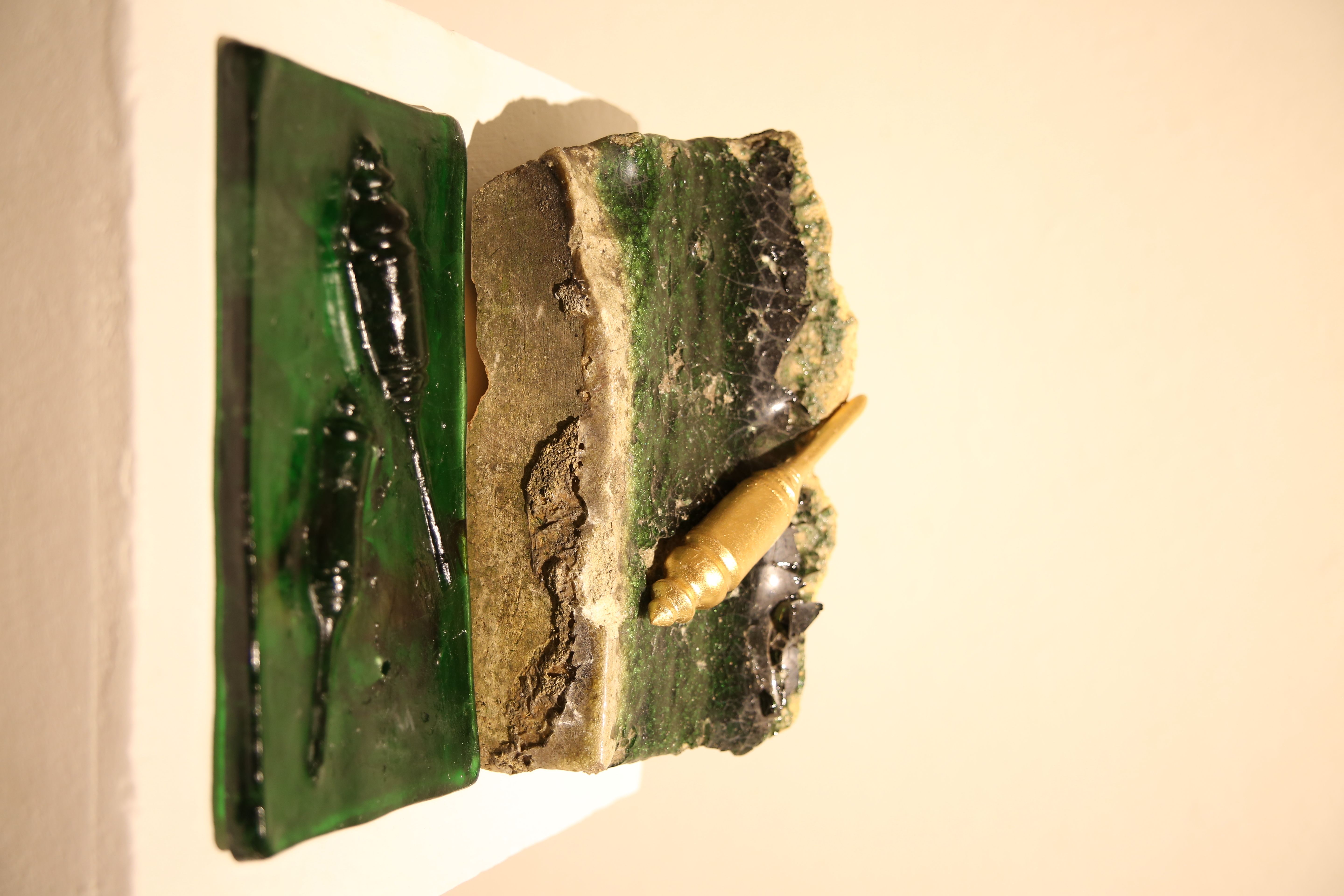 The work also shows a relic of the production line, in the form of a sandstone with glass coating, which completes the work.