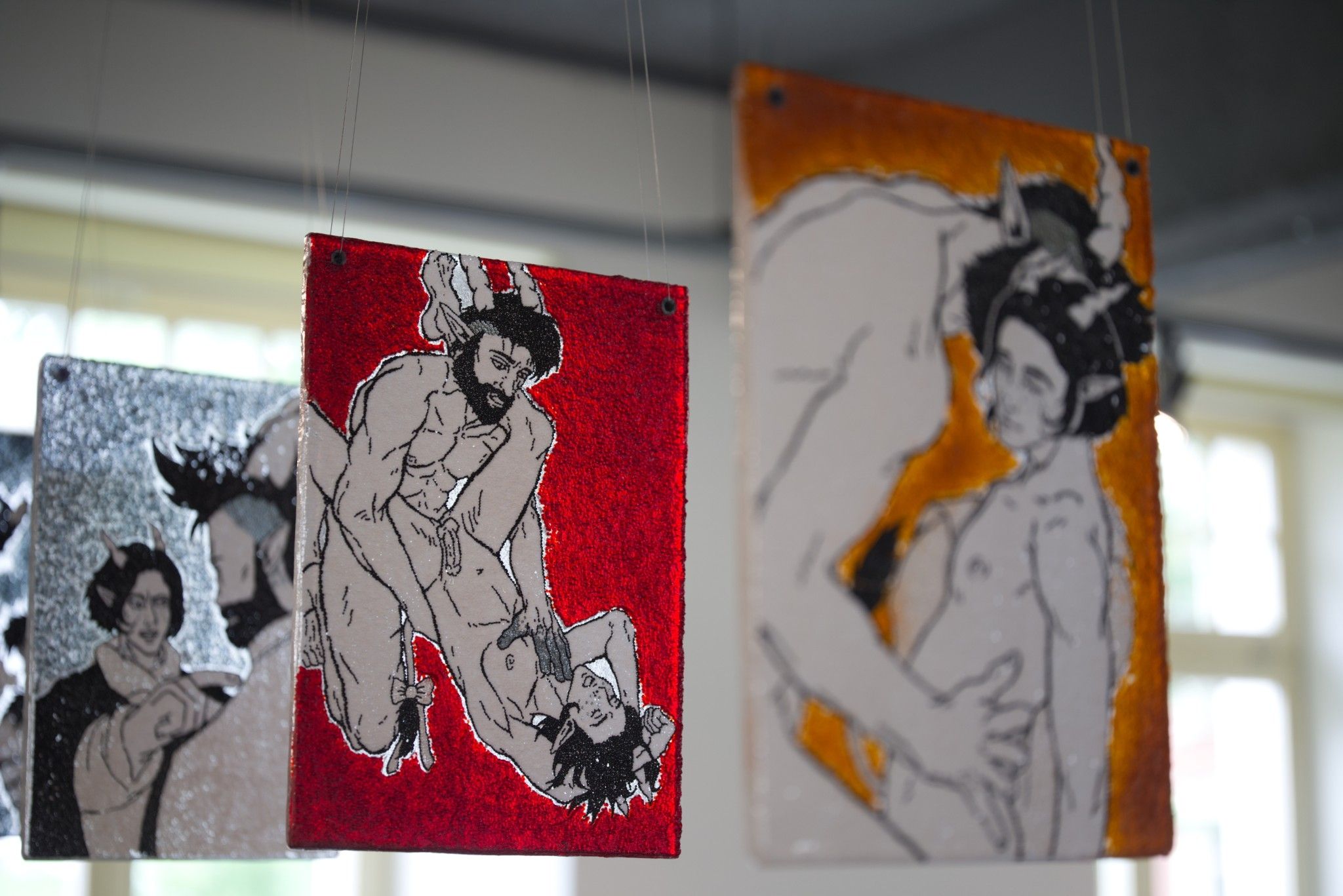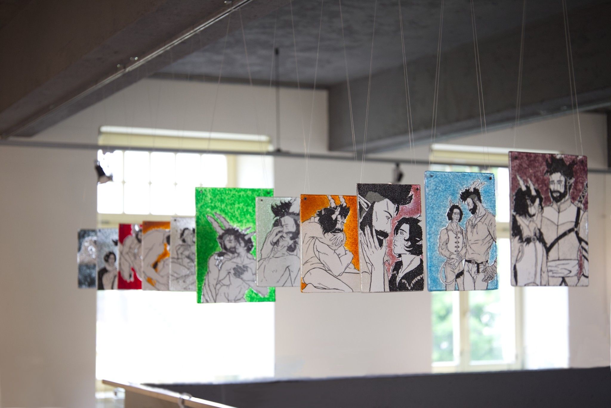 Artwork description: The work of Steel and Needle is a set of eleven glass paintings, graphically retelling the plot of a novel of the same name that I wrote. The images are a tale of love, betrayal and separation between Prince Joddren and Mercenary Hawki. Each scene is composed of a large number of glass beads, and the carefully chosen colors amplify the mood and emotions hidden in the content. The gradation of colors from darkest to green depicts the building of a relationship and the subsequent cooling of feelings, which leads to the separation of actors due to obligations.
