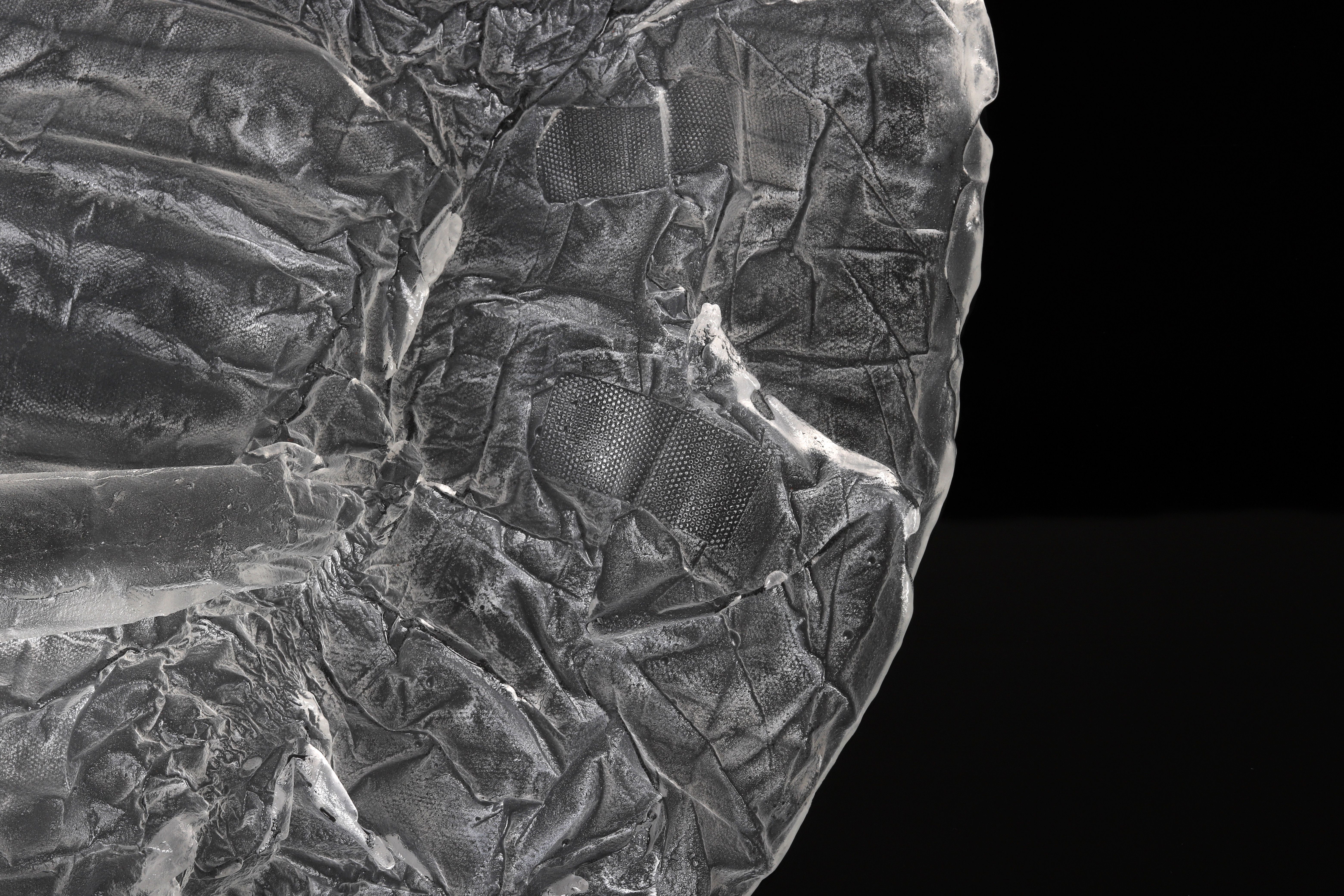 Artwork description: The installation of two glass objects is my attempt to describe the perception of the present and the non-present. I have been exploring the intensity of experiencing moments in the present, especially when contrasted with the non-present state of those same moments. The difference between these two dimensions, as well as their similarities and mutual relationship, were the main inspiration for my work. The observed repetitiveness of both states, with a tendency toward subtle transformation, I metaphorically represented through a baby diaper and an adult diaper.
