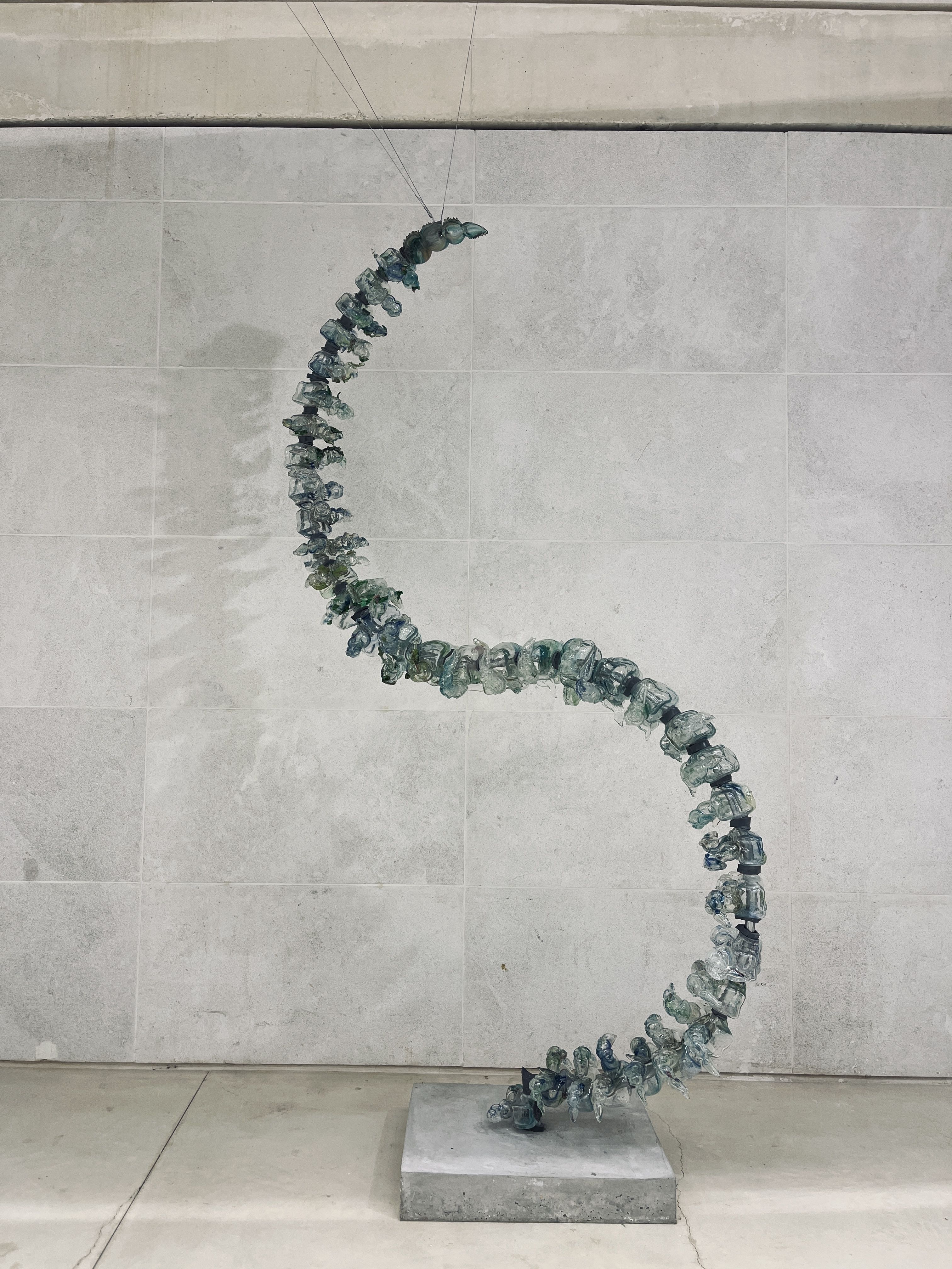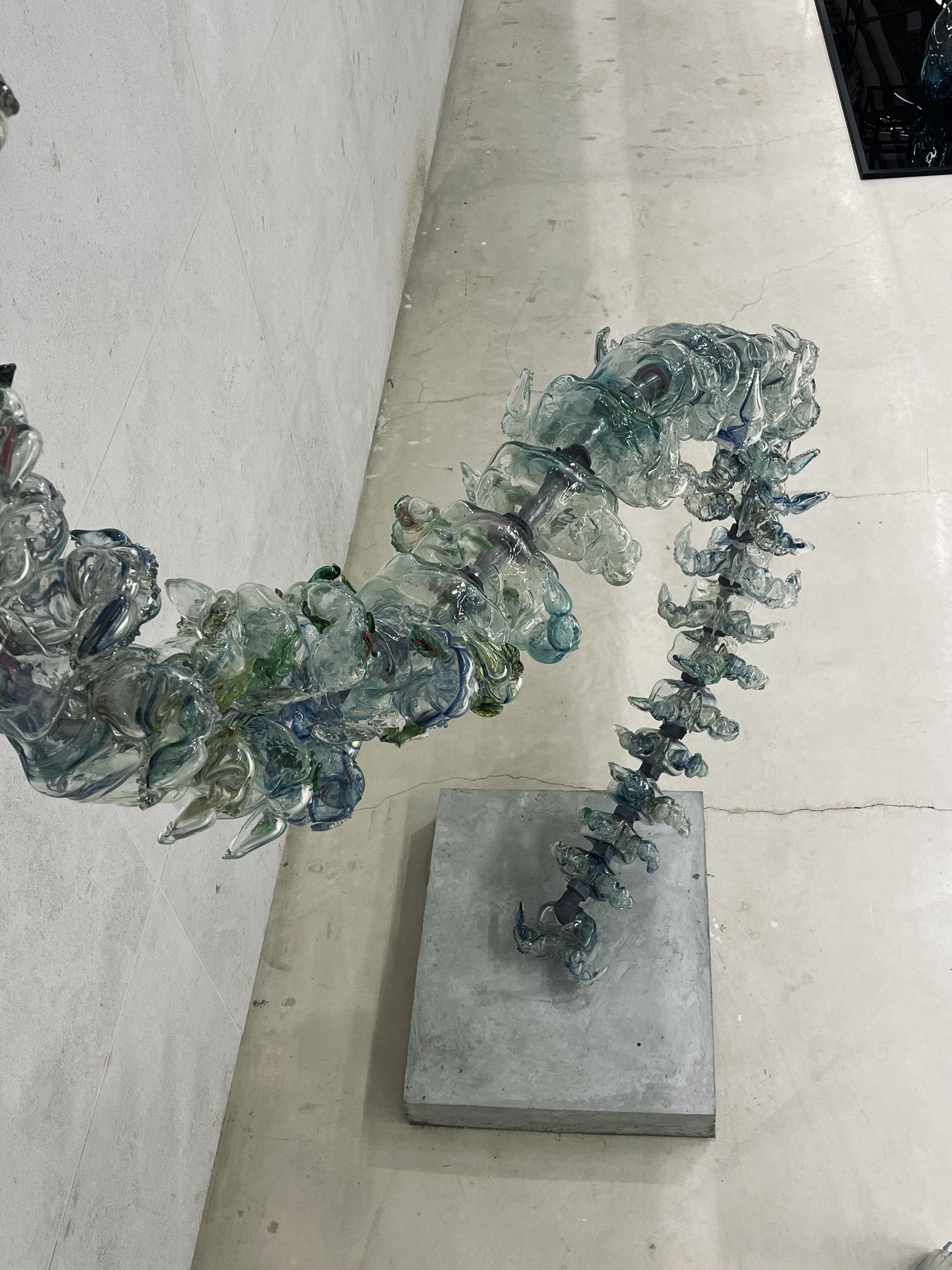 Artwork description: The artwork is a four-meter-long glass sculpture composed of 36 blown and sculpted glass vertebrae and a single tail piece, creating a total of 37 elements. The work was created through hot-shop glassblowing, freehand sculpting, and mold-blowing techniques, combining precise craftsmanship with the organic flow of molten glass.