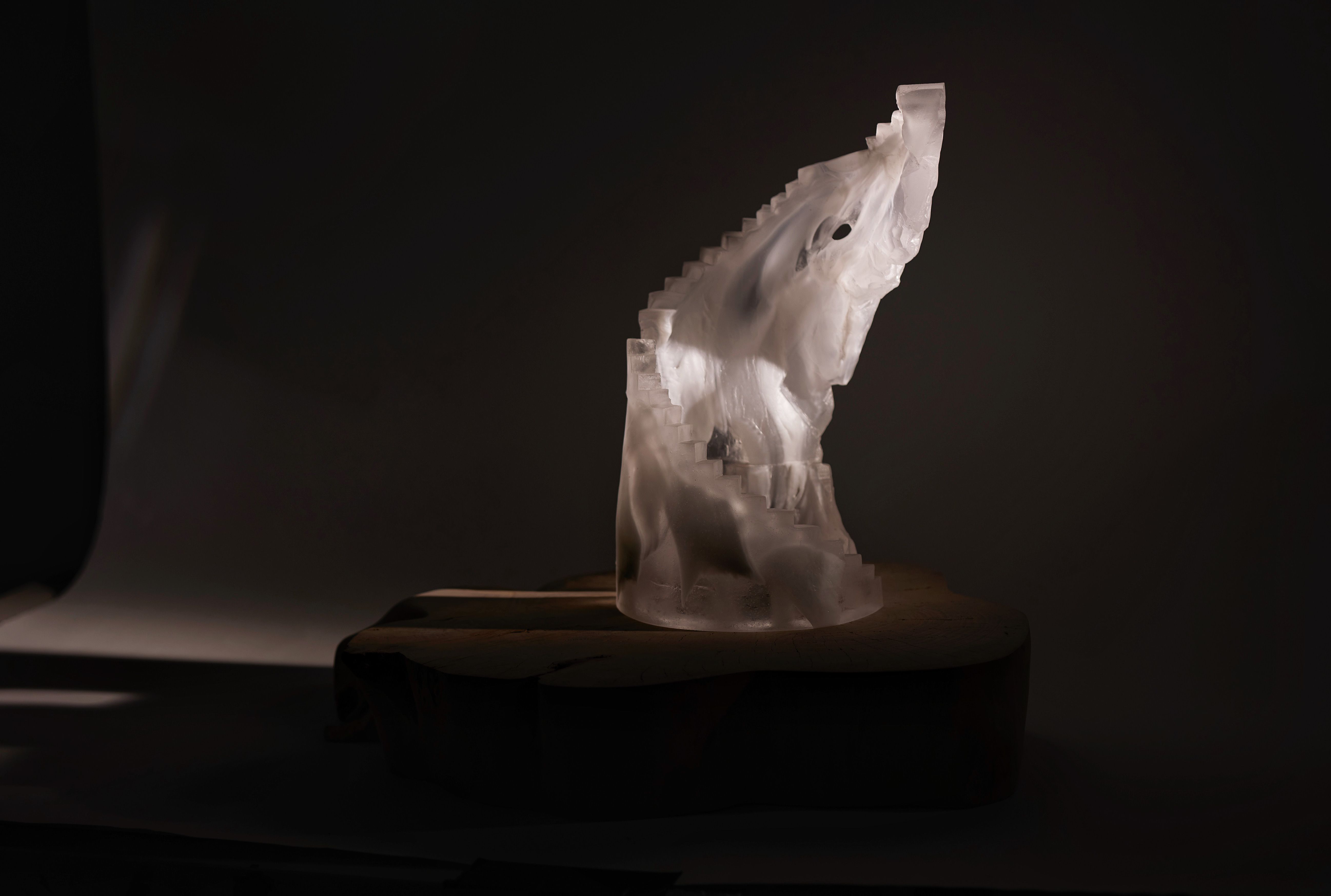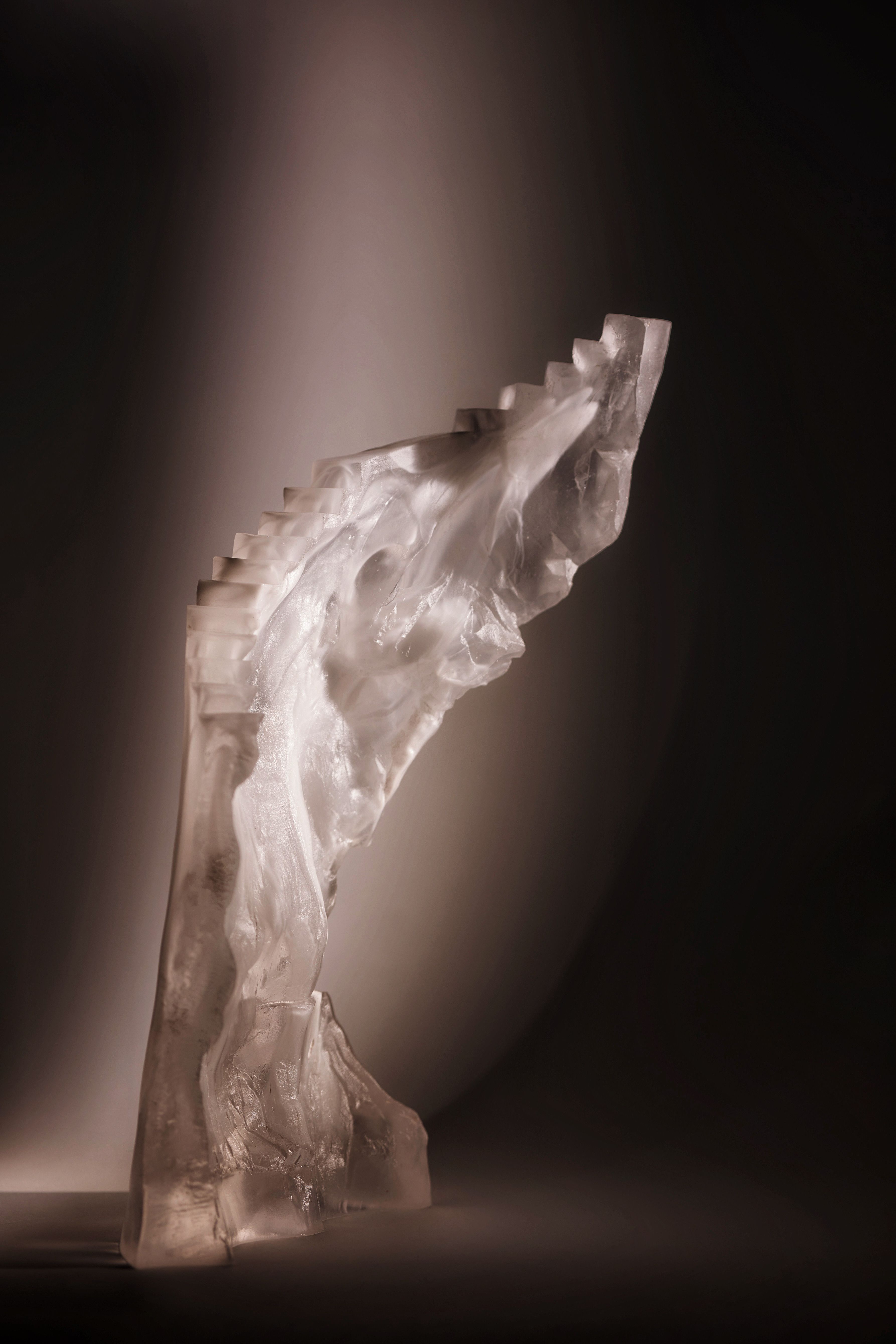 Artwork description: A spiral staircase of transparent glass, veined with flowing opal. Its architectural exterior contrasts with rough contours, harsh steps softened by translucence.