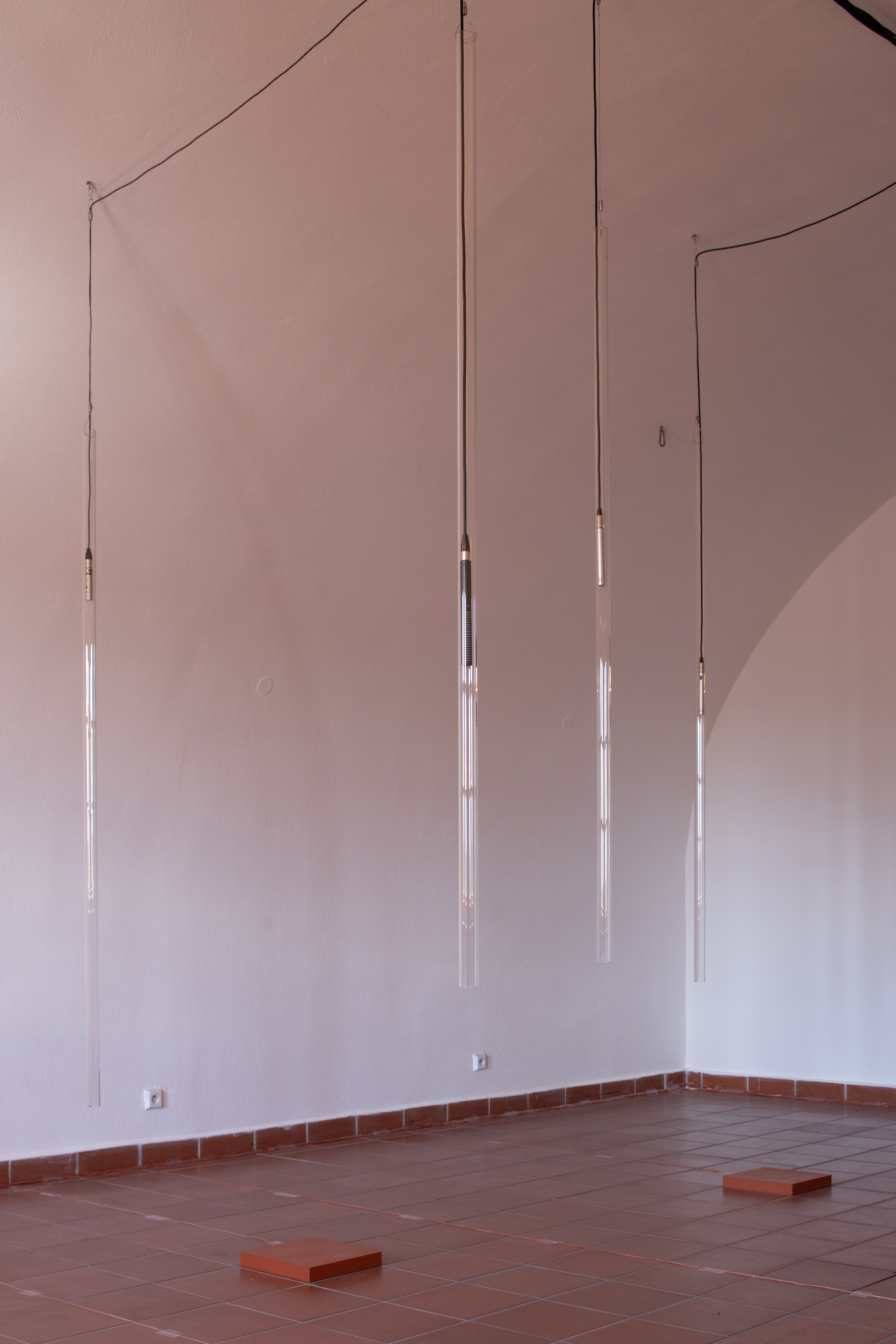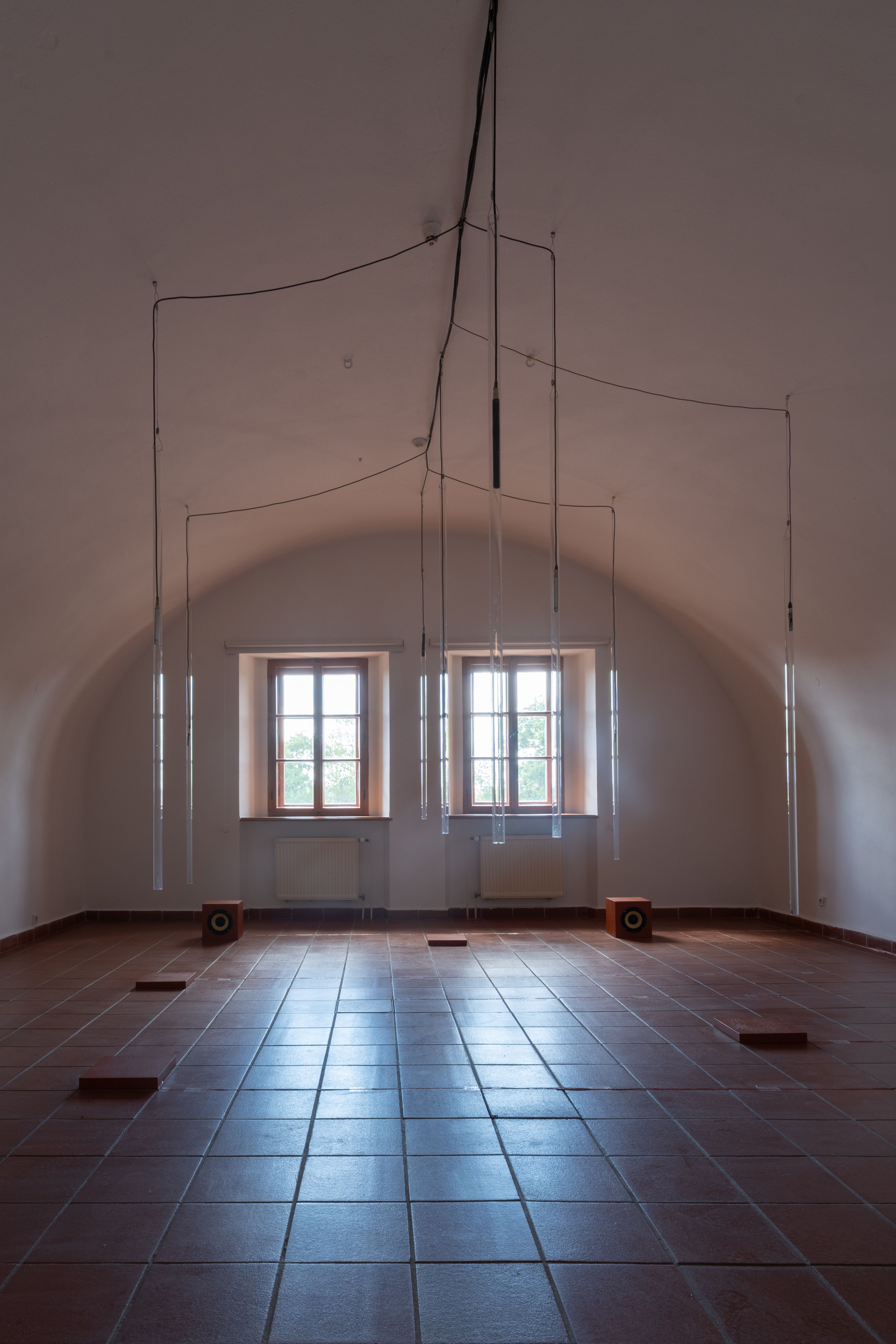 Artwork description: This site-specific sound installation using glass tubes as acoustic feedback resonators. A directional microphone is placed in each tube, which, in conjunction with a speaker, creates dynamic and unstable feedback loops that respond to the acoustics of the space as well as the movement and interaction of the viewer. The audience is not just a passive listener, but their presence, movement and bodily interaction directly influences the character and evolution of the sound. The installation explores the relationship between perception and action, listening and physicality. The result is a transformative experience, shaped not only by spatial characteristics but also by the individual approach of each viewer, who becomes an active participant in the sound architecture. (For display purposes, the number of tubes varies depending on the available space. For example, only two may be used.)