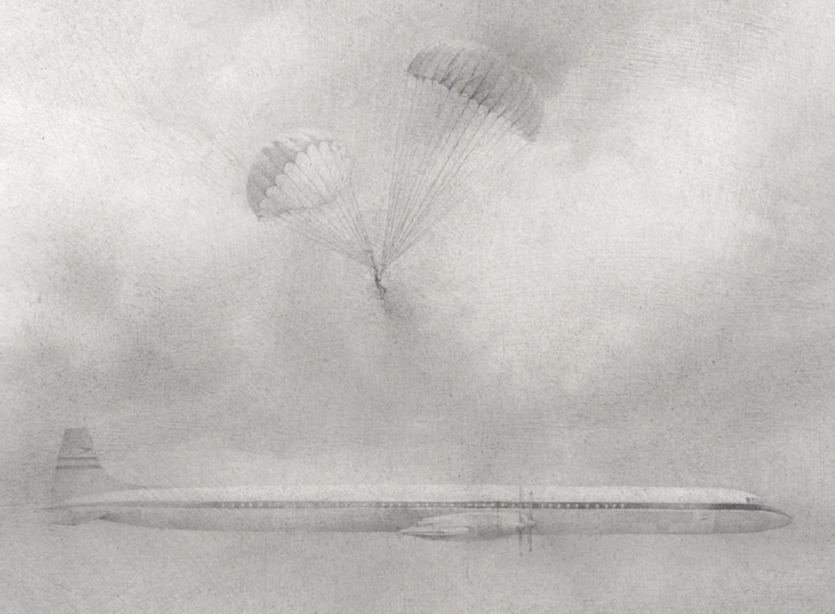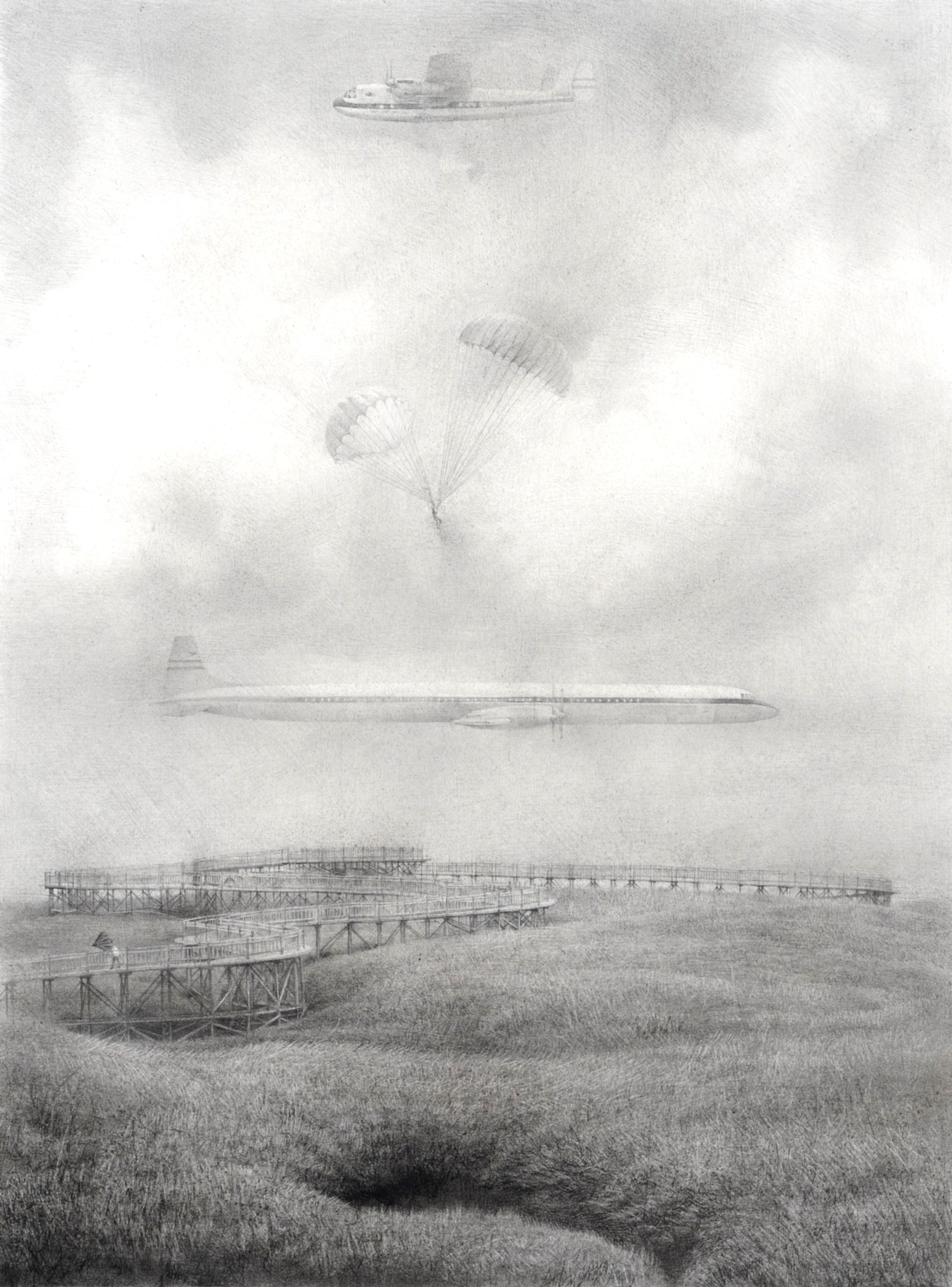Artwork description: I spent three months in the northernmost region of Hokkaido in Japan. While I was standing on a wooden corridor installed on a windy hill, my mind seemed to shoot up to the sky. Three objects in the air denote the emotions I had during that period.