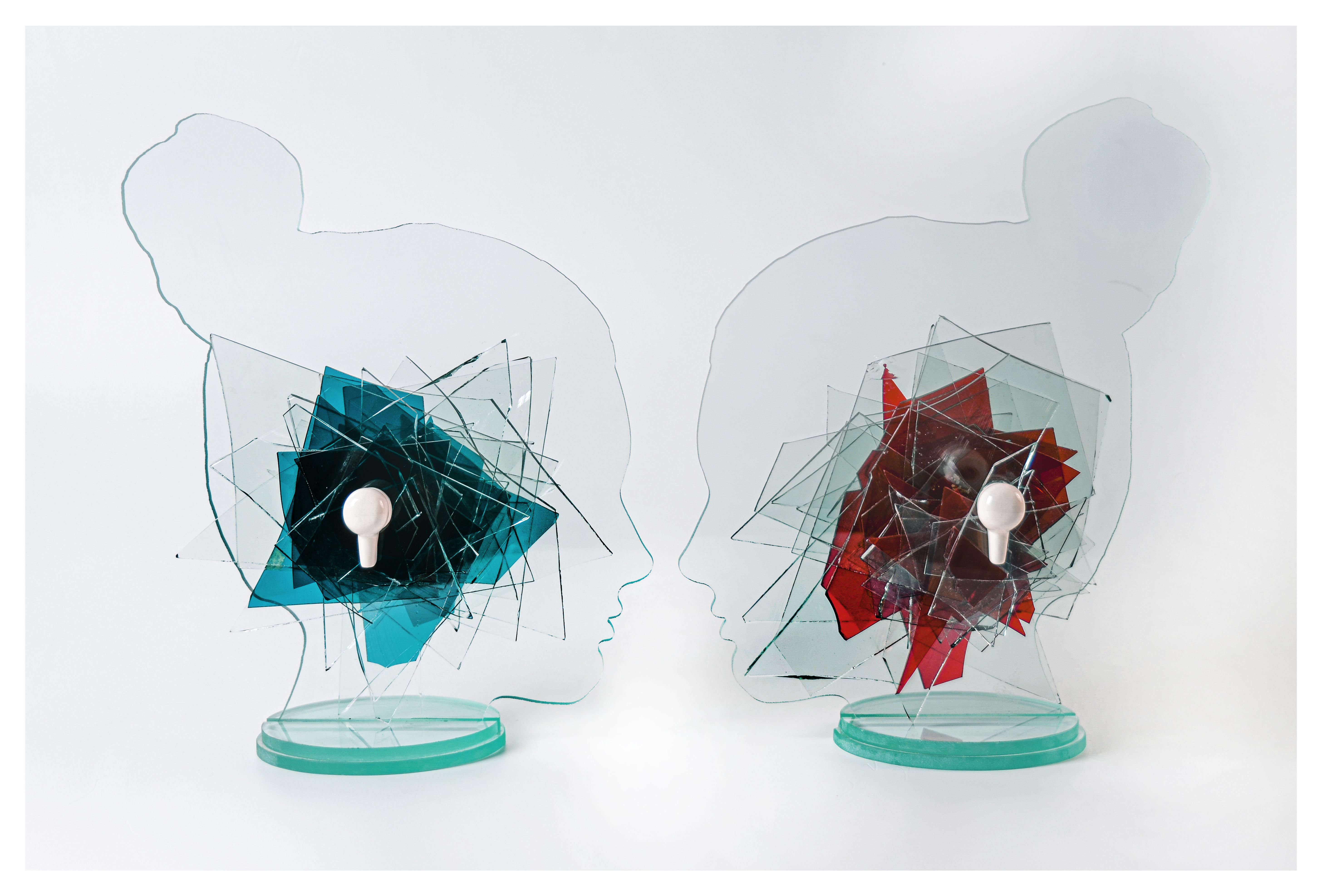 Artwork description: 1: "The work consists of two self-portraits made from flat glass, with broken transparent and colored pieces at ear level to represent sound waves passing through human consciousness. The contrast between warm and cool colours represents different musical genres, while the irregular glass fragments reflect various influences."