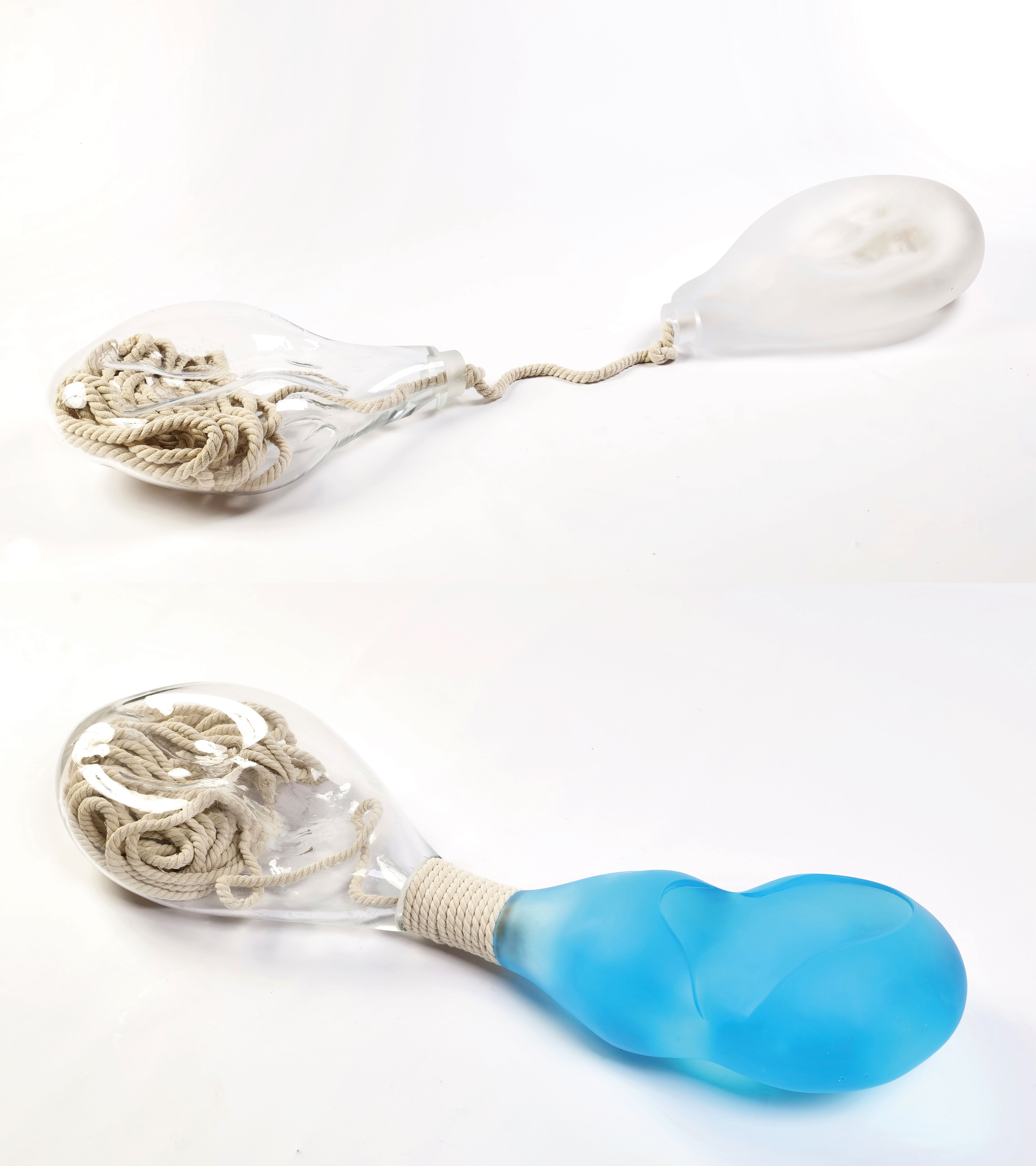 Artwork description: The piece reflects my ideas about the differences and contrasts between individuals through the glass and is inspired by my thoughts about my relationship with my twin sister. The work is blown in a way in which the mold – the torso – is constantly approached while the glass bulb expands. Glass is fragile but also strong. Does the proximity in space, time, and distance represent the actual closeness of human relationships? Is the relationship strong or fragile, or neither? People may be connected by invisible "ropes" or bonds, which prompted the author to consider the connections between "genes," "family affection," and "relationship" while simultaneously presenting the same issues to the audience.
