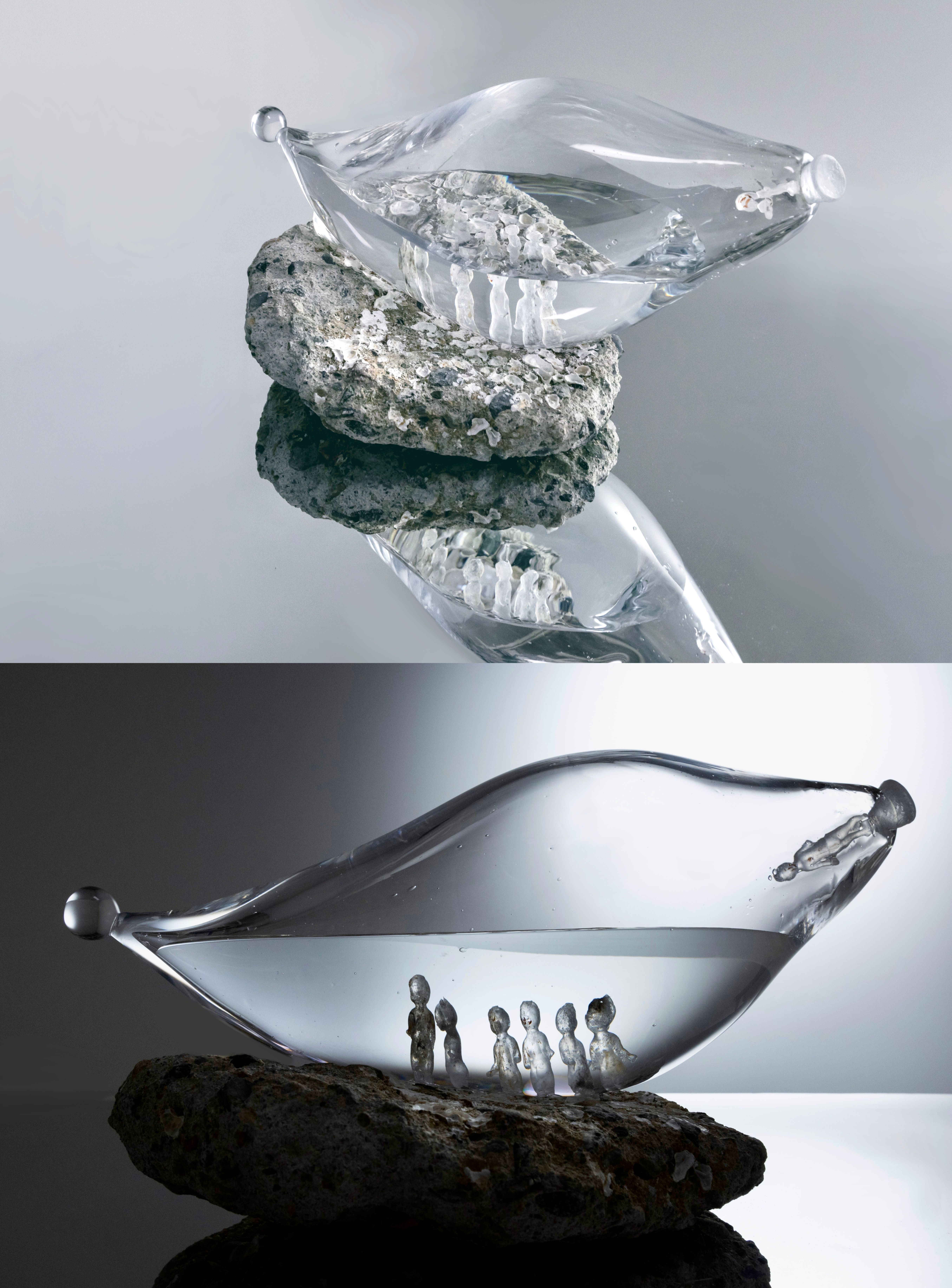 The form is inspired by a weaving shuttle, a symbol for the relentless passage of time. Inside the vessel, small figures sink into water, becoming voiceless. This physical act of sinking reflects the profound, metaphorical silence of my internal world. Through this work, I explore the tension between a physical descent and the silent state it evokes, revealing the fragile nature of our inner selves.