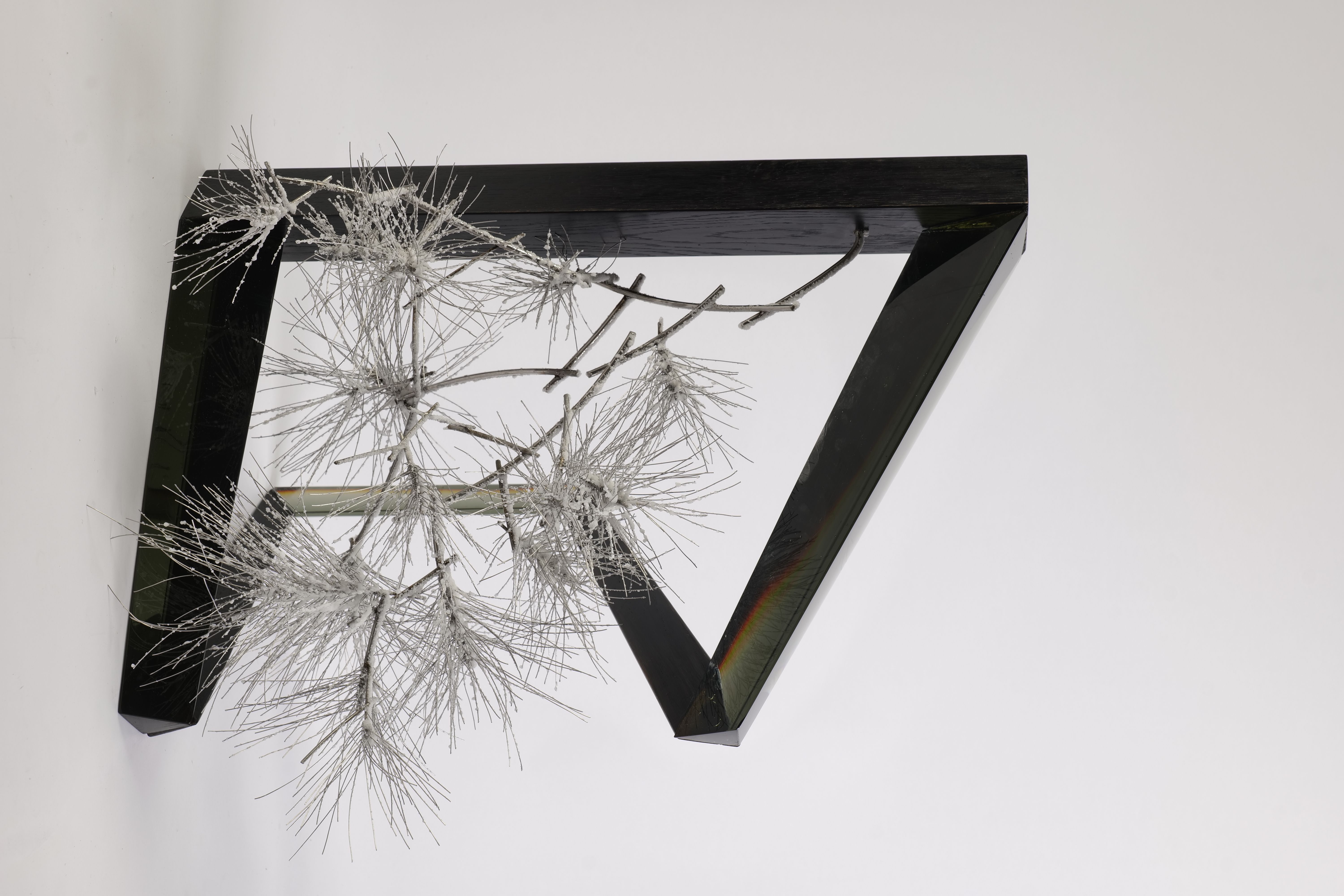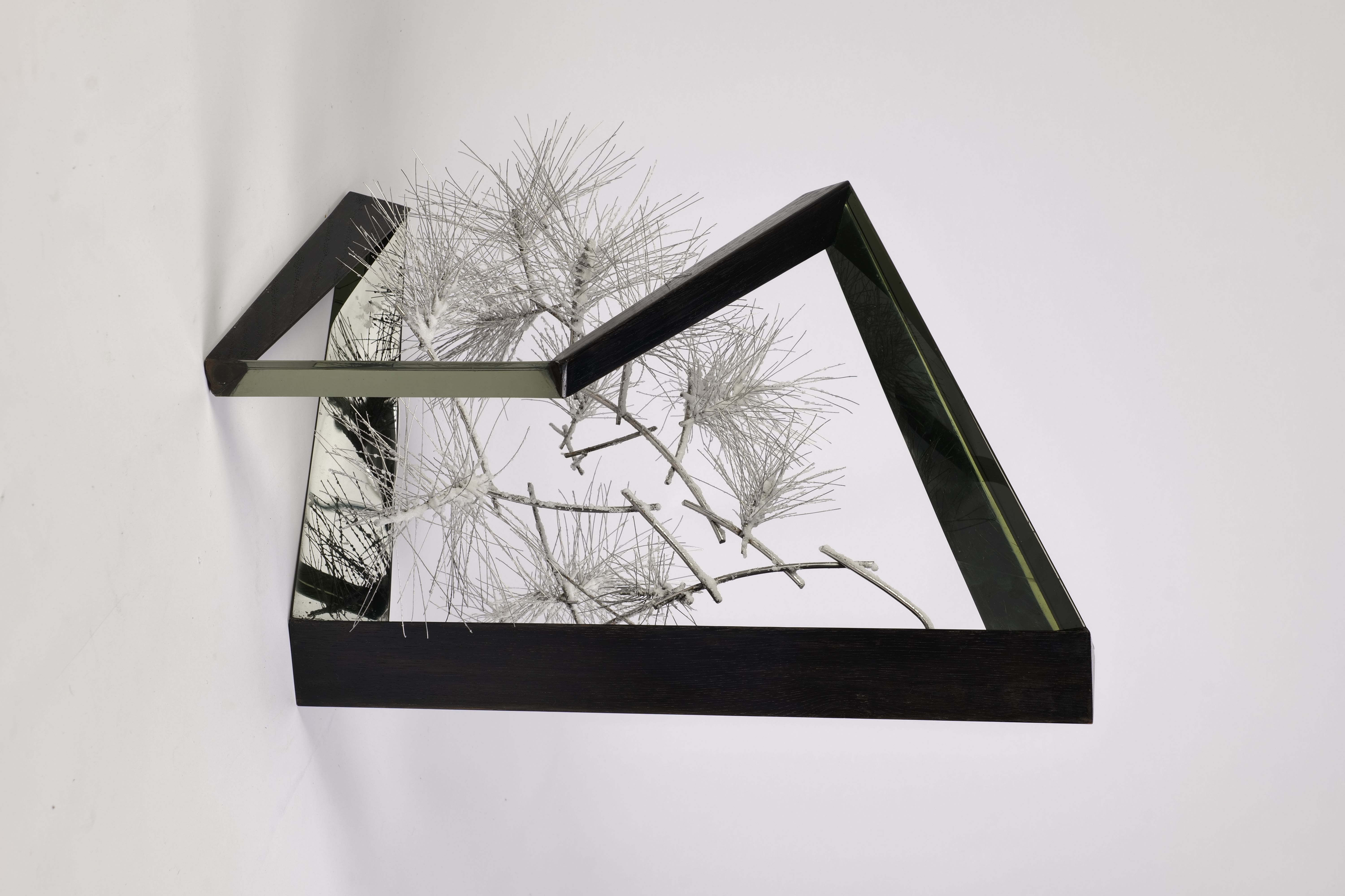 Artwork description: This work combines glass craftsmanship with the traditional Chinese garden's leaky scenery creation method, using three materials: solid wood, stainless steel, and glass to construct a highly distinctive spatial structural form. After the heavy snow, the scenery of distant trees and white mountains creates a cold and quiet atmosphere. By comparing the viewing methods and materials, the focal perspective of the window frame is formed with the scattered perspective of the pine branches, the toughness of wood and the hardness of glass, expressing both opposition and harmony, reflecting the cultural concept that all things in the world are interdependent.