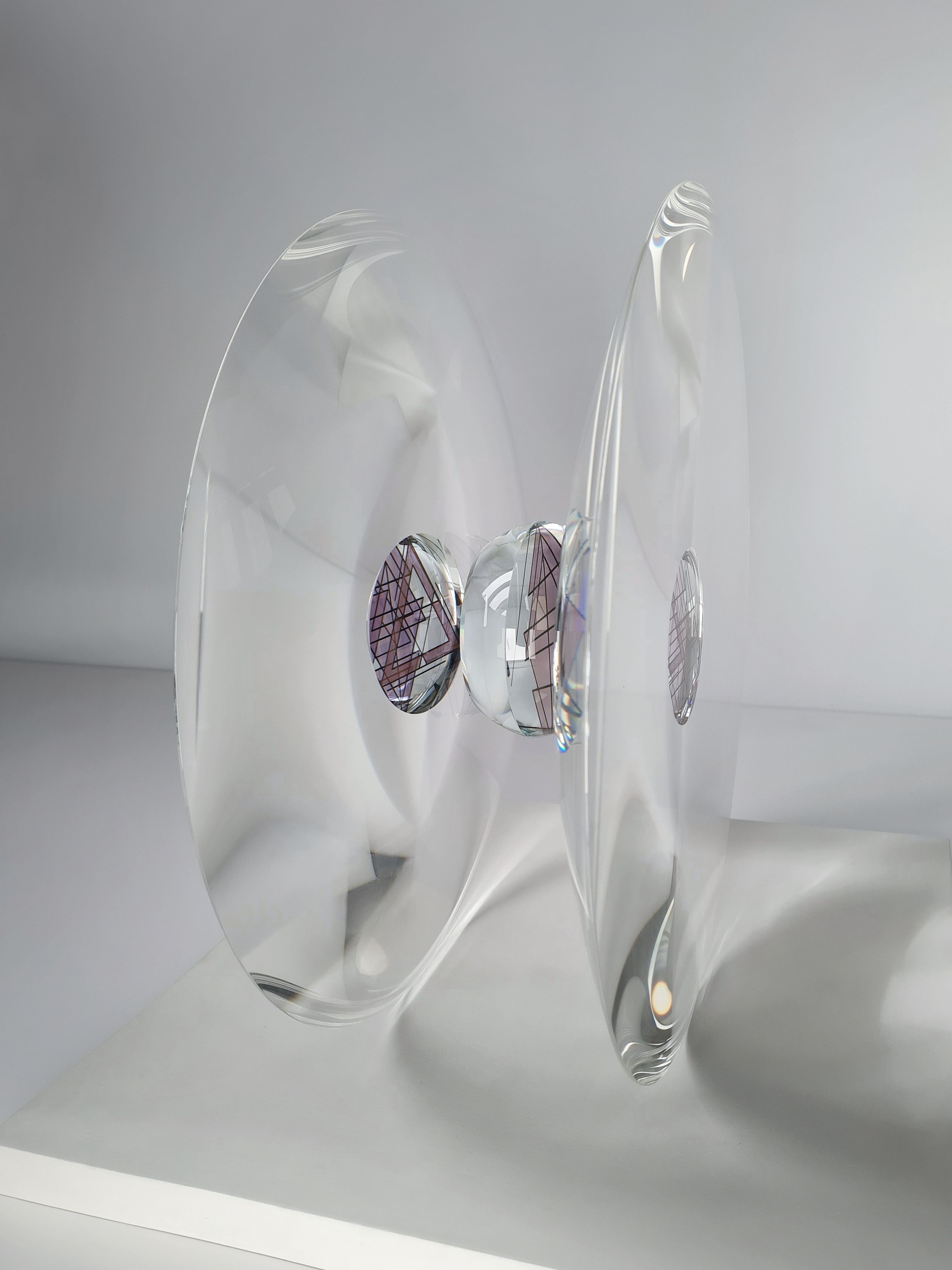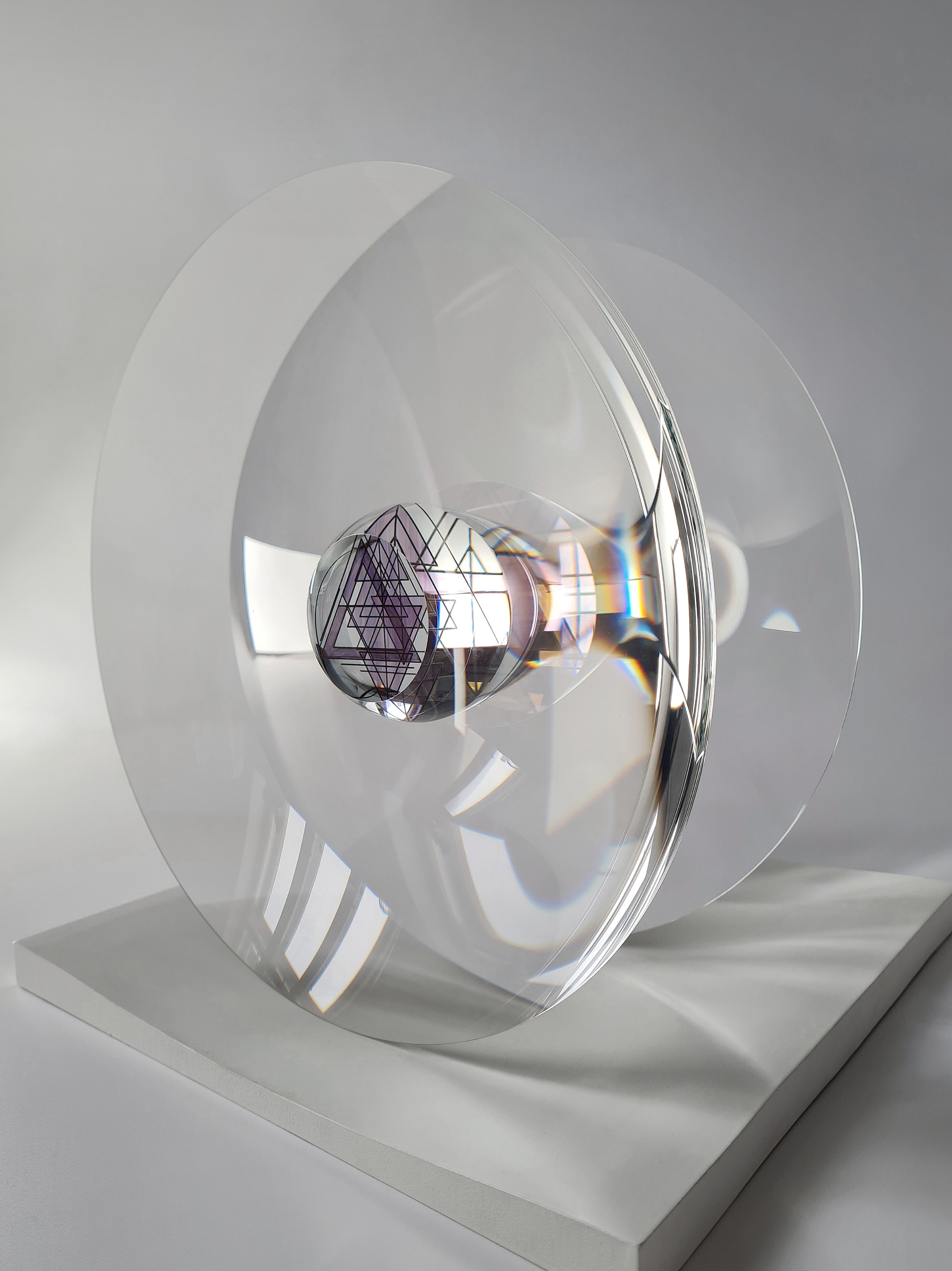 I focus on the symbiosis of material and technique. I use optical glass to enhance the core, which seems to float in the glass composition. The centre is static but in symbiosis with it there are ground lenses in which the surrounding space is reflected, magnified and distorted. The basic geometric shapes used in the object are the cut-outs of the sphere, which have no beginning or the end.